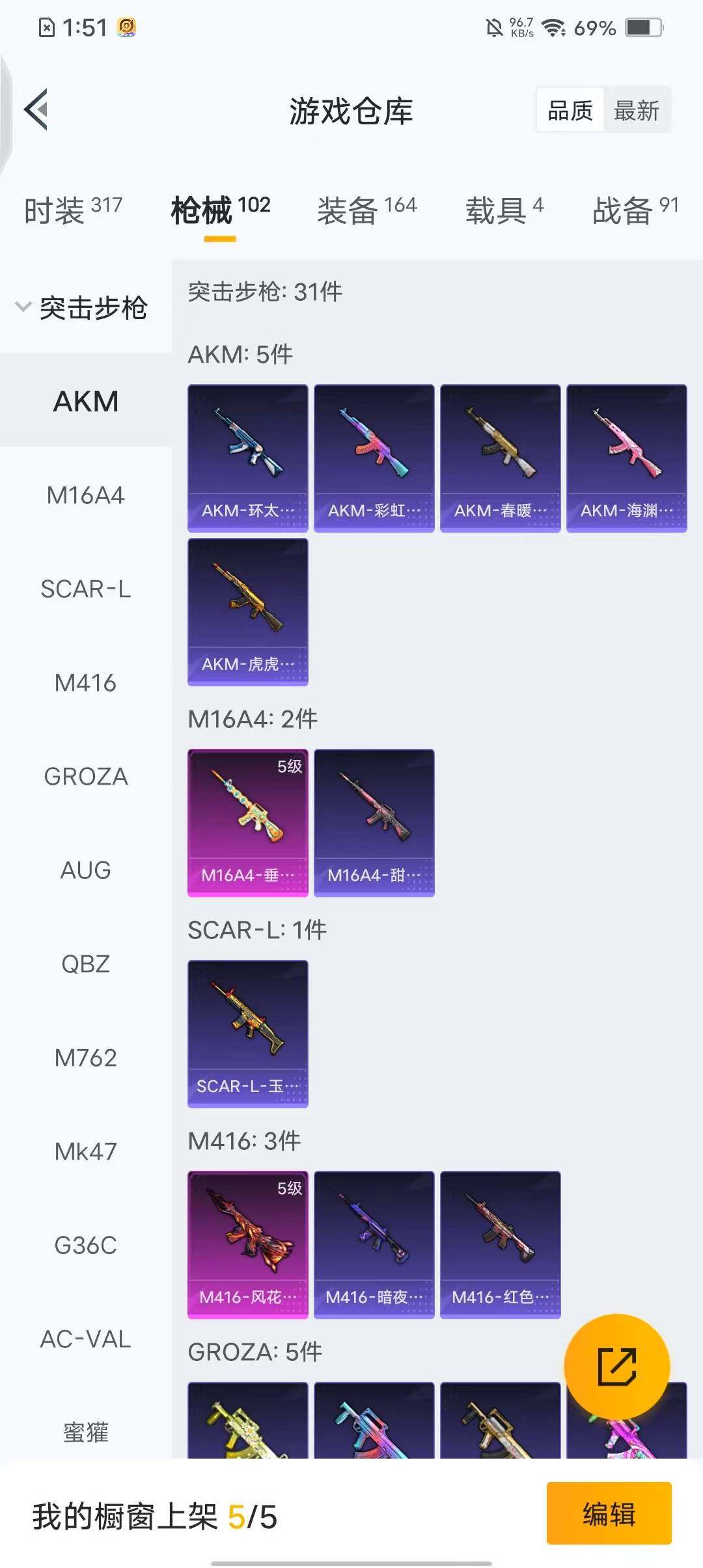 【特效枪等级】:M16A4-垂柳戏鸭(五级),M416-风花雪月(五级),Vector-环太平洋(五级),MG3-洛