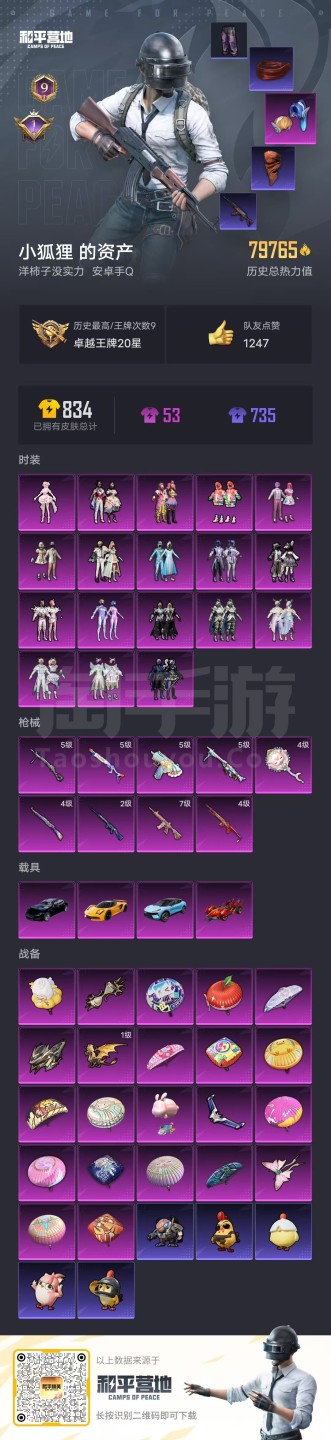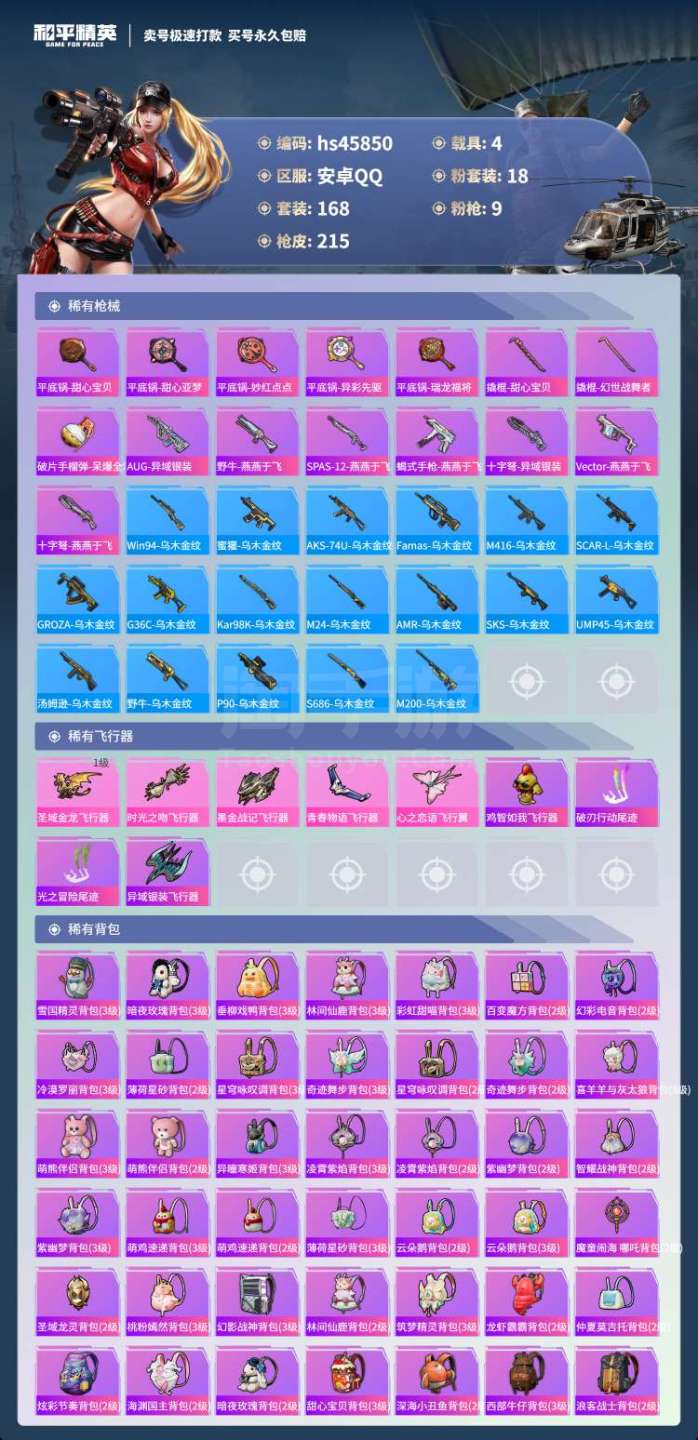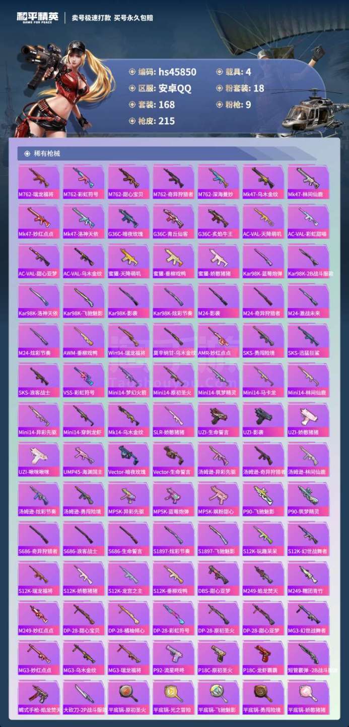 hs45850 安卓手Q-9王牌印记-18粉装-9特效枪-4载具-79765热力值-168套装-21