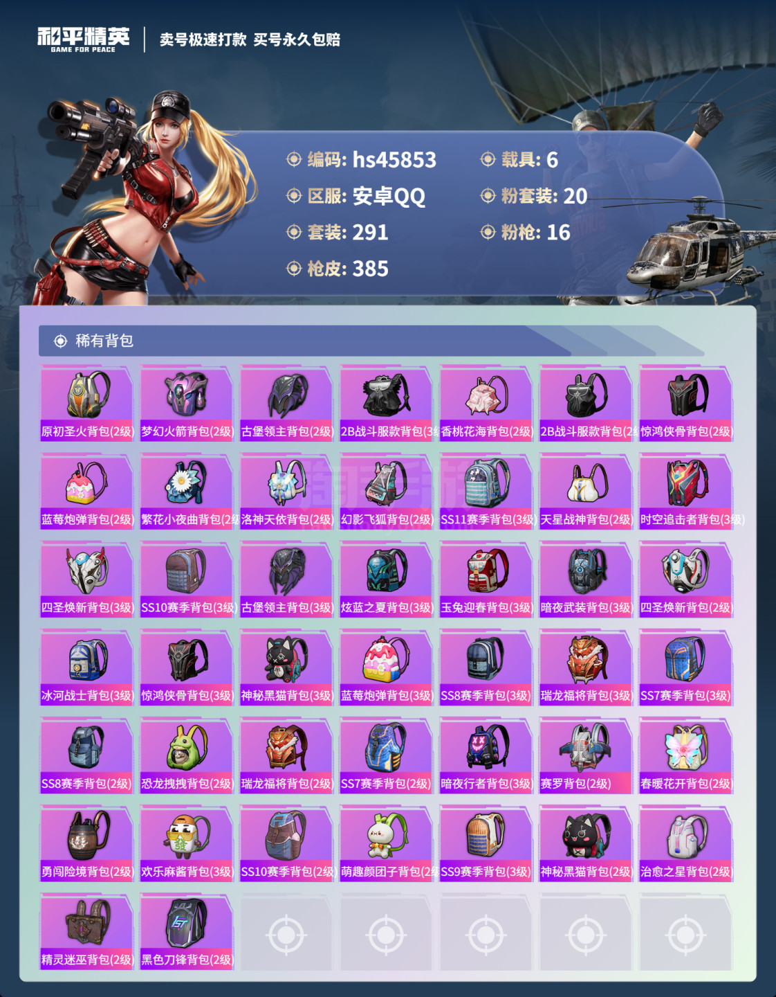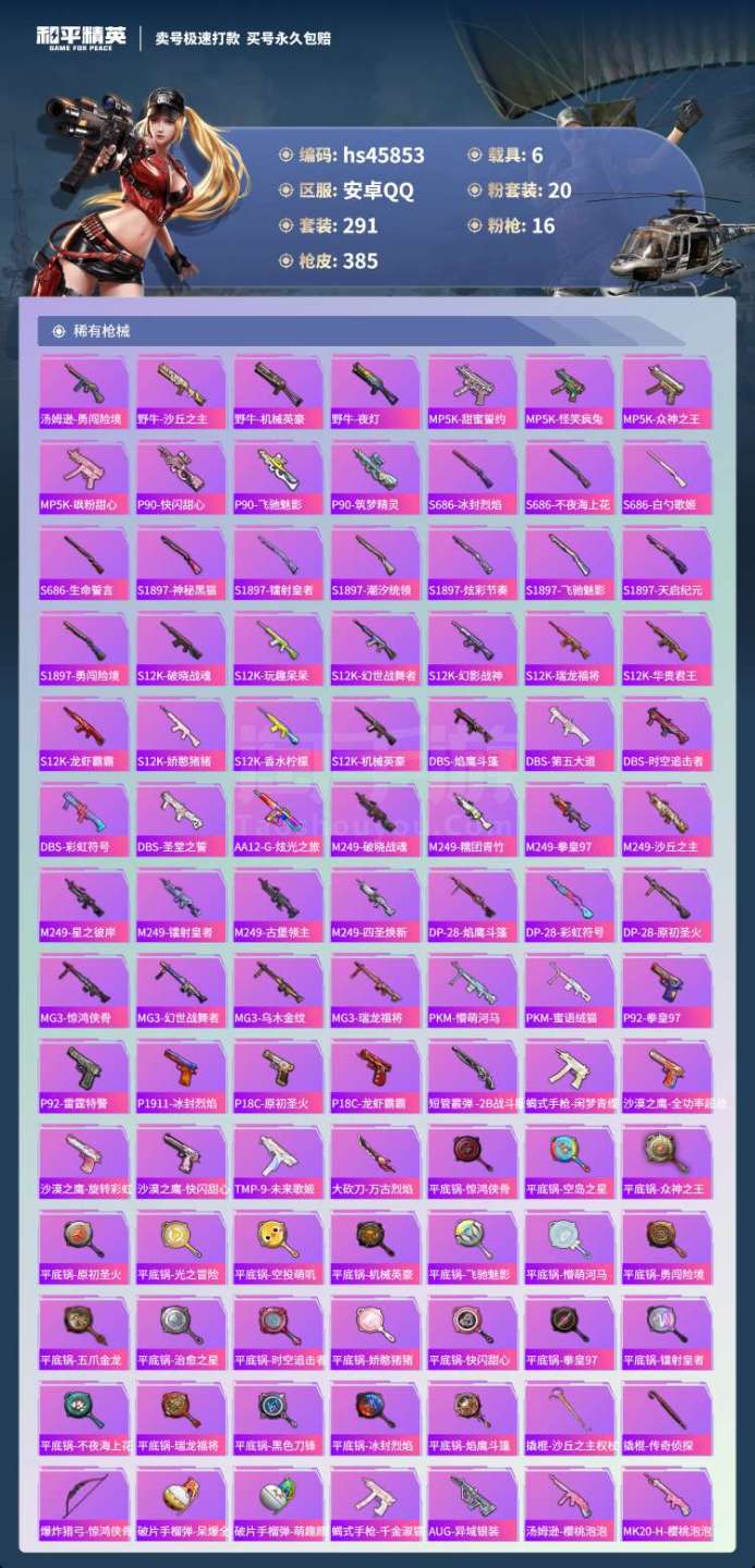 hs45853 安卓手Q-19王牌印记-20粉装-16特效枪-6载具-146320热力值-291套装