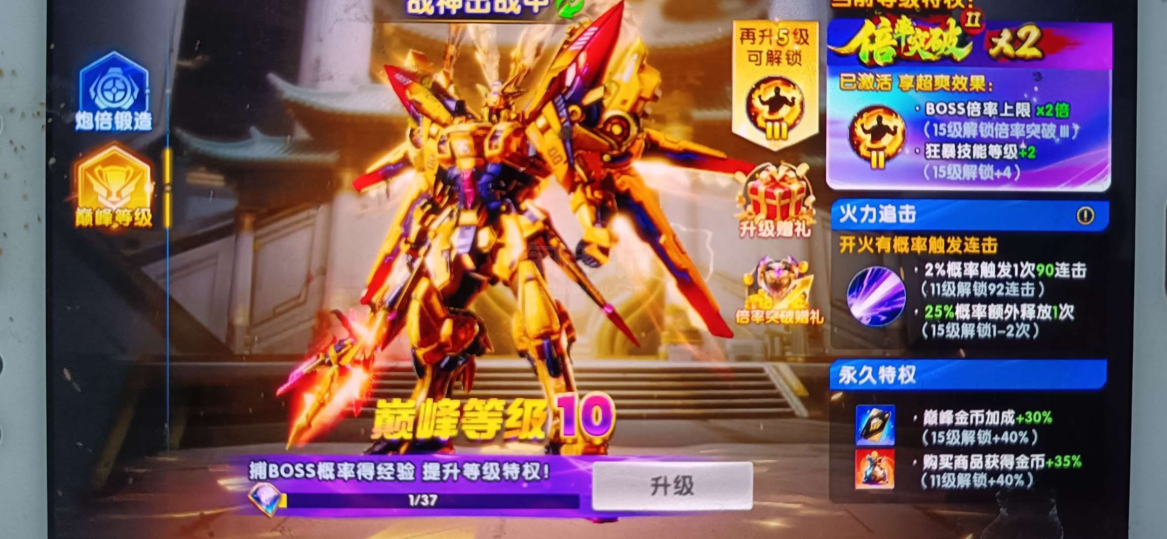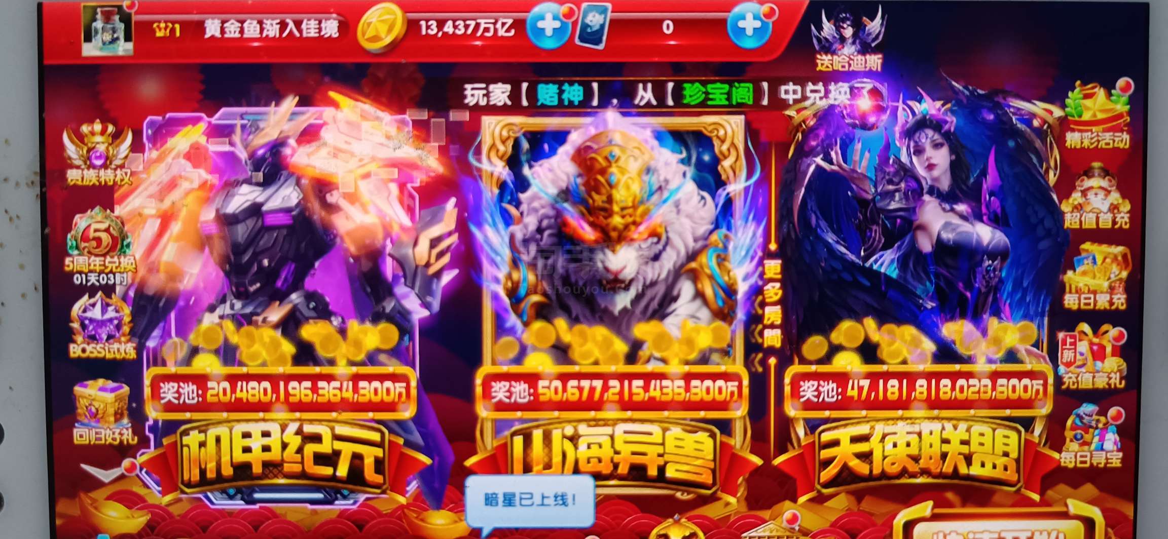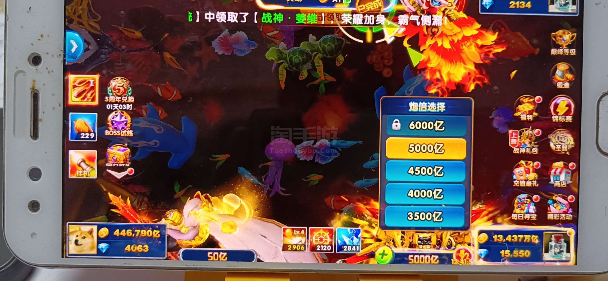 无绑v1 5000炮 13400万亿 狂暴2900+巅峰10 临时战神 道具充足