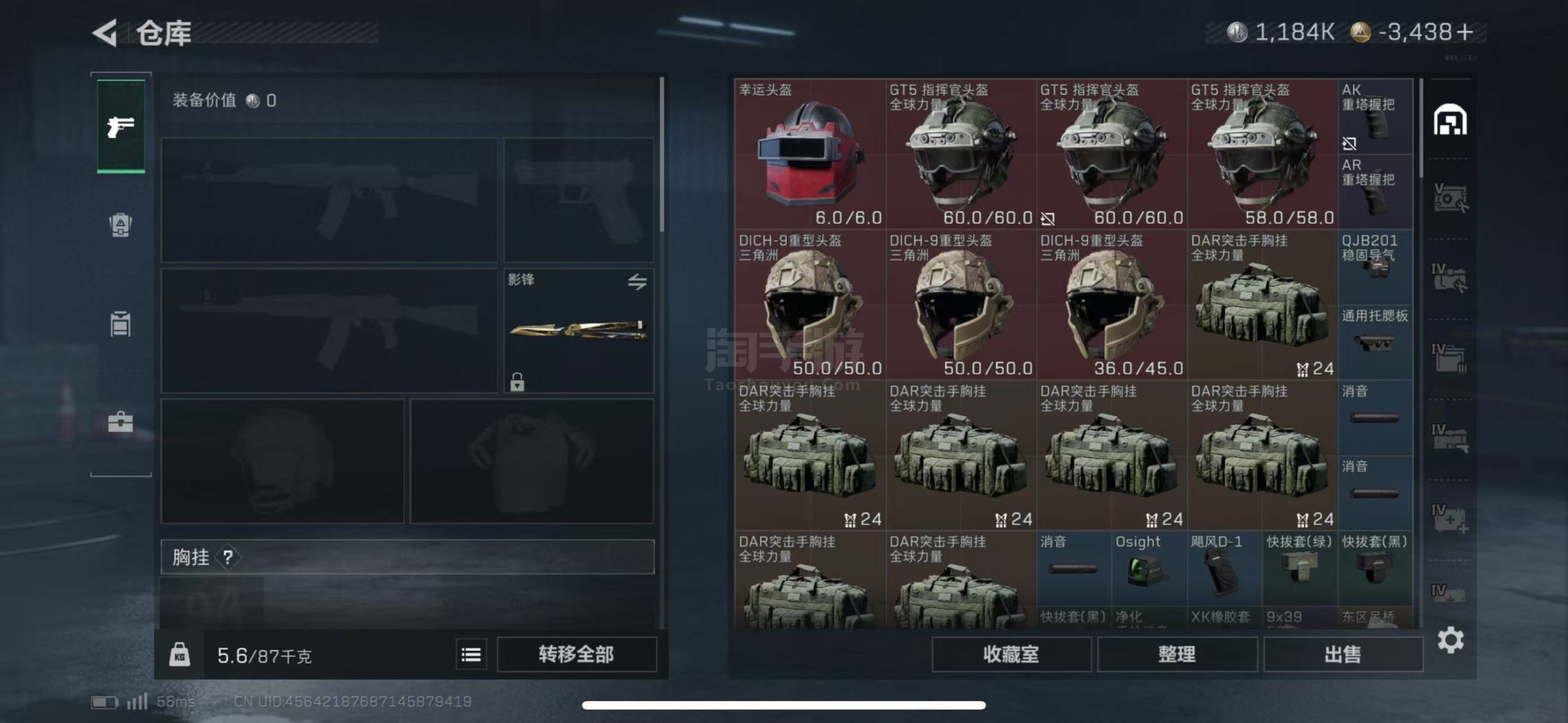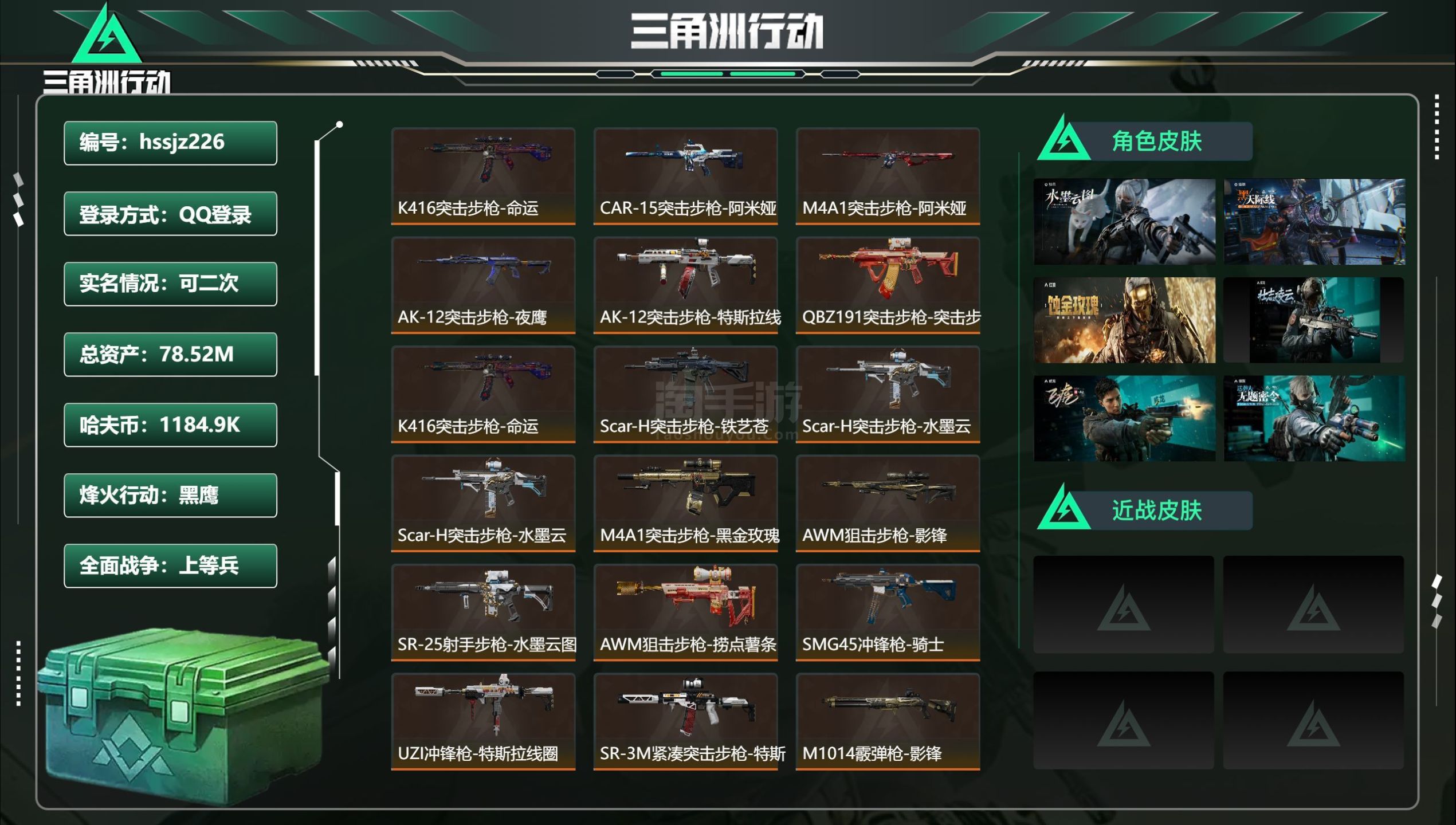 总资产78.52M,哈夫币 1184.9K,战场等级:20 上等兵,行动等级:60 黑鹰,角色皮肤7