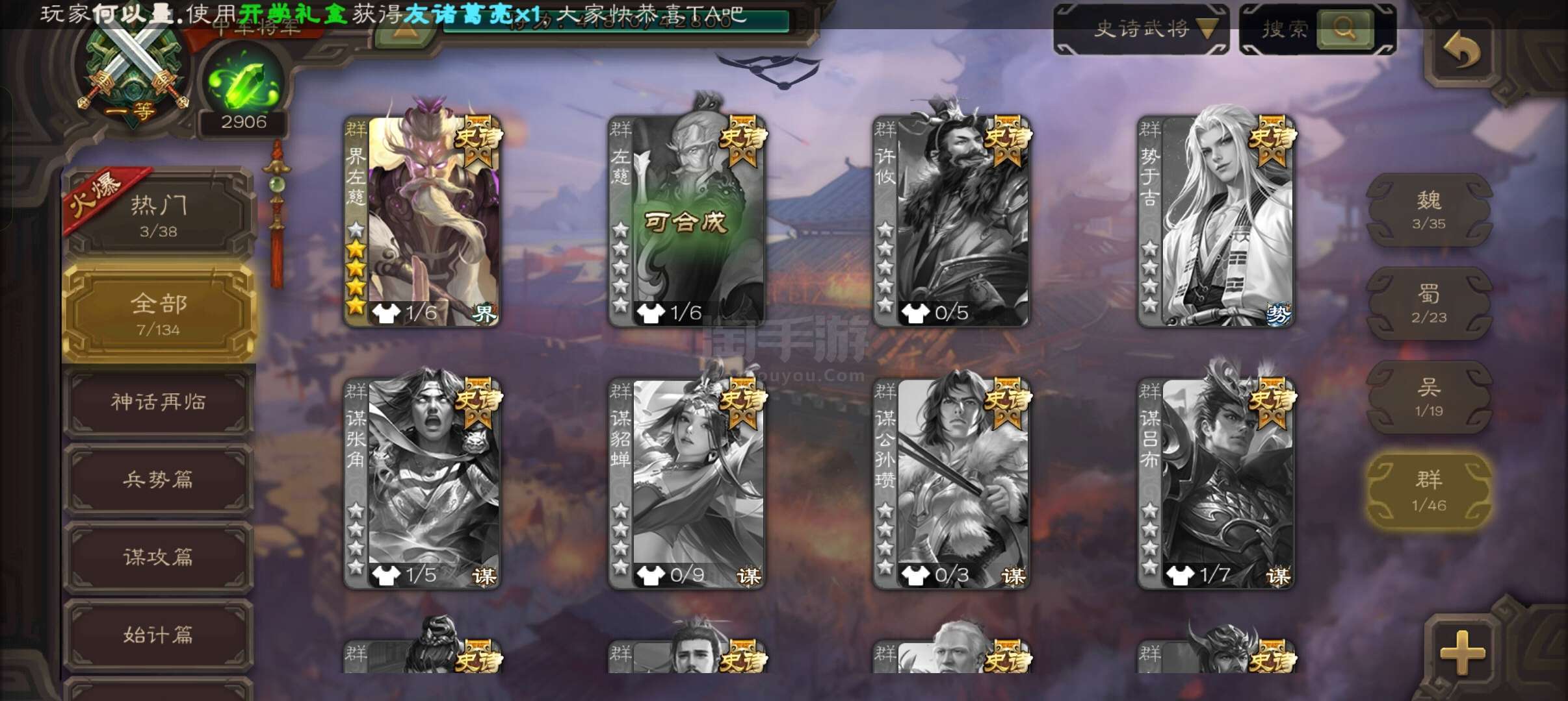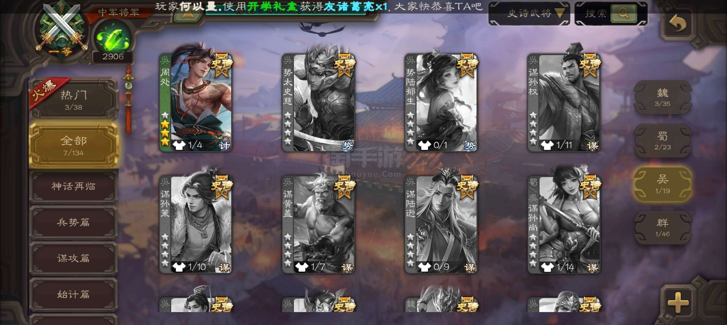 捡漏准领军玉龙动谋关羽/动界左慈/周处/界钟会/戏子7史诗+6w羽毛无限点将
