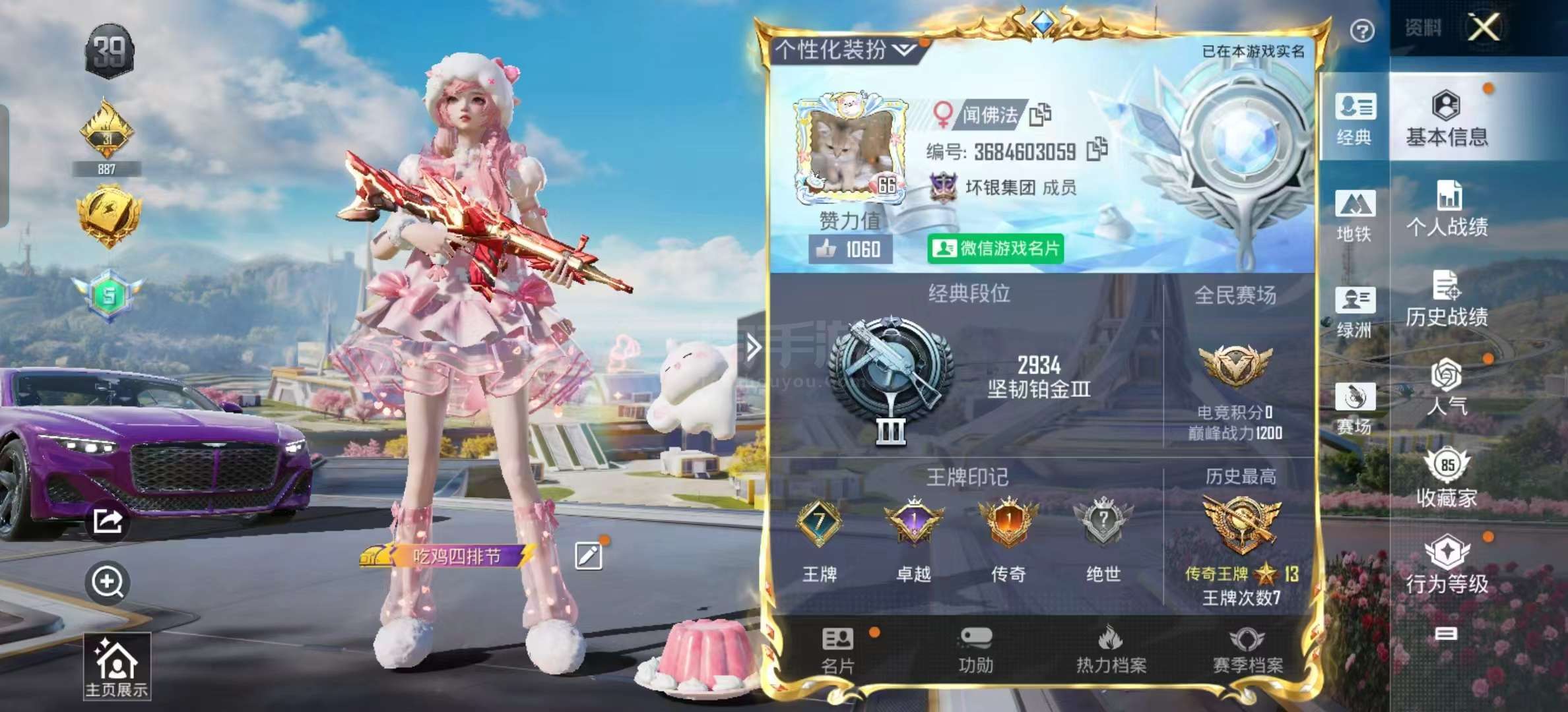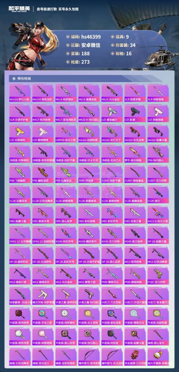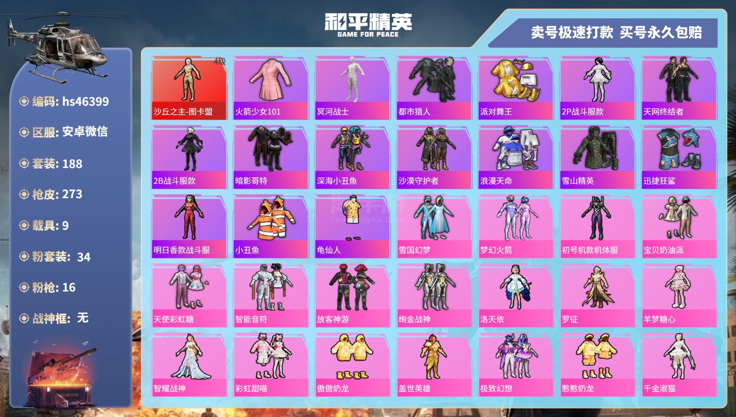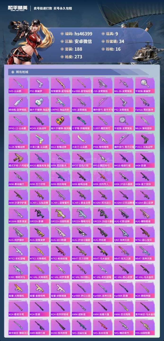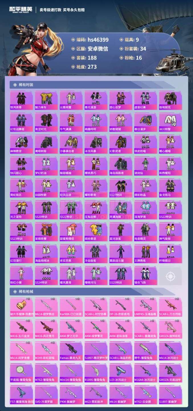hs46399 安卓v-7王牌印记-34粉装-16特效枪-9载具-113447热力值-188套装-