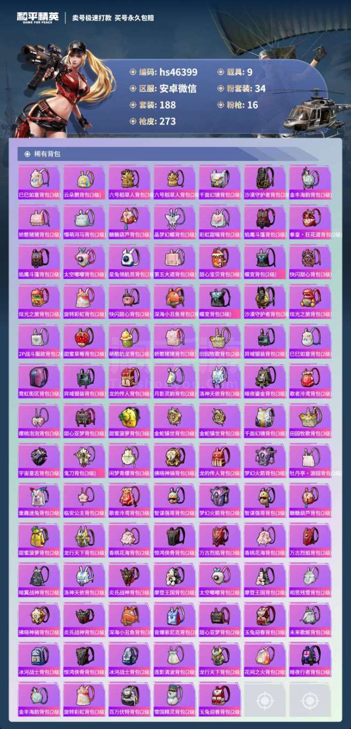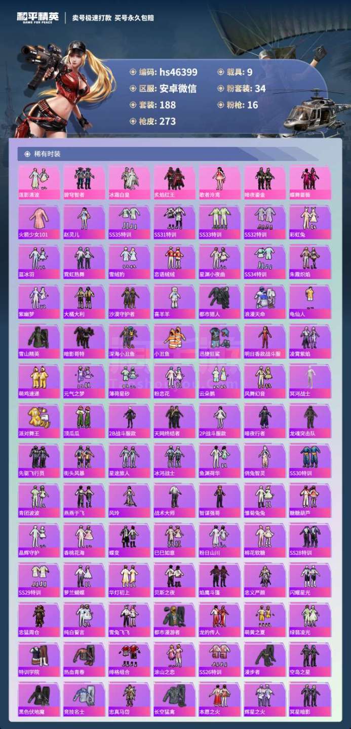 hs46399 安卓微-7王牌印记-34粉装-16特效枪-9载具-113447热力值-188套装-