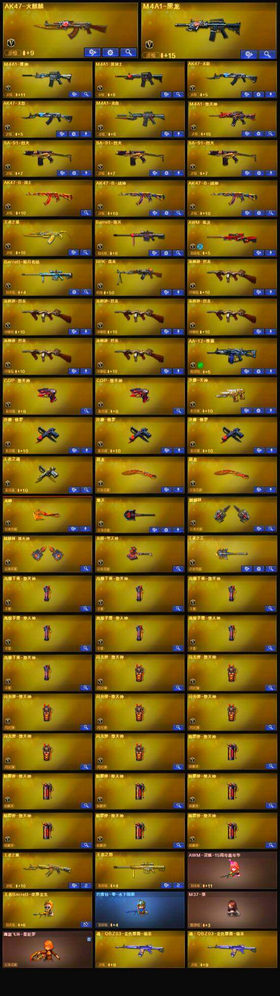 【热门武器】:金色小号,M4A1-黑骑士,汤姆逊-烈龙*6,RPK-盘龙,COP-堕天神*2,沙鹰-修罗*3