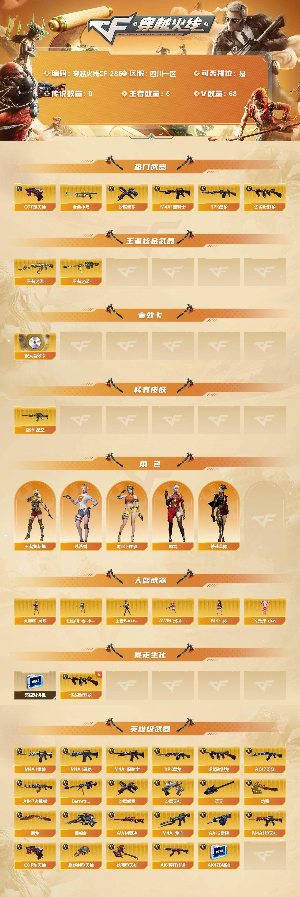 穿越火线(CF)【端游】【商品标题】:四川一区-68V-6王者-0炫金