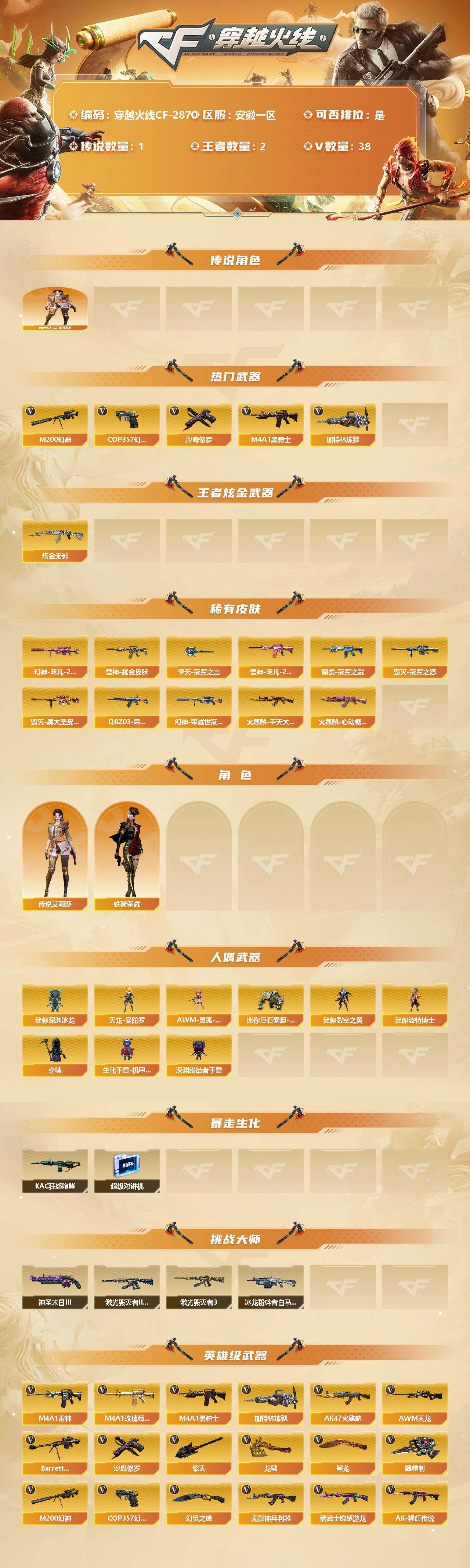 穿越火线(CF)【端游】【商品标题】:安徽一区-38V-2王者-1炫金