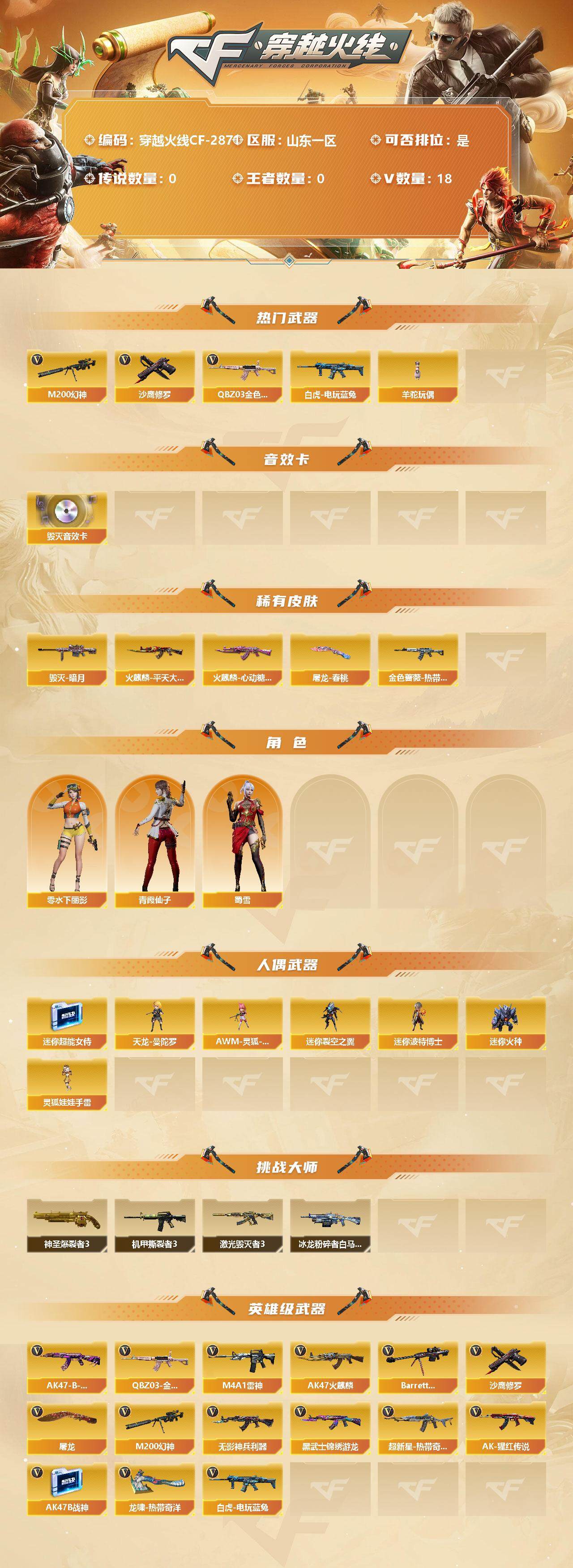 穿越火线(CF)【端游】【商品标题】:山东一区-18V-0王者-0炫金