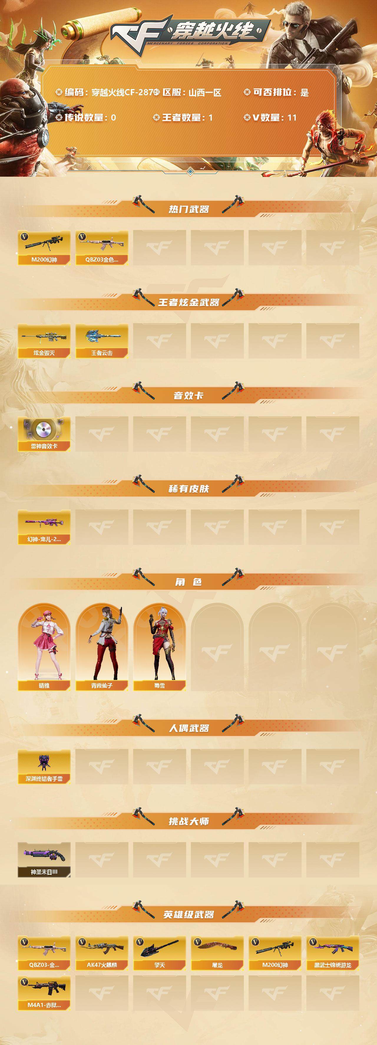 穿越火线(CF)【端游】【商品标题】:山西一区-11V-1王者-1炫金