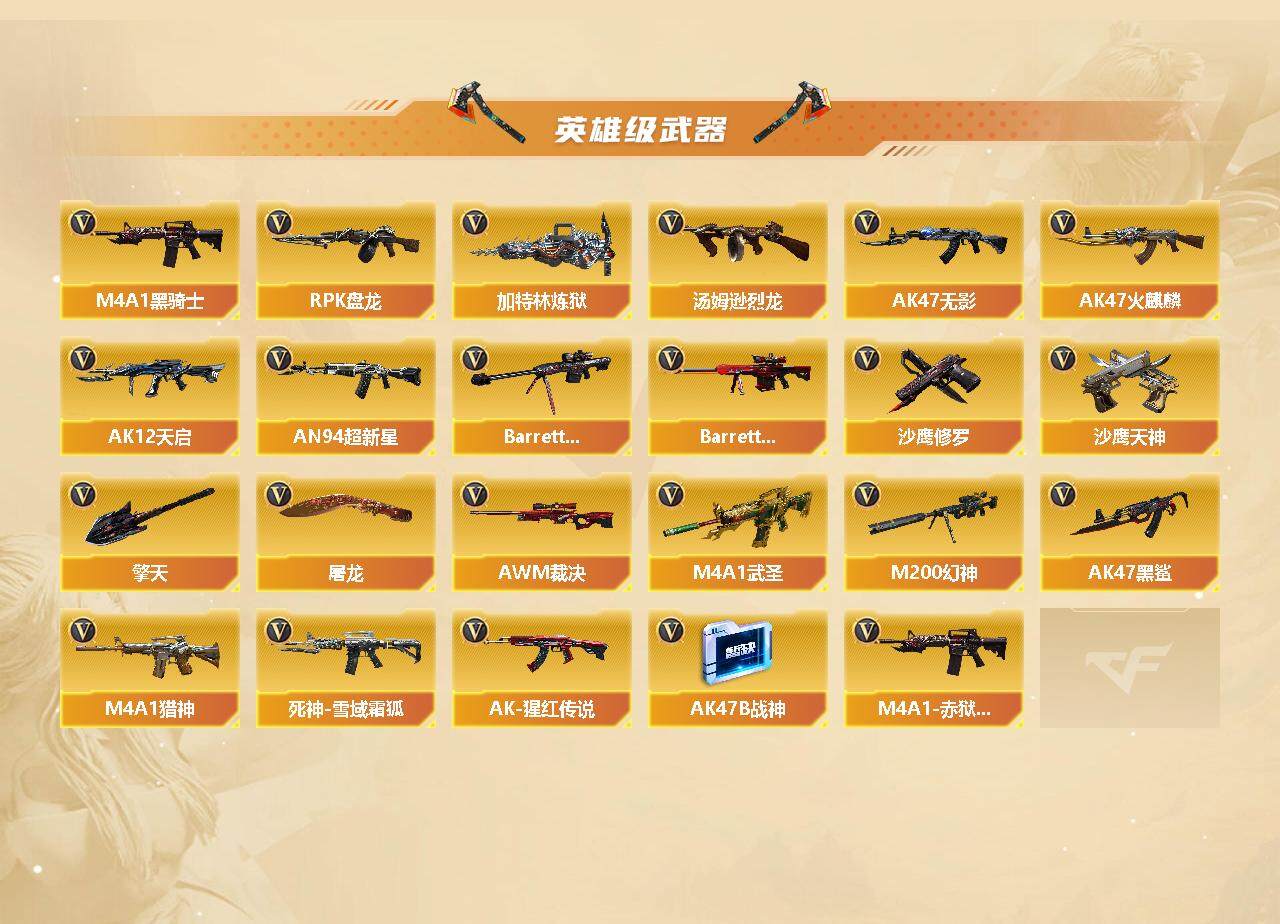 【热门武器】:QBZ03-金色蔷薇,Scar Light-白虎,HK417-朱雀,M200-幻神,死亡之眼,M4A1-黑骑士*2,汤姆逊-烈龙*6,RPK-盘龙*6,加特林-炼狱*3,斯泰尔-蝴蝶,火麒麟-绝迹,沙鹰-修罗*13