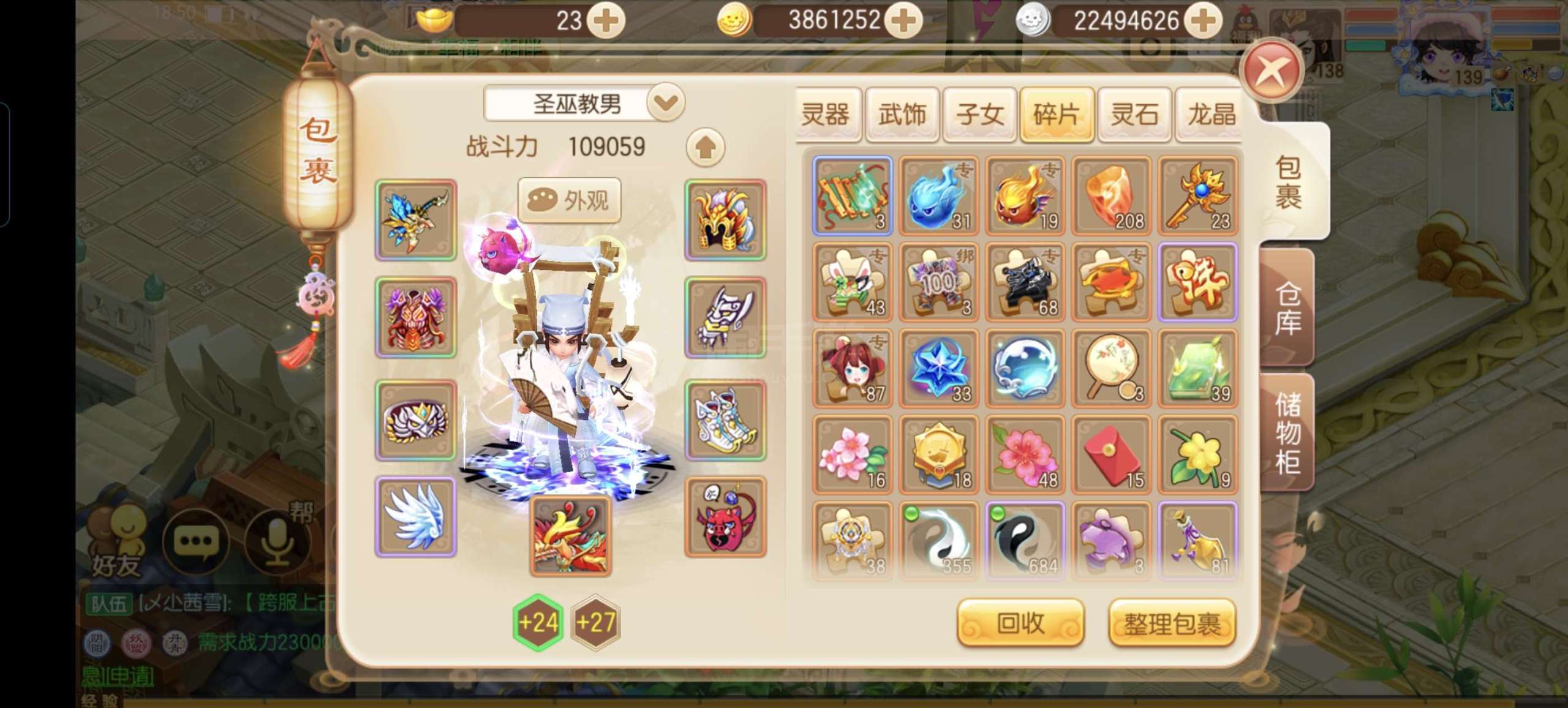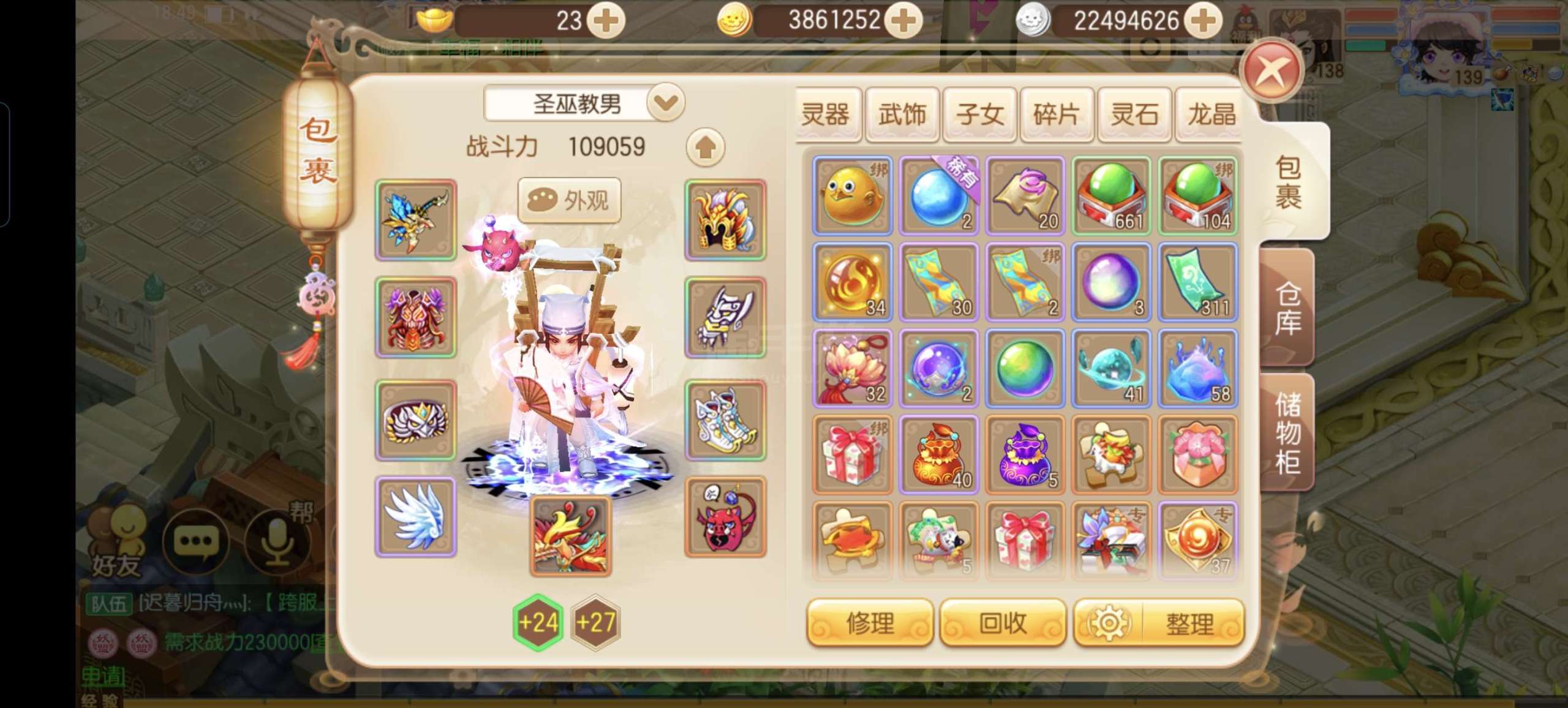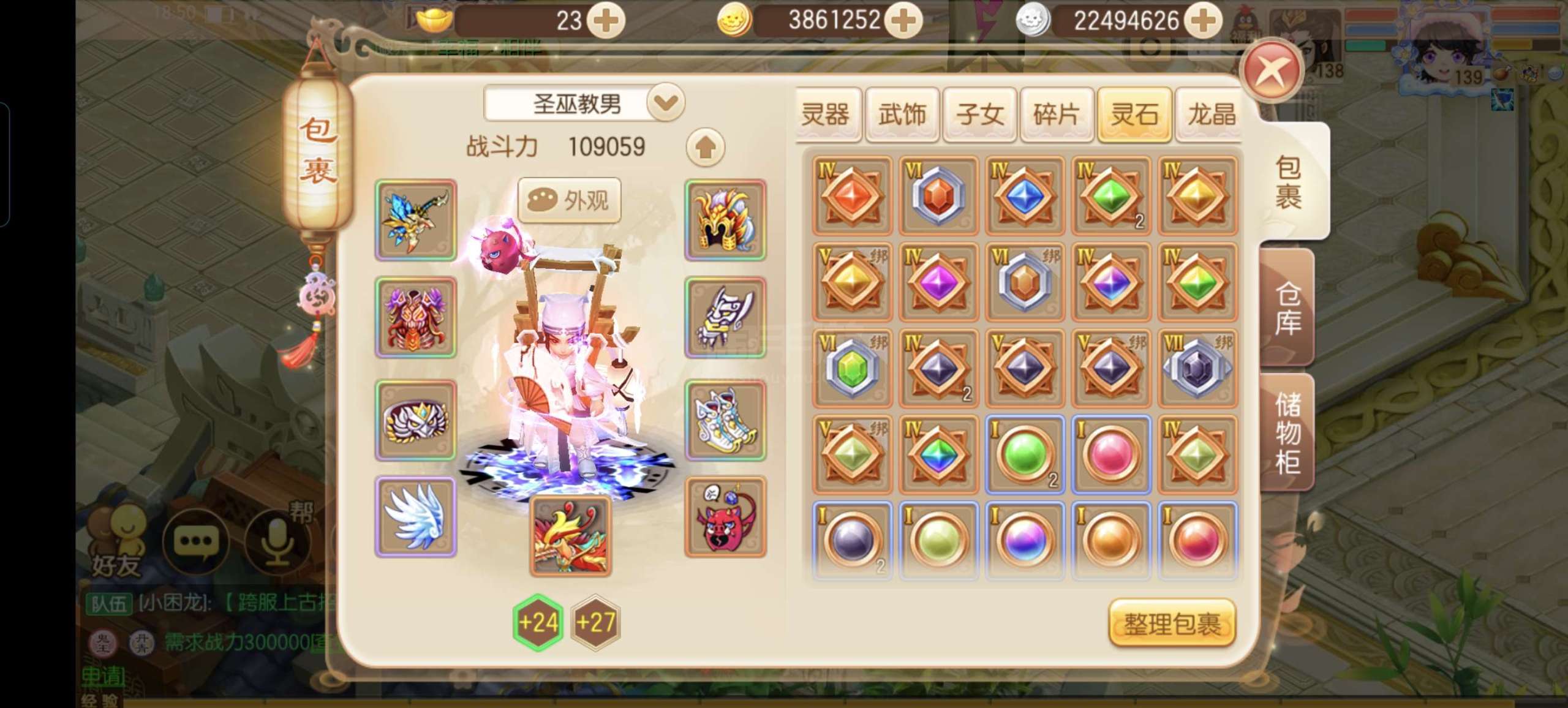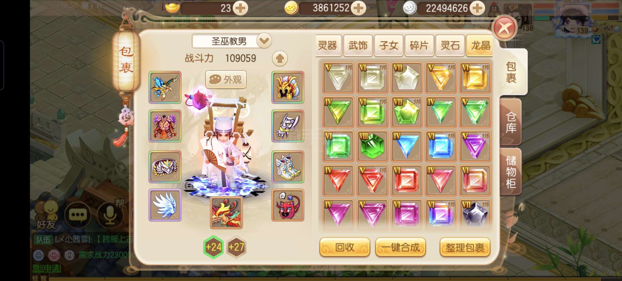 满级圣巫,109000战力,一身极品装备,极品法宝,2只10技宝宝,1只9技宝宝,2个成品孩子