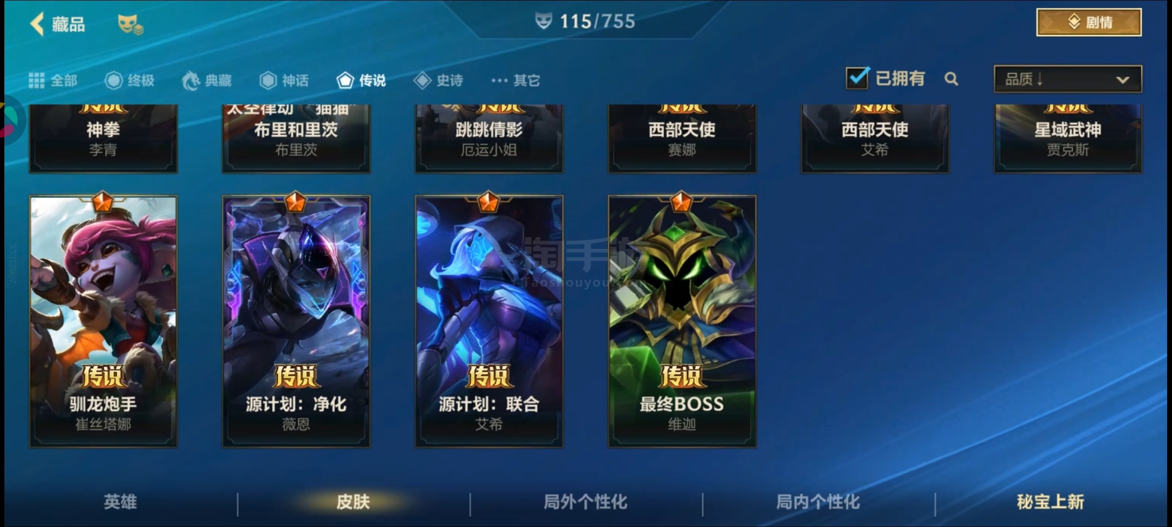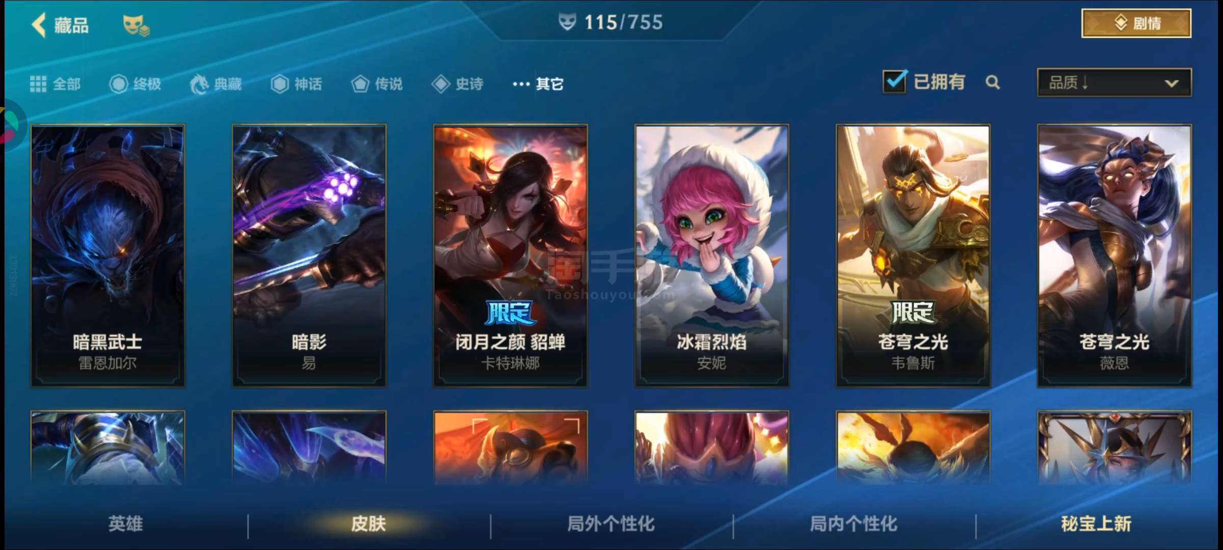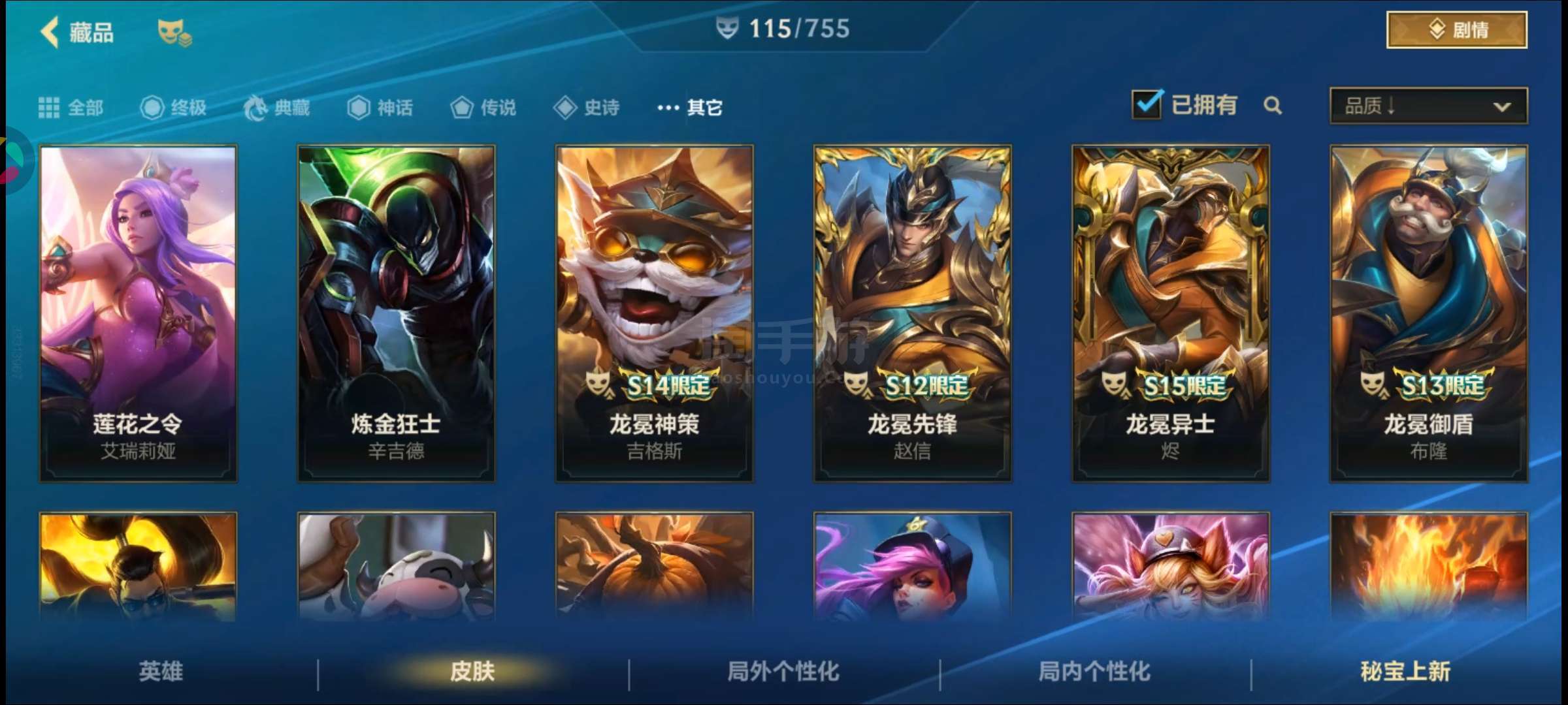 盖伦神话,金克丝臻宝,皇子水晶玫瑰吕布,卡特限定,吸血鬼天气皮,其余大大小小传说史诗普通皮自看