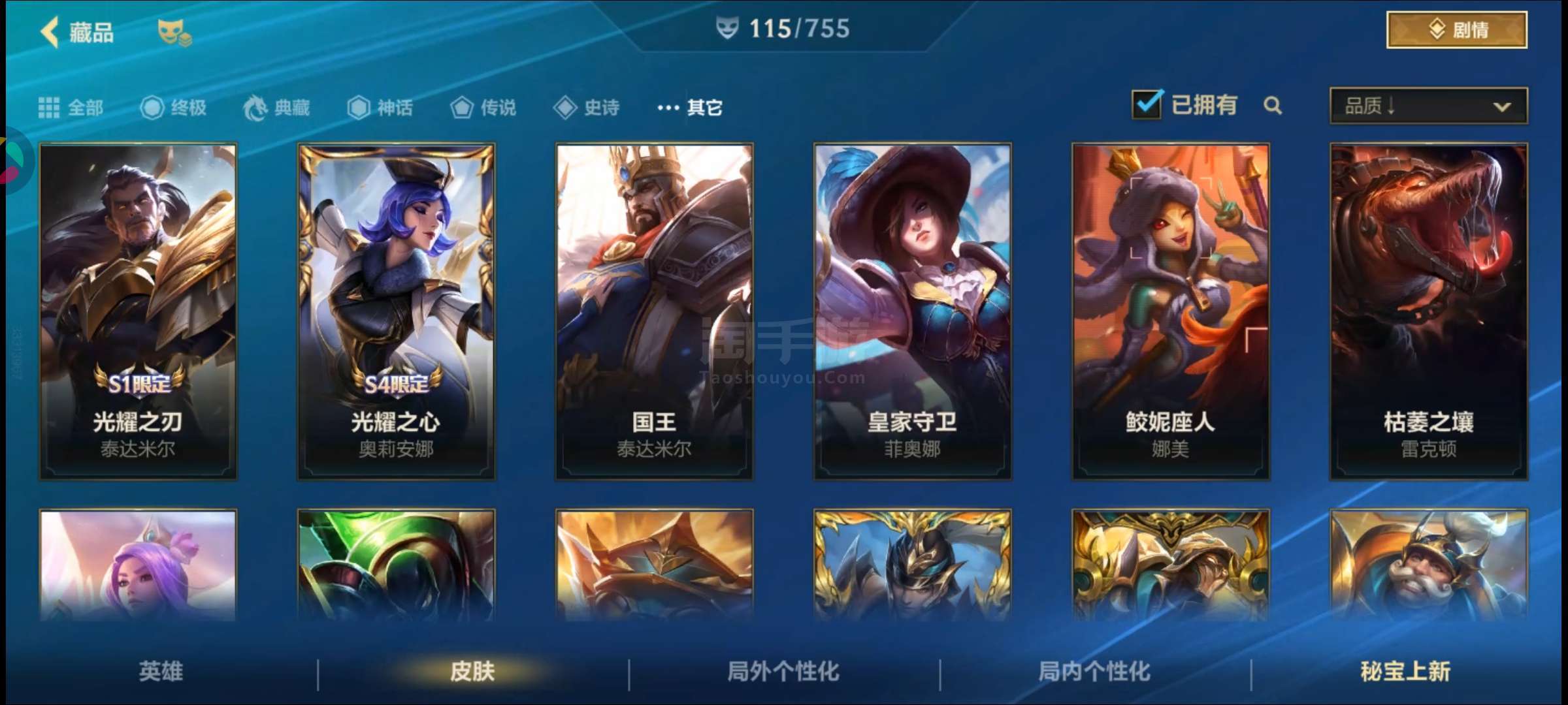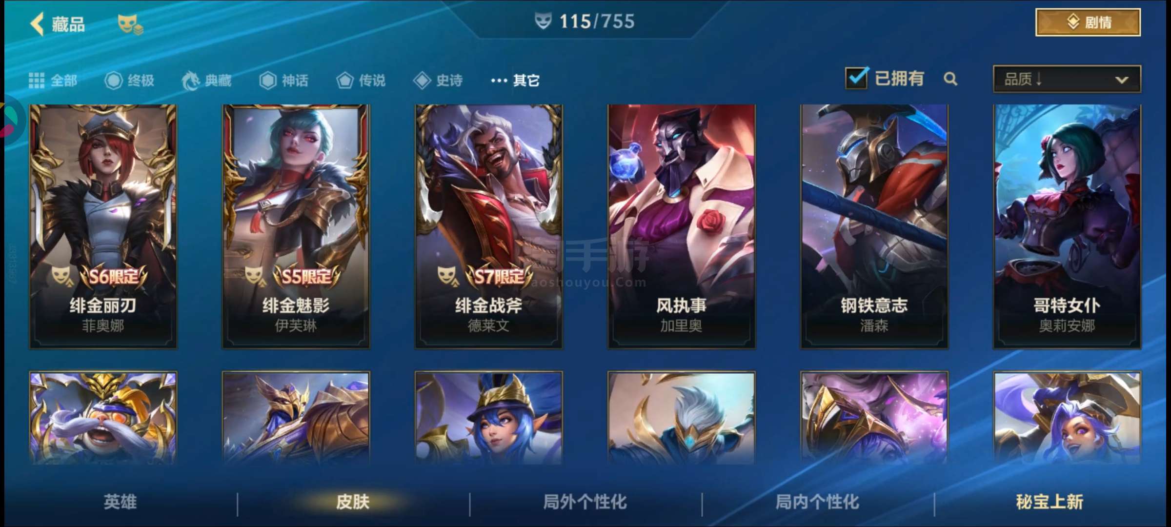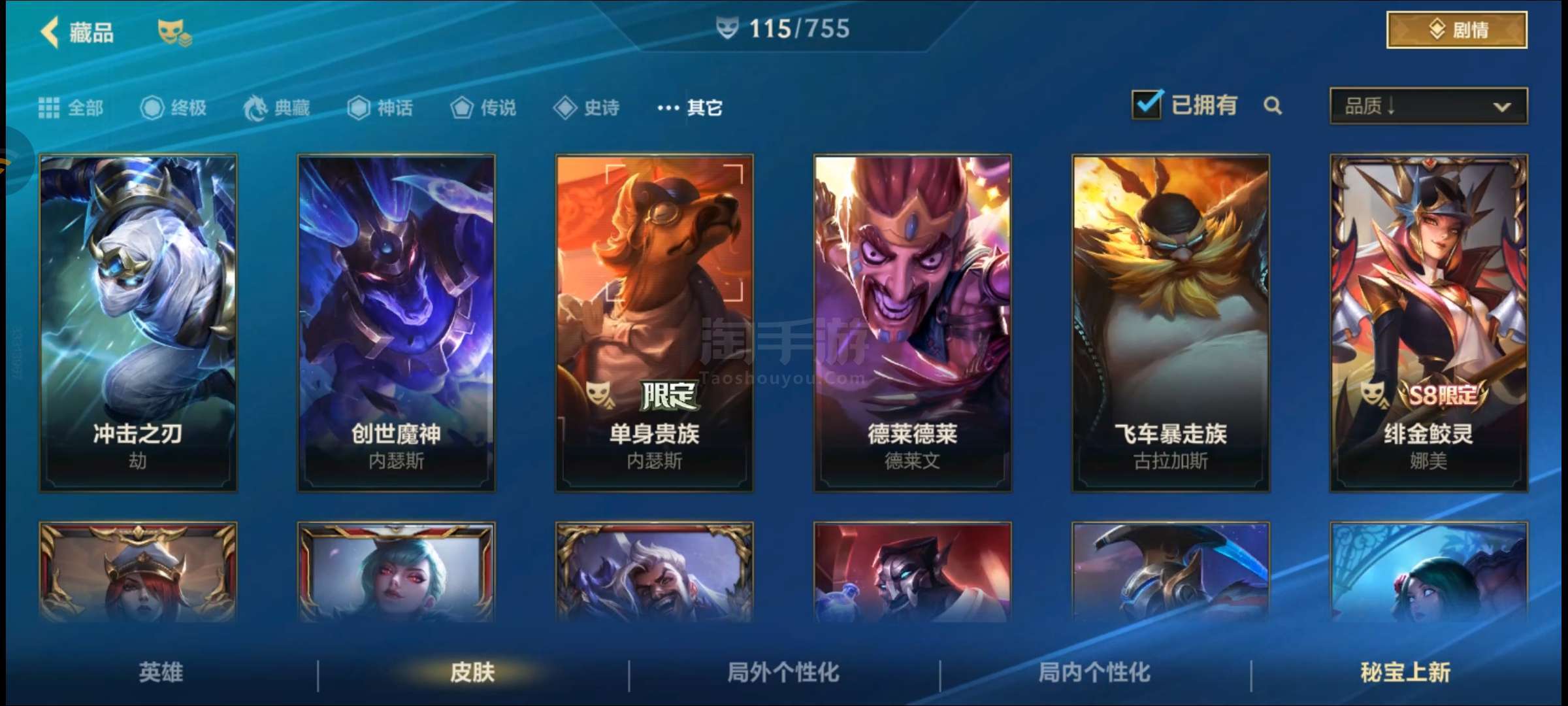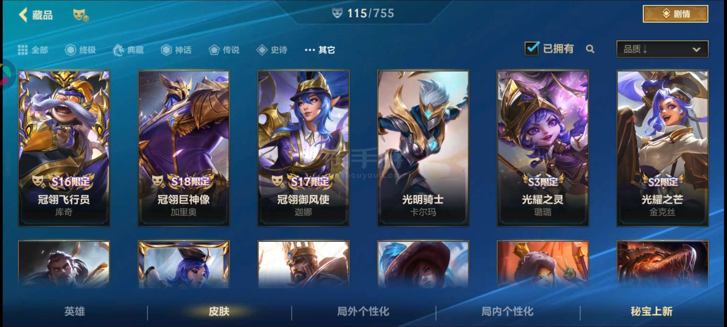 盖伦神话,金克丝臻宝,皇子水晶玫瑰吕布,卡特限定,吸血鬼天气皮,其余大大小小传说史诗普通皮自看