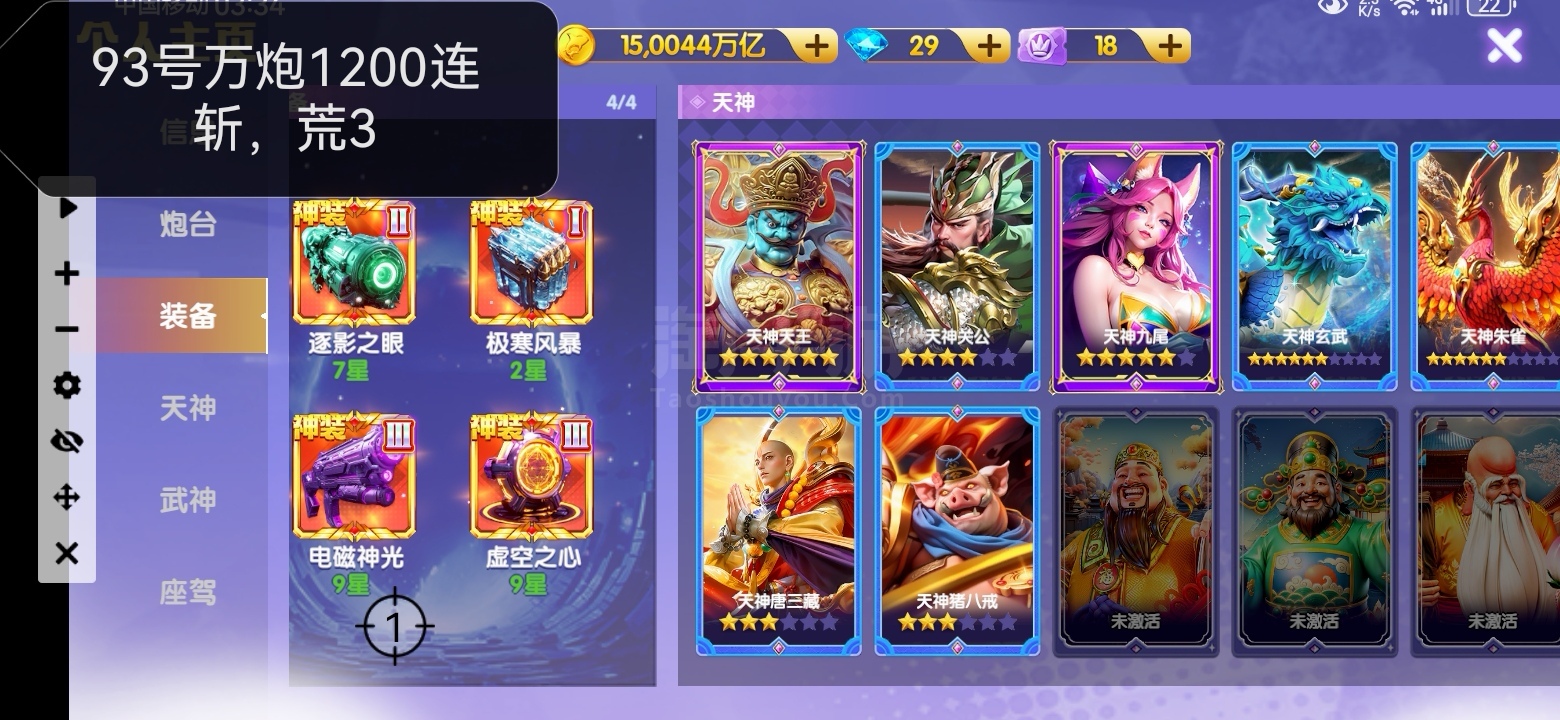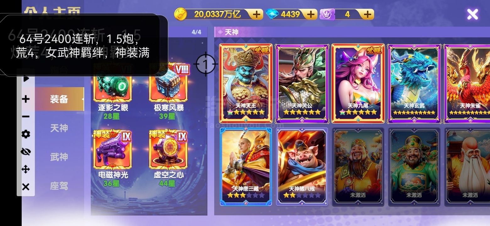 最低配置,万炮神装三级洪荒,天神上班,600连斩以上,纯最低7块1京,私我选号