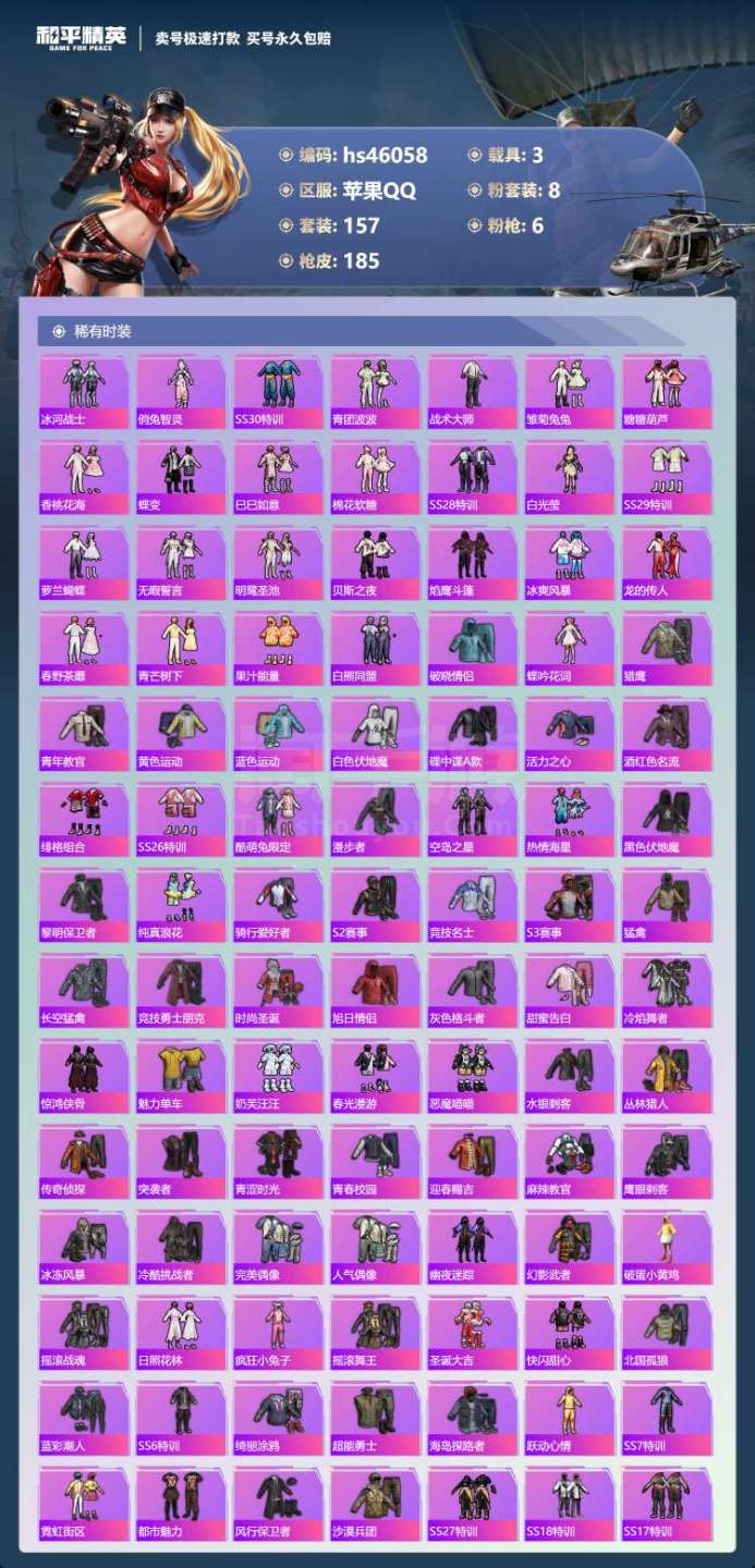 hs46058 苹果手Q-16王牌印记-8粉装-6特效枪-3载具-67241热力值-157套装-18