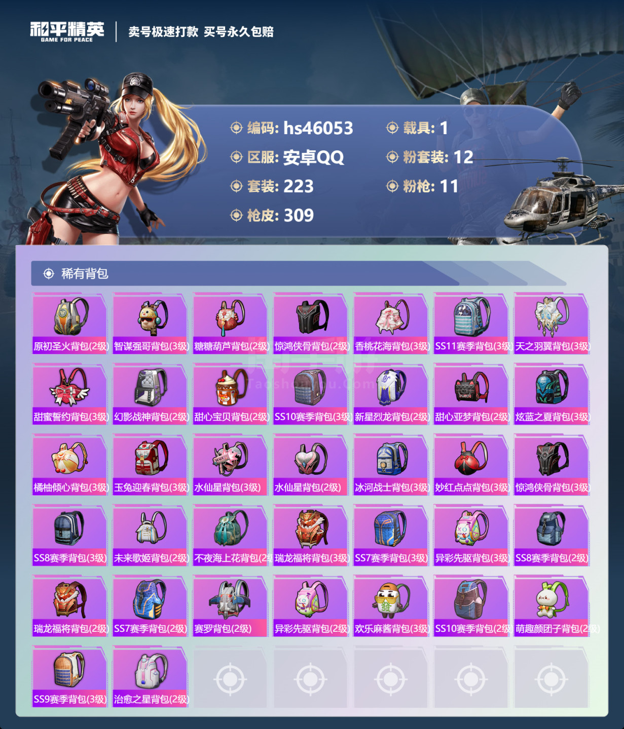 hs46053 安卓手Q-16王牌印记-12粉装-11特效枪-1载具-103884热力值-223套装