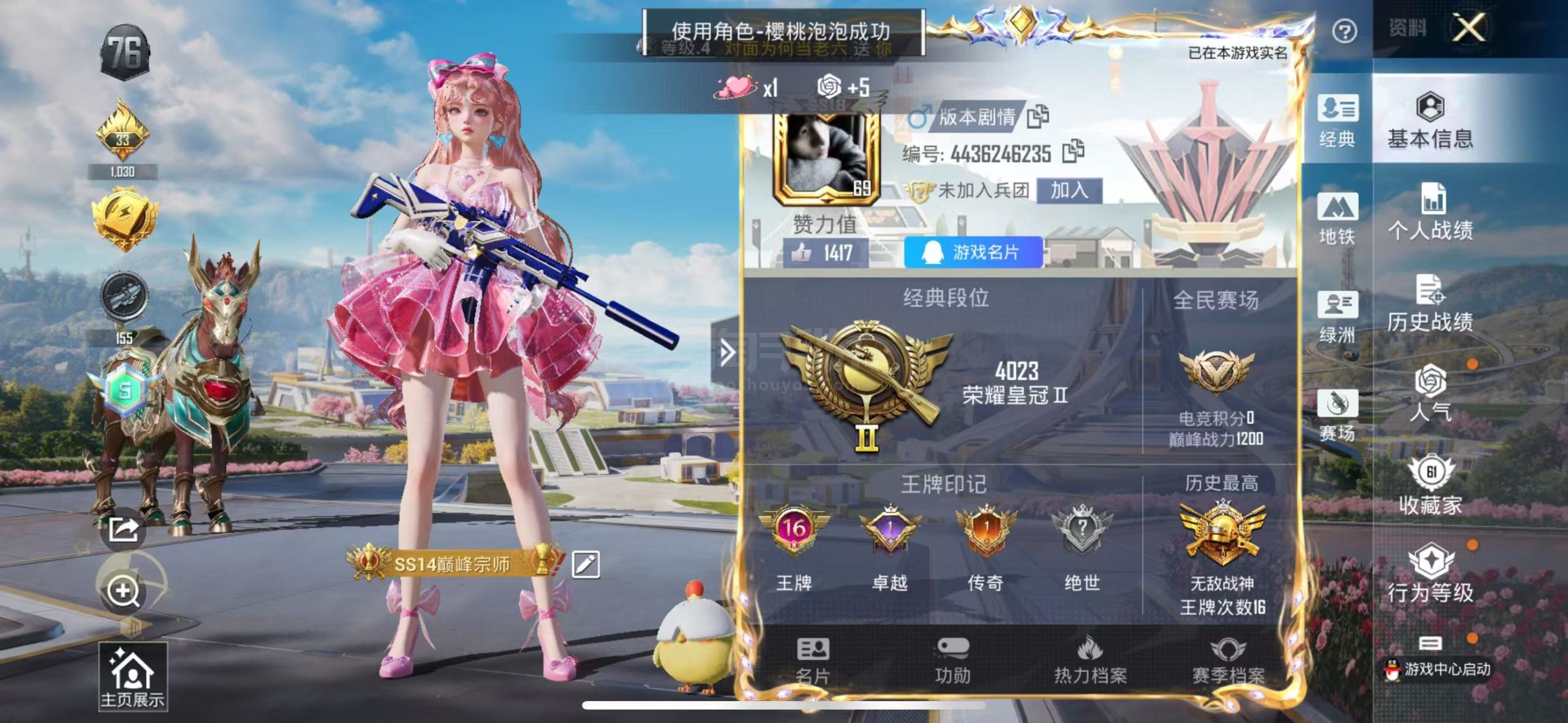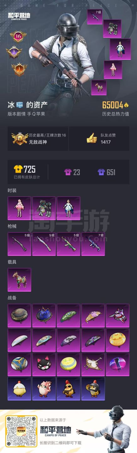 hs46108 苹果手Q-16王牌印记-有战神框-3粉装-4特效枪-1载具-65034热力值-153