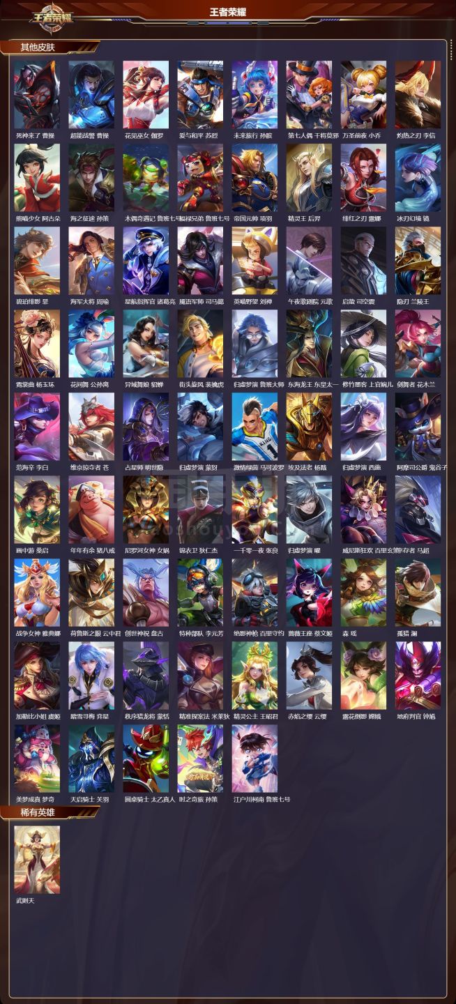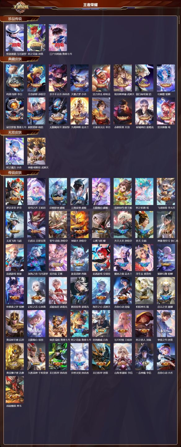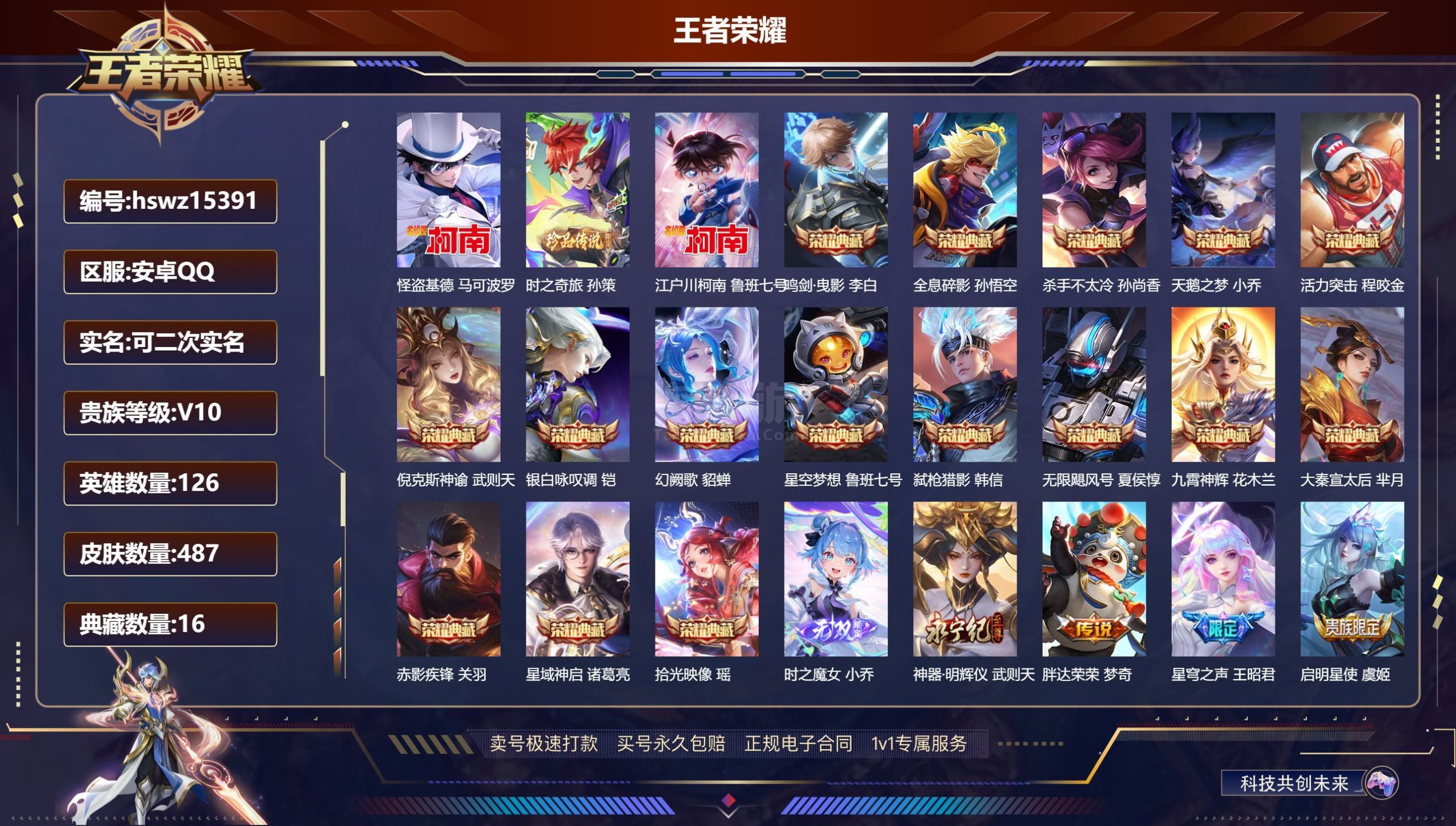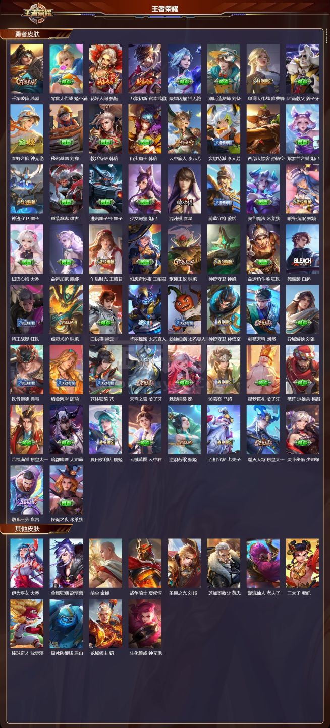 安卓QQ/绝世王者/487皮肤/126英雄/16典藏/0珍品无双/2无双/3珍品传说/63传说/16