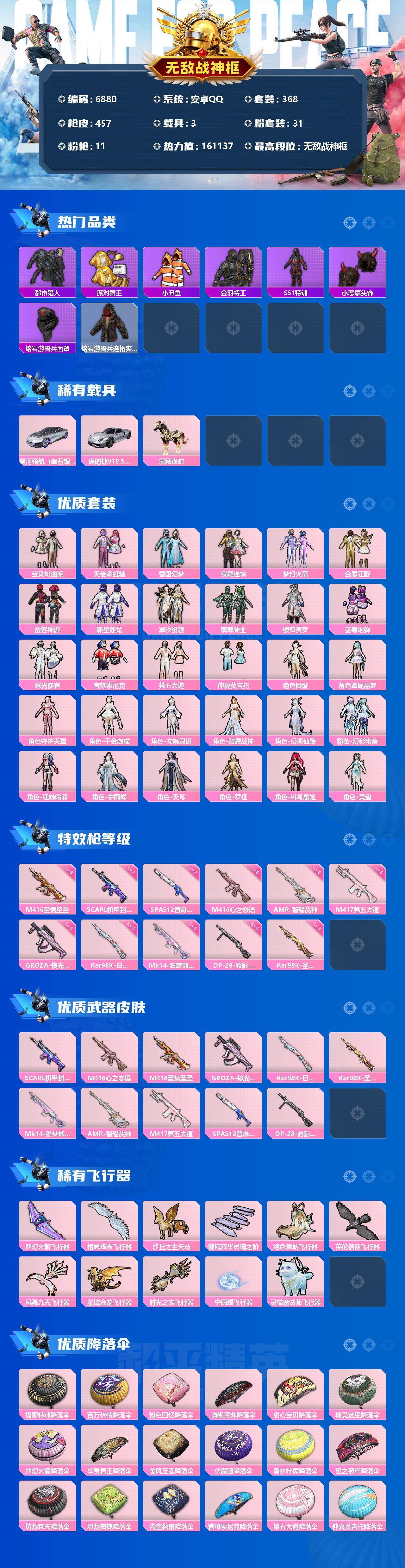 和平精英【安卓QQ】【6880】31粉装-11特效枪-3载具-161137热力值-28印记-368