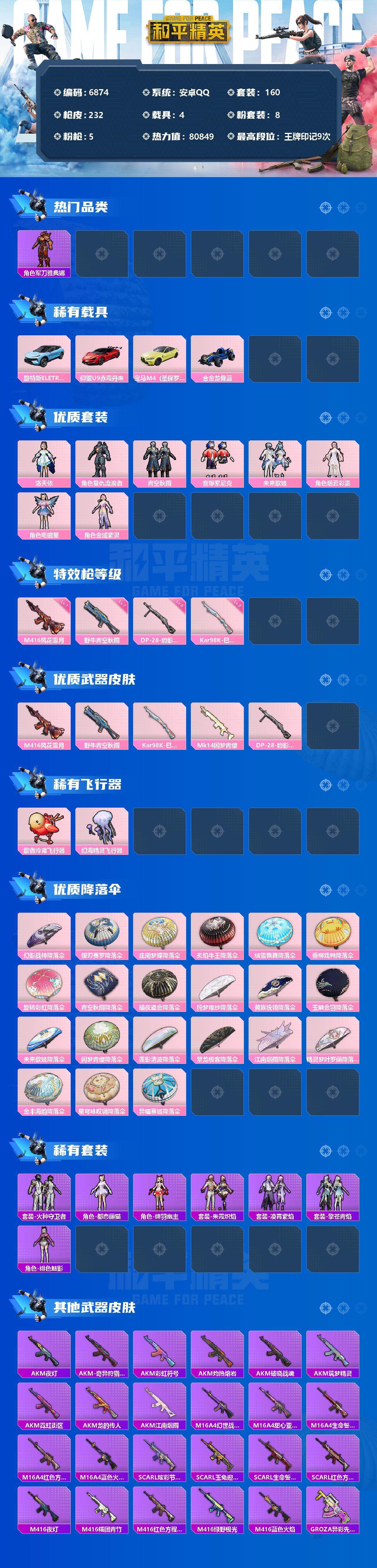 和平精英【安卓QQ】【6874】8粉装-5特效枪-4载具-80849热力值-9印记-160套装-2