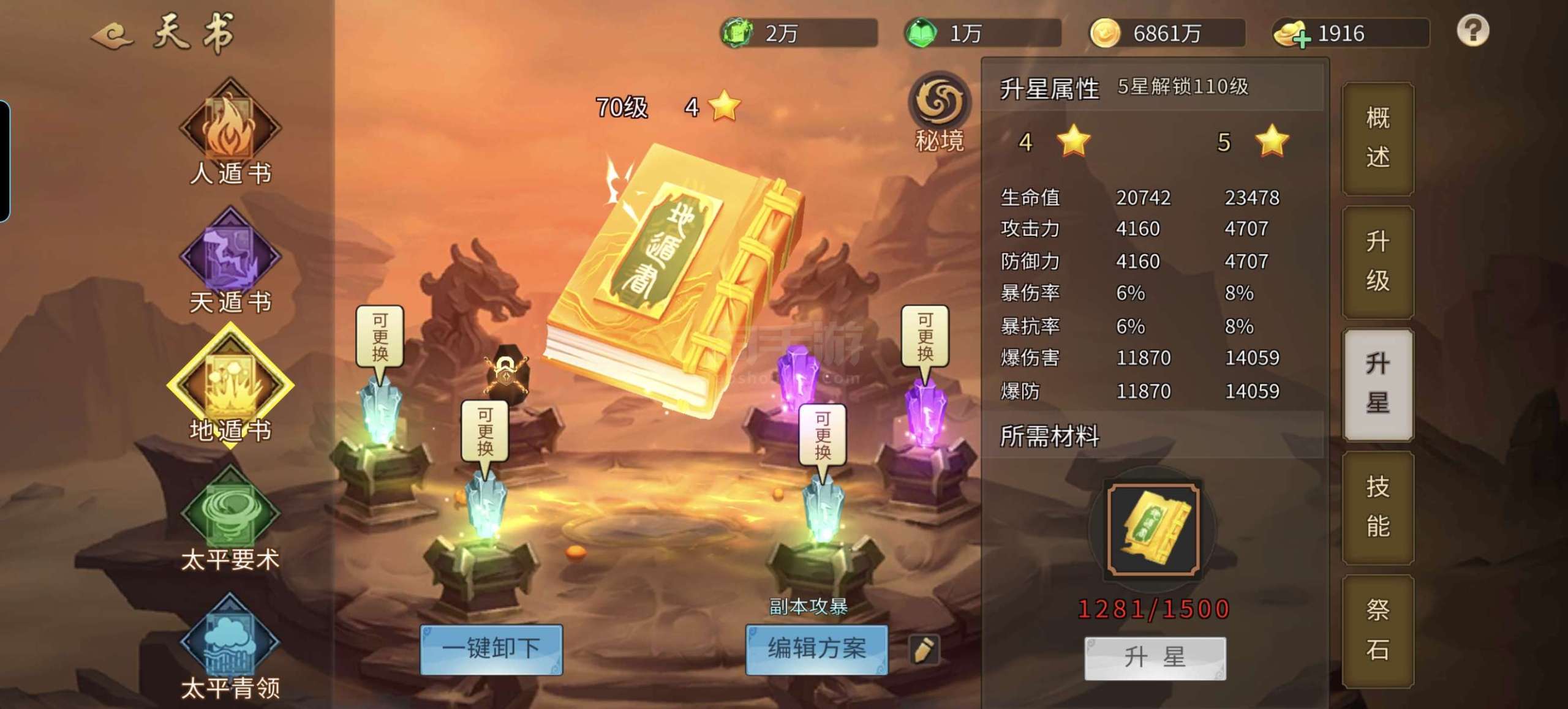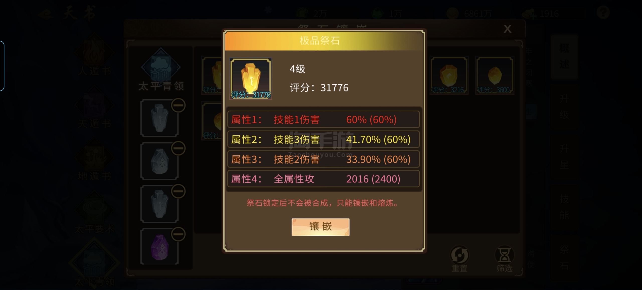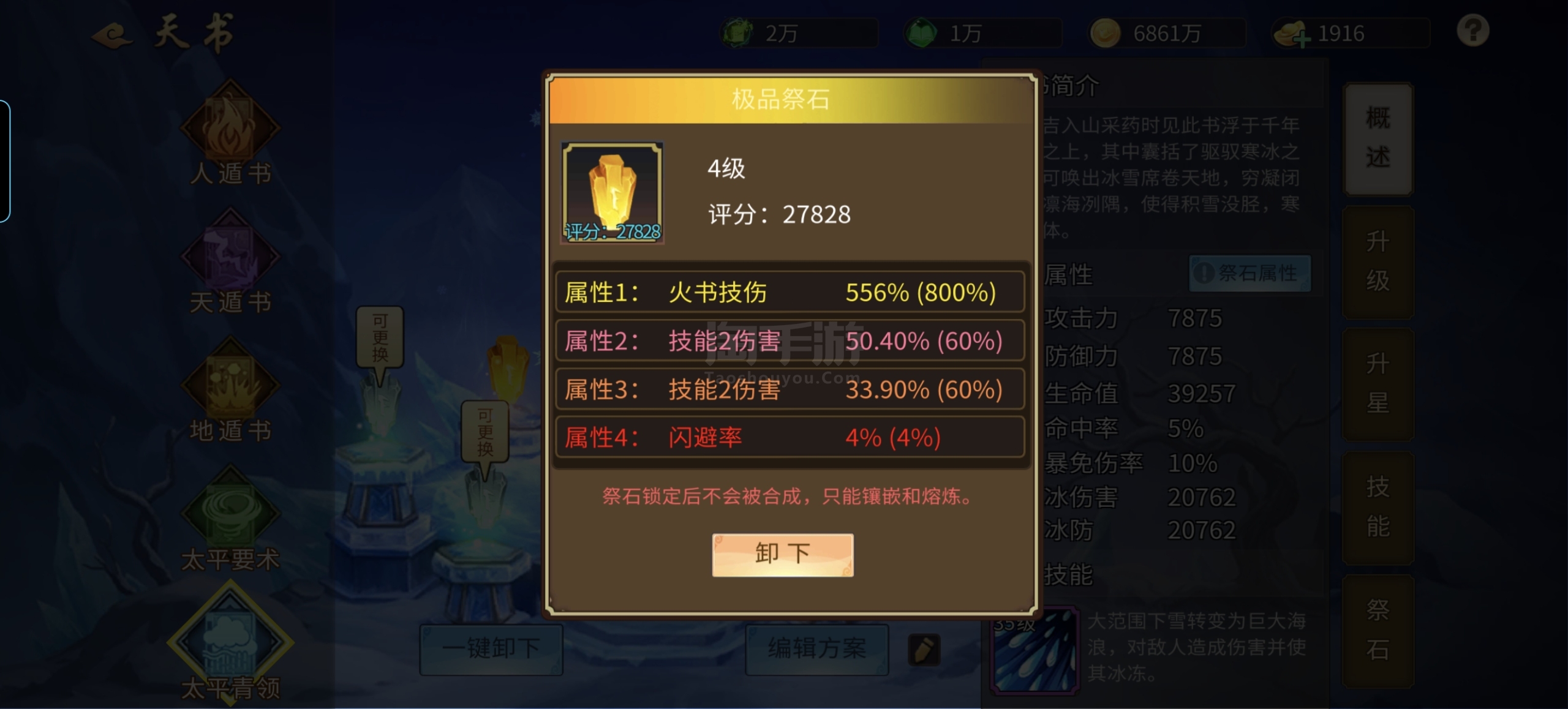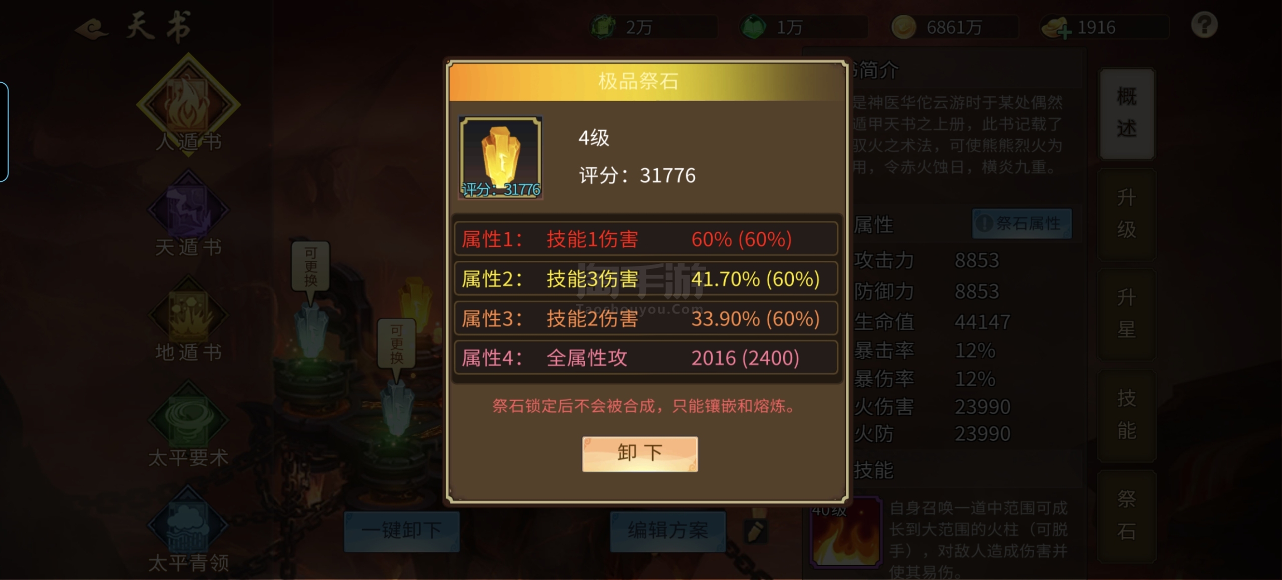 攻击力54,5个极品金色石头,火书7星,冰书6星,还有两本天书马上升级,兵法火三星。其他两星,