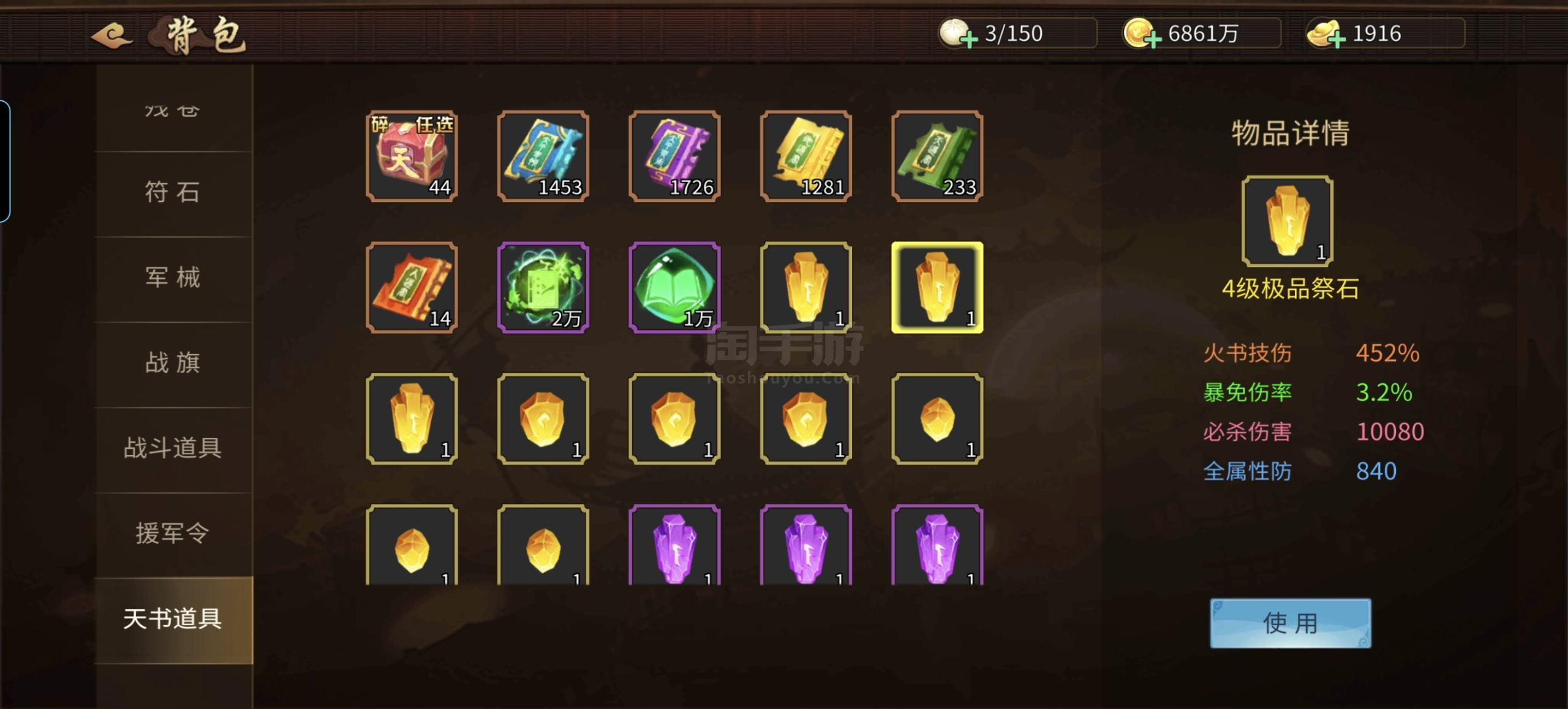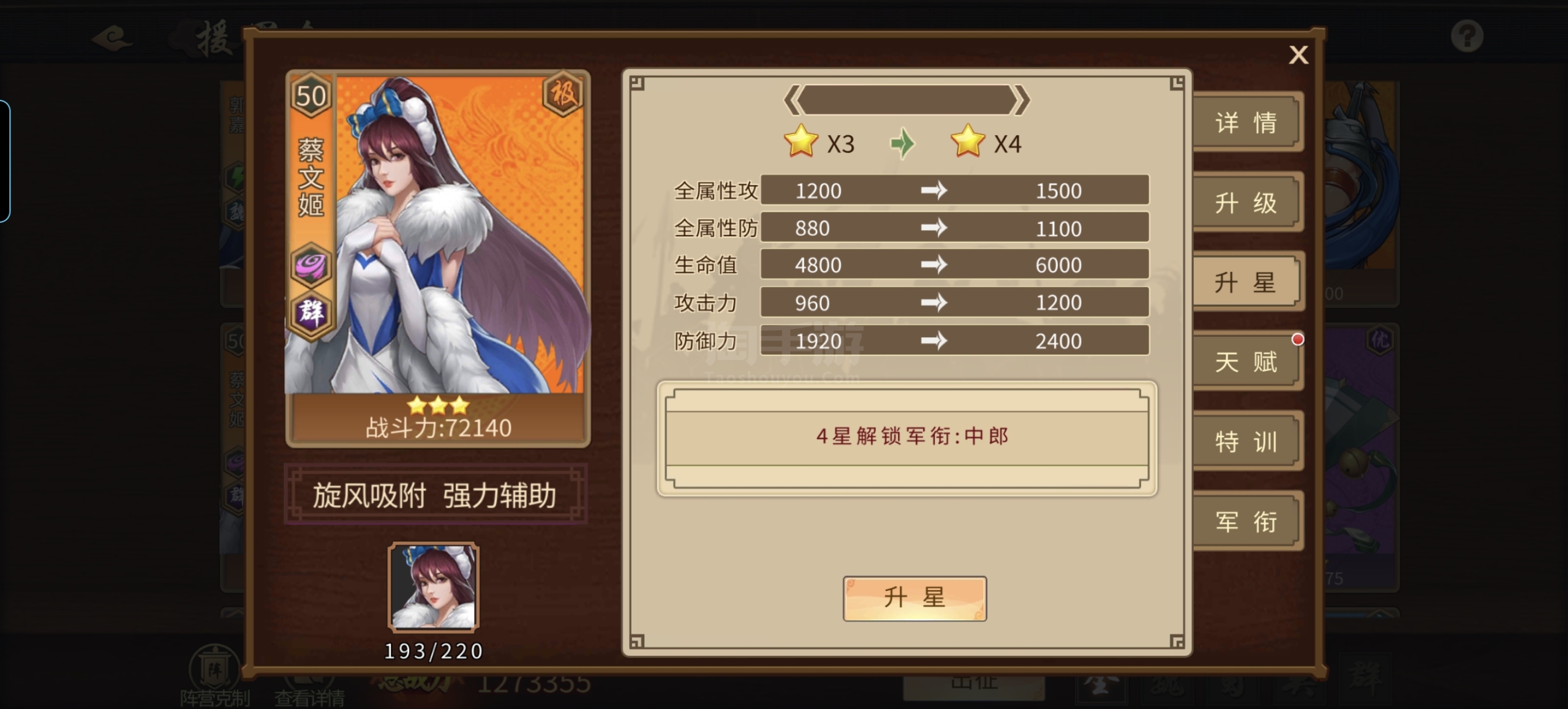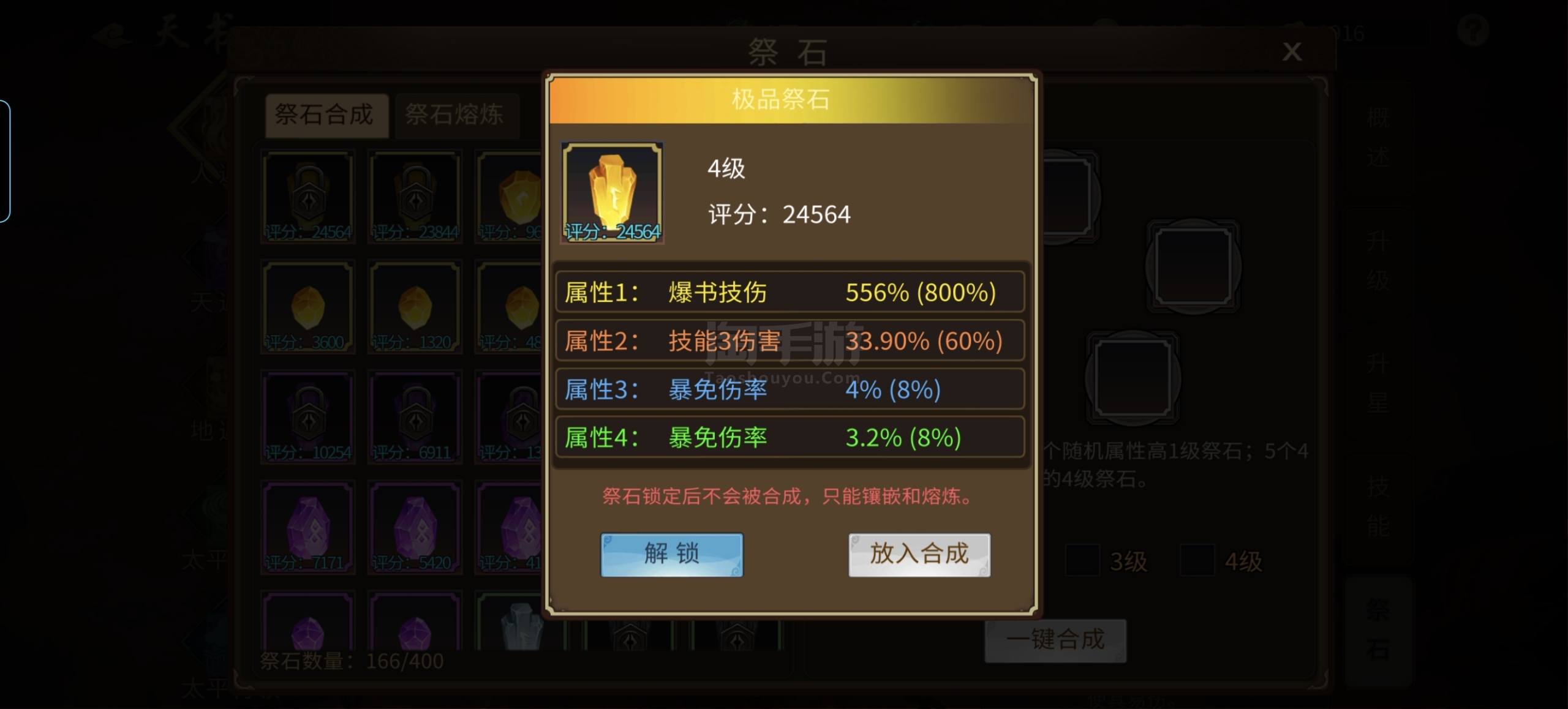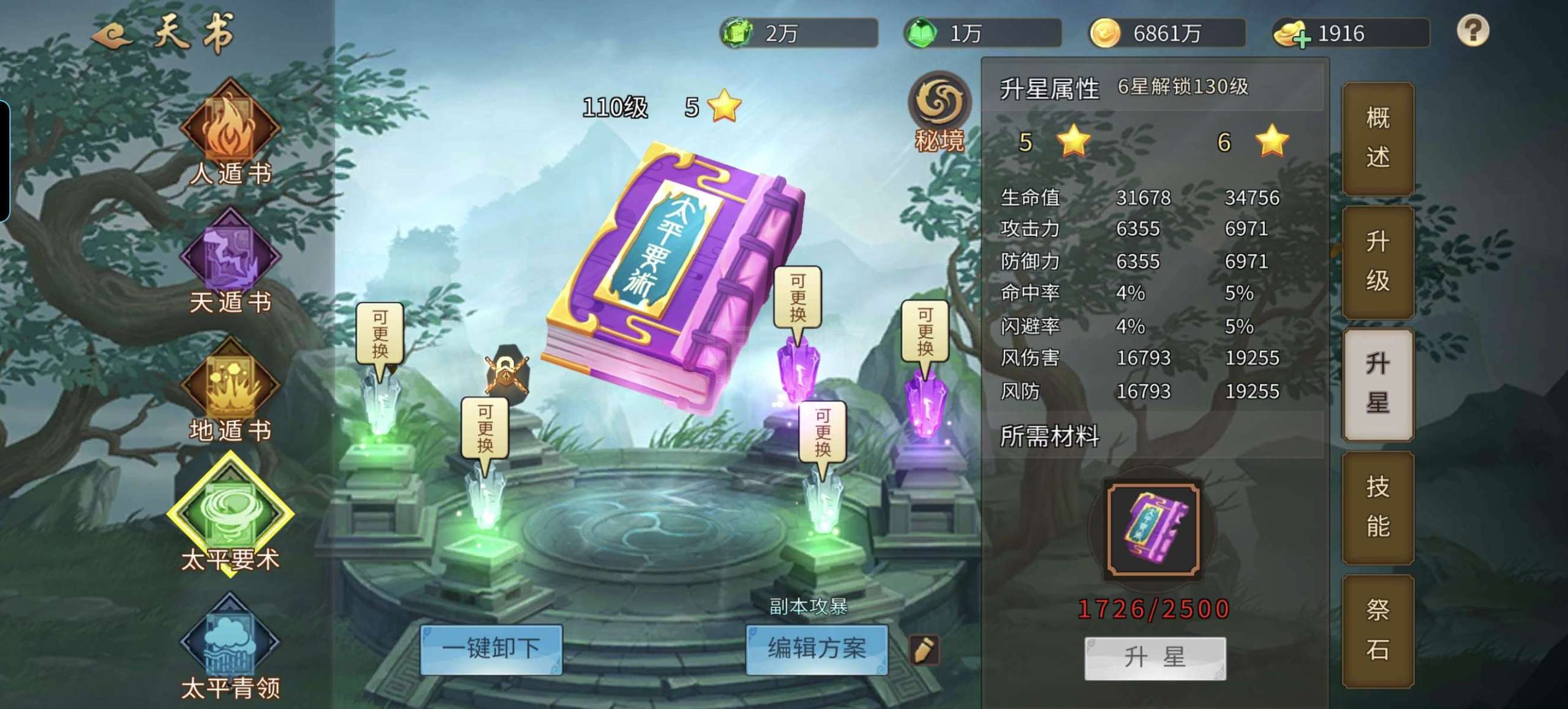 攻击力54,5个极品金色石头,火书7星,冰书6星,还有两本天书马上升级,兵法火三星。其他两星,