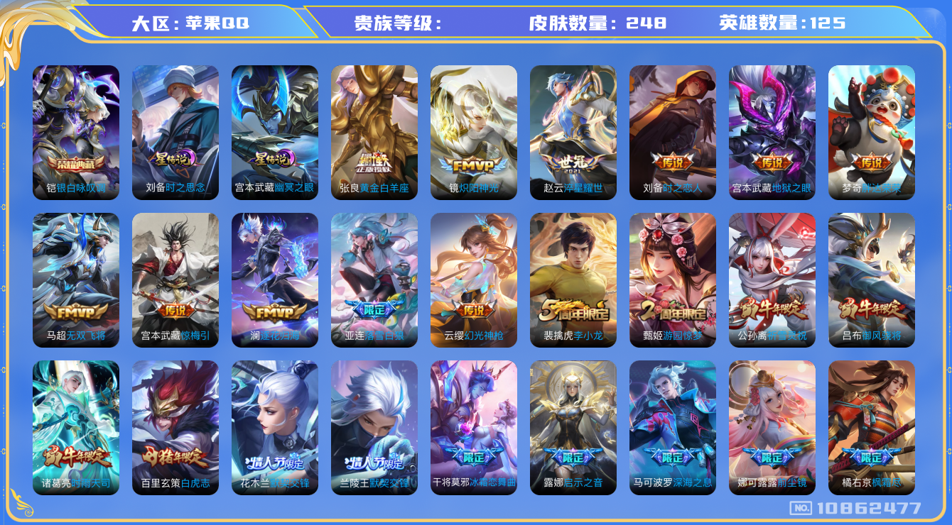 [10862477]国标50强赵怀真!248皮肤 1典藏 2星传说 24传说
