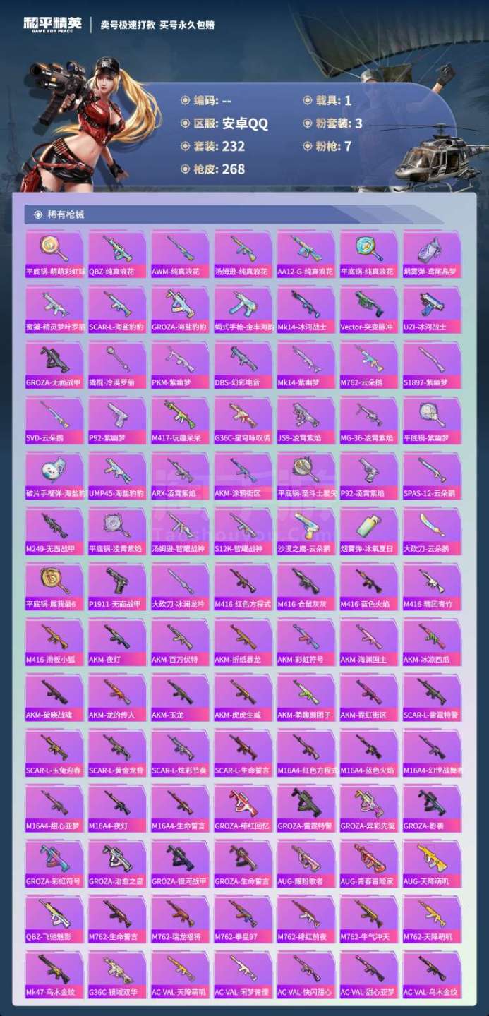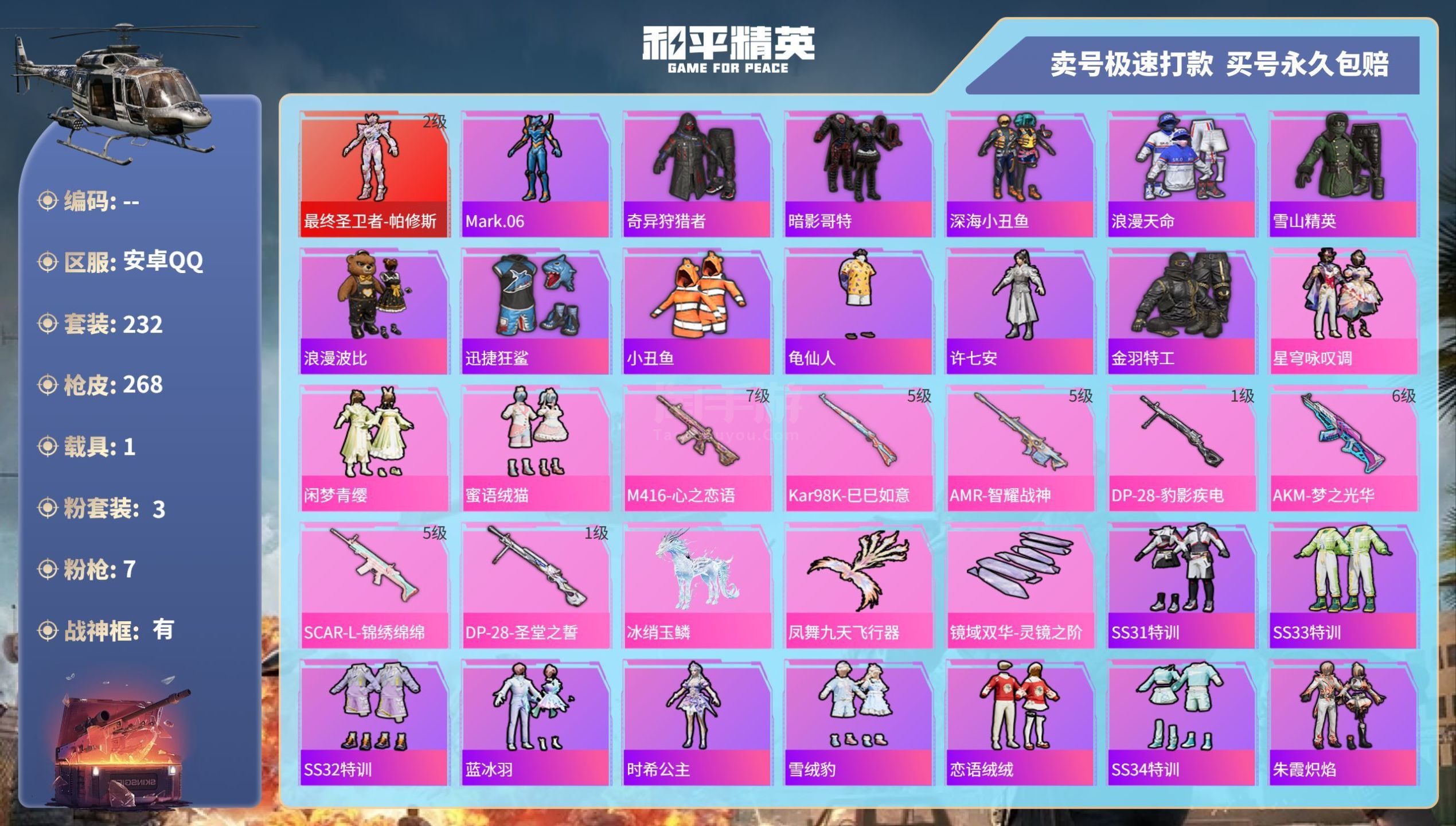 hs41017 安卓手Q-21王牌印记-有战神框-3粉装-7特效枪-1载具-81592热力值-232