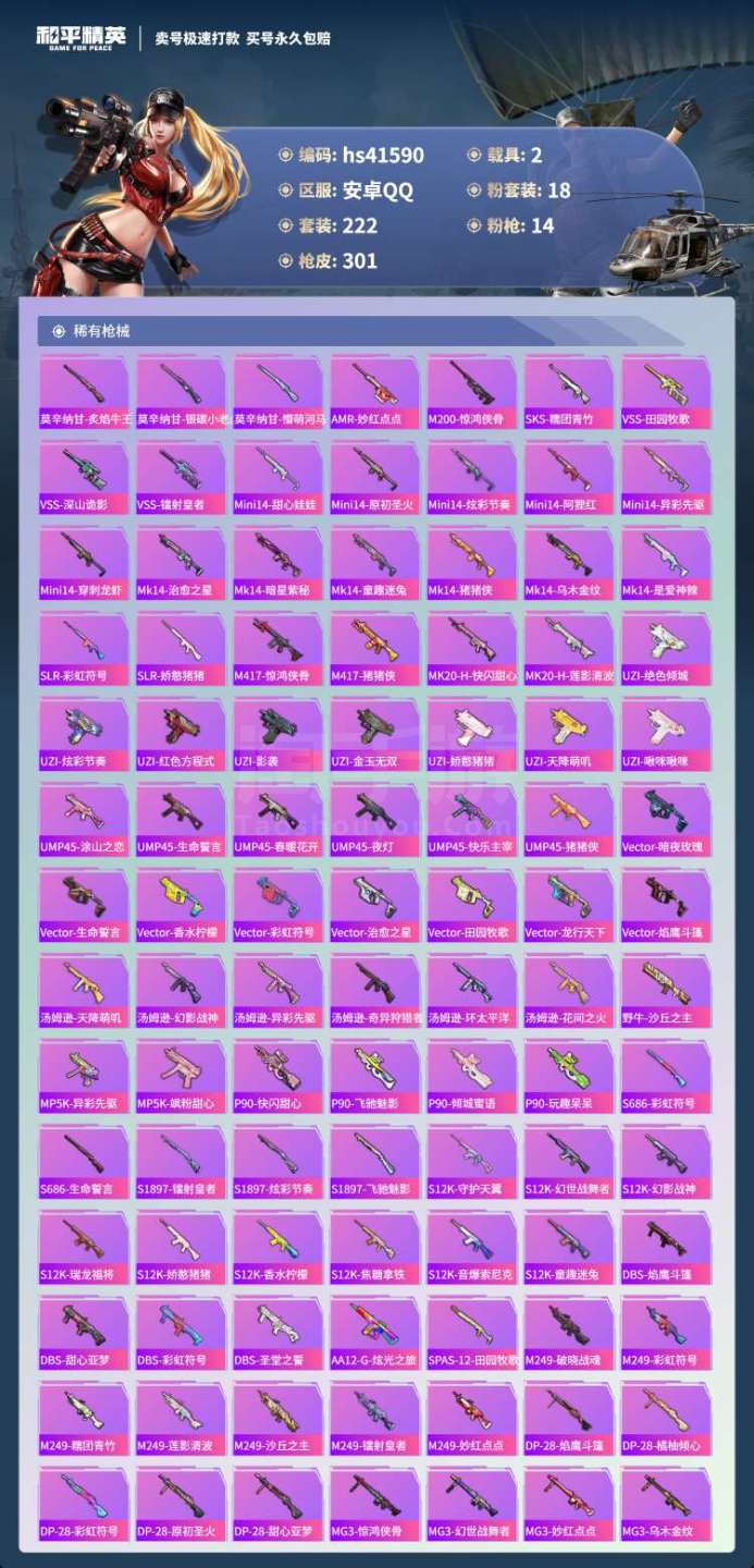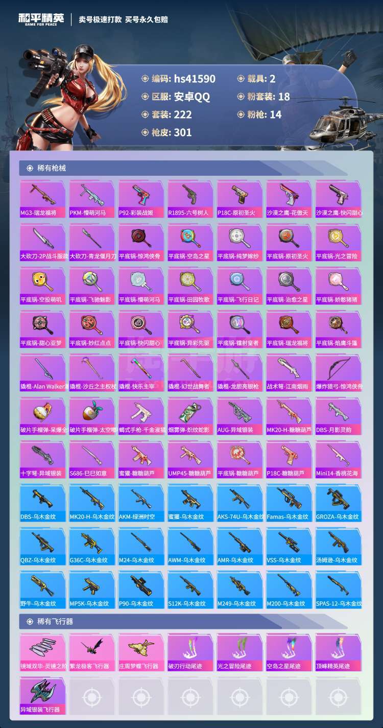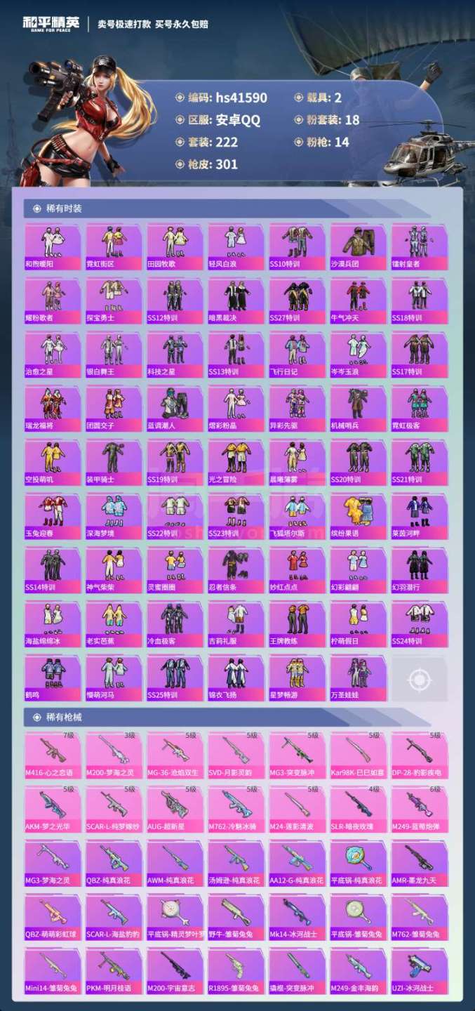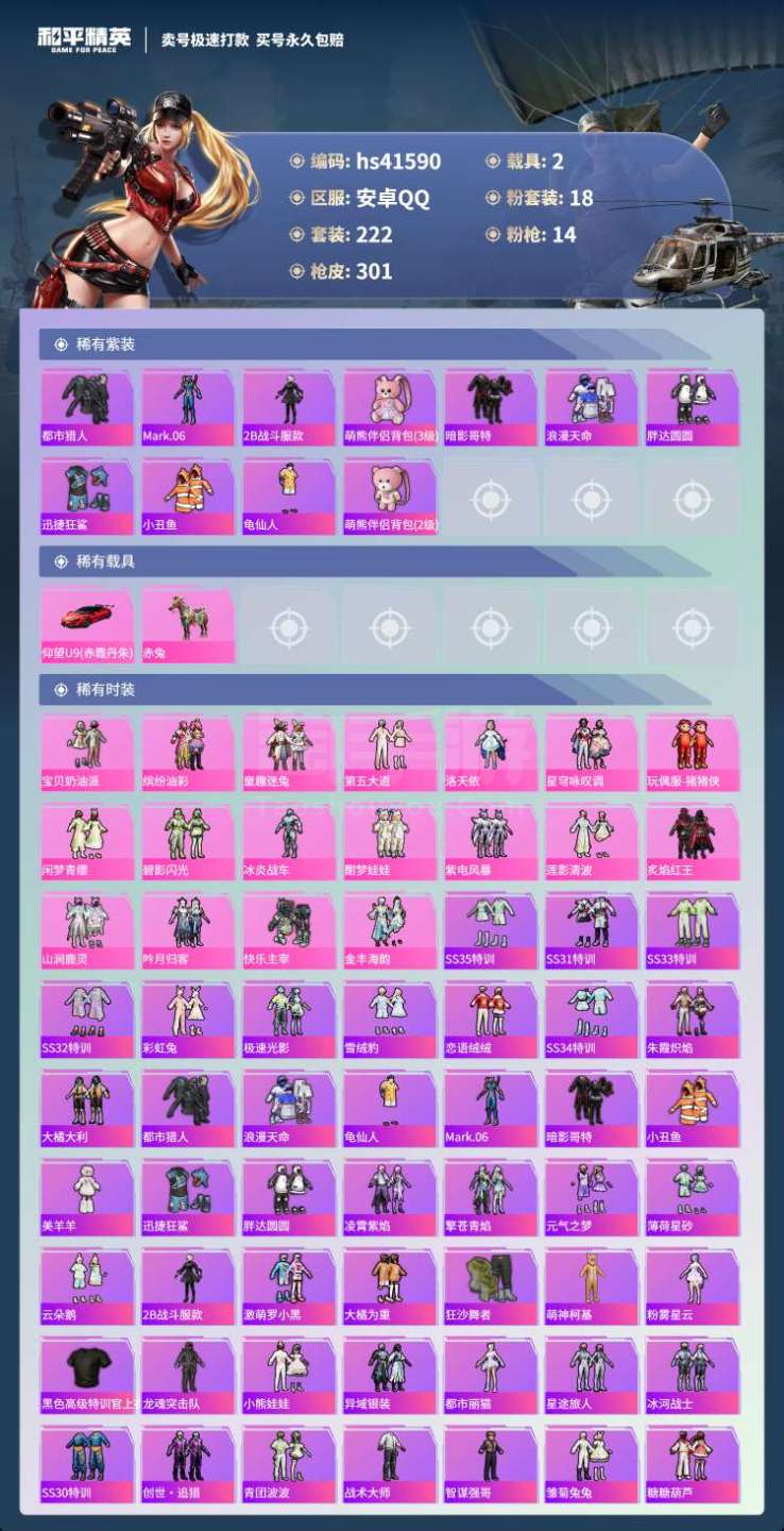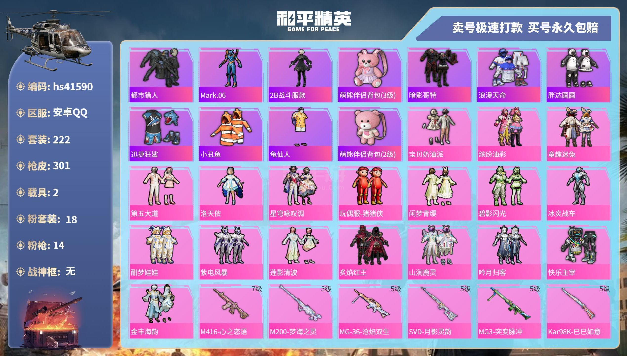 hs41590 安卓手Q-16王牌印记-18粉装-14特效枪-2载具-110661热力值-222套装