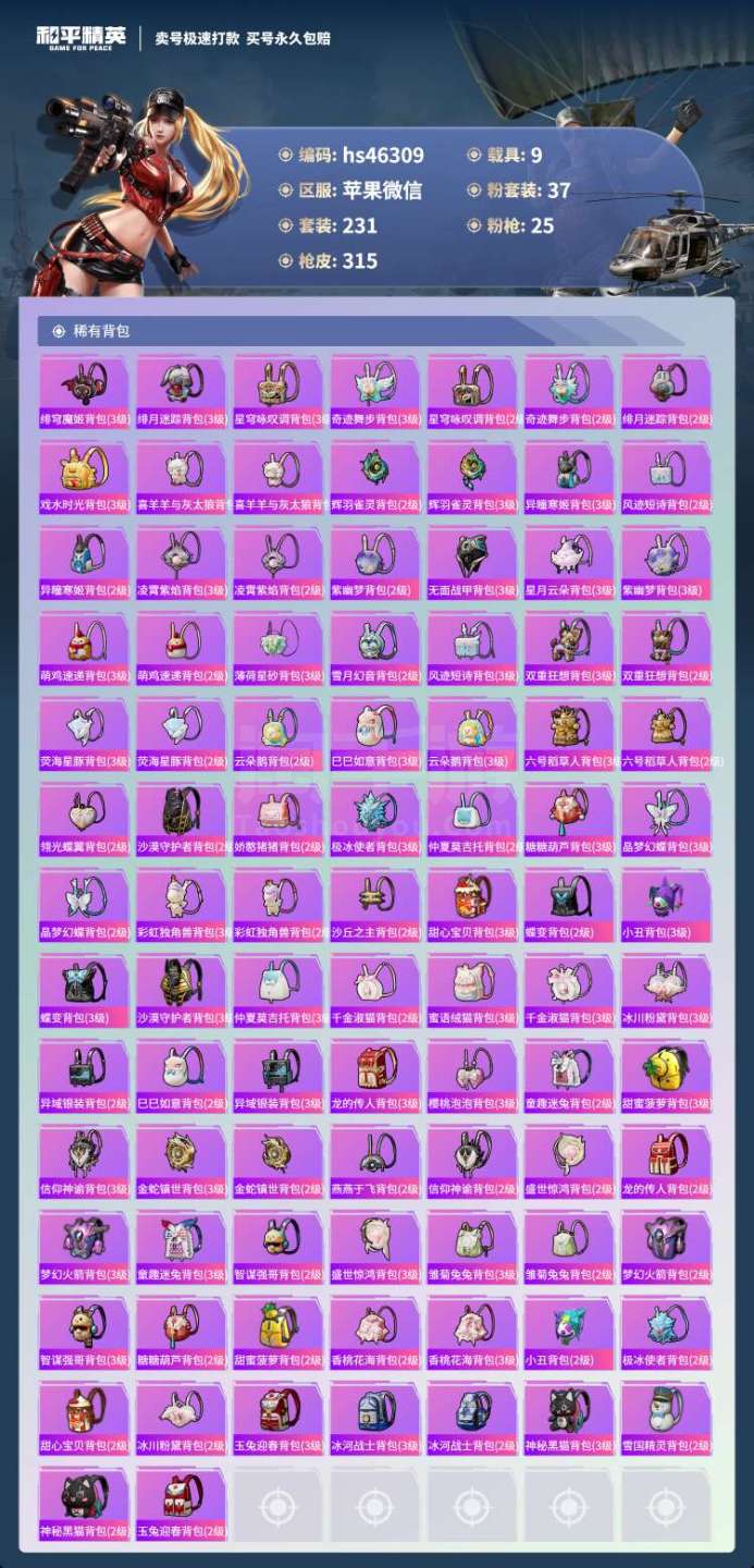 hs46309 苹果微-12王牌印记-有战神框-37粉装-25特效枪-9载具-121550热力值-