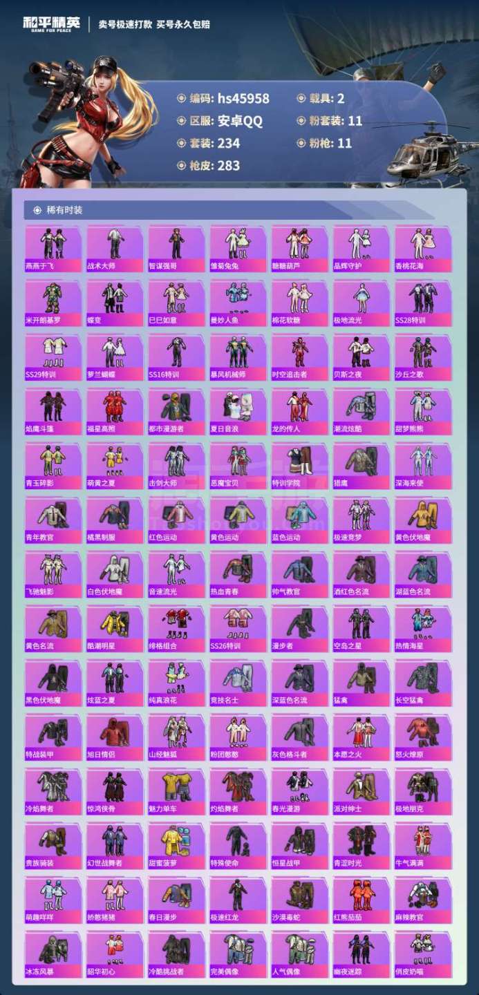 hs45958 安卓手Q-20王牌印记-有战神框-11粉装-11特效枪-2载具-101143热力值-