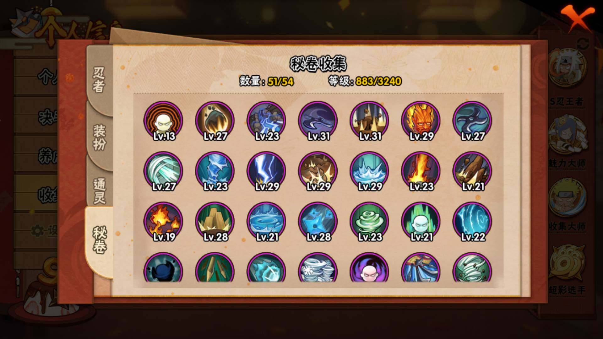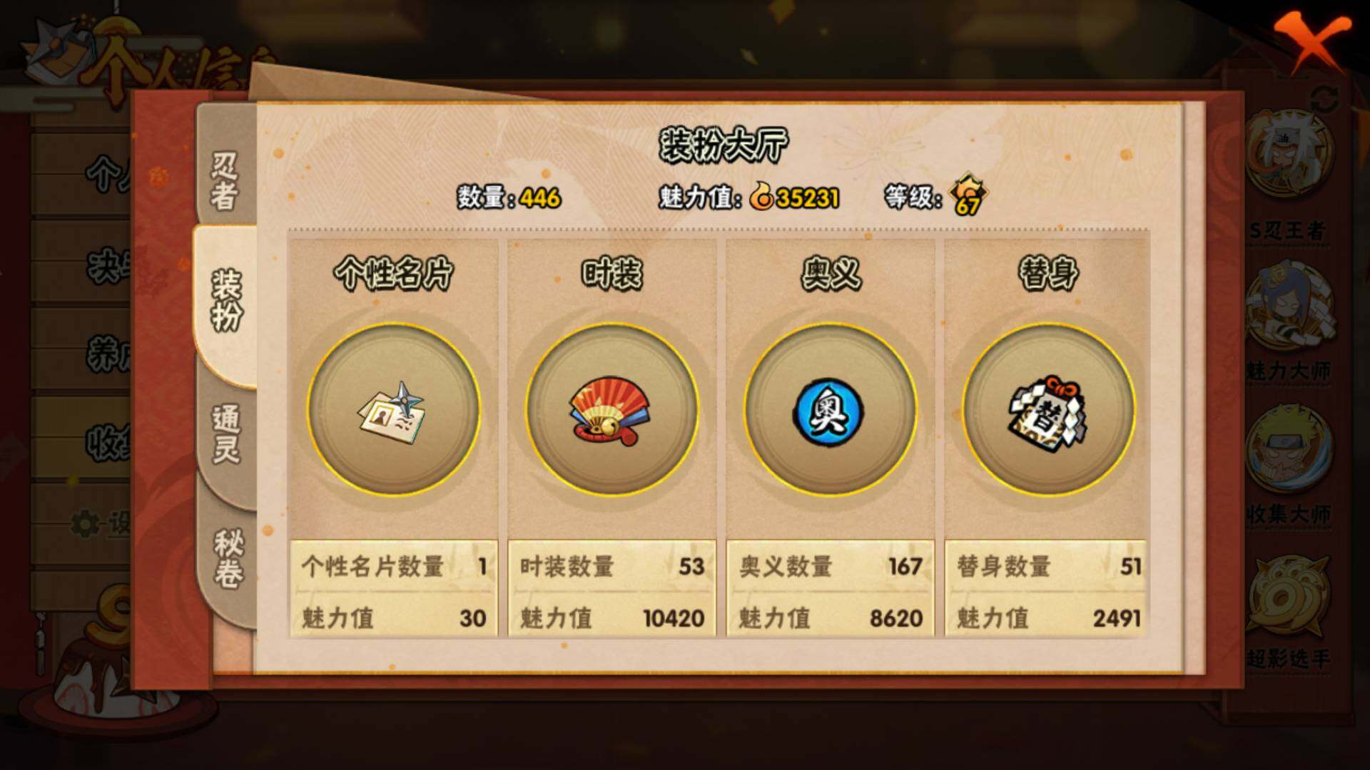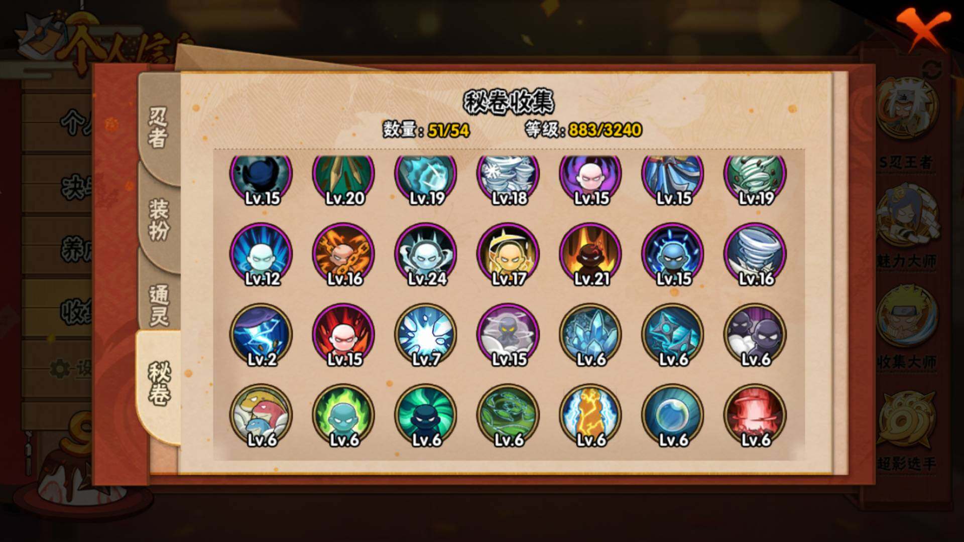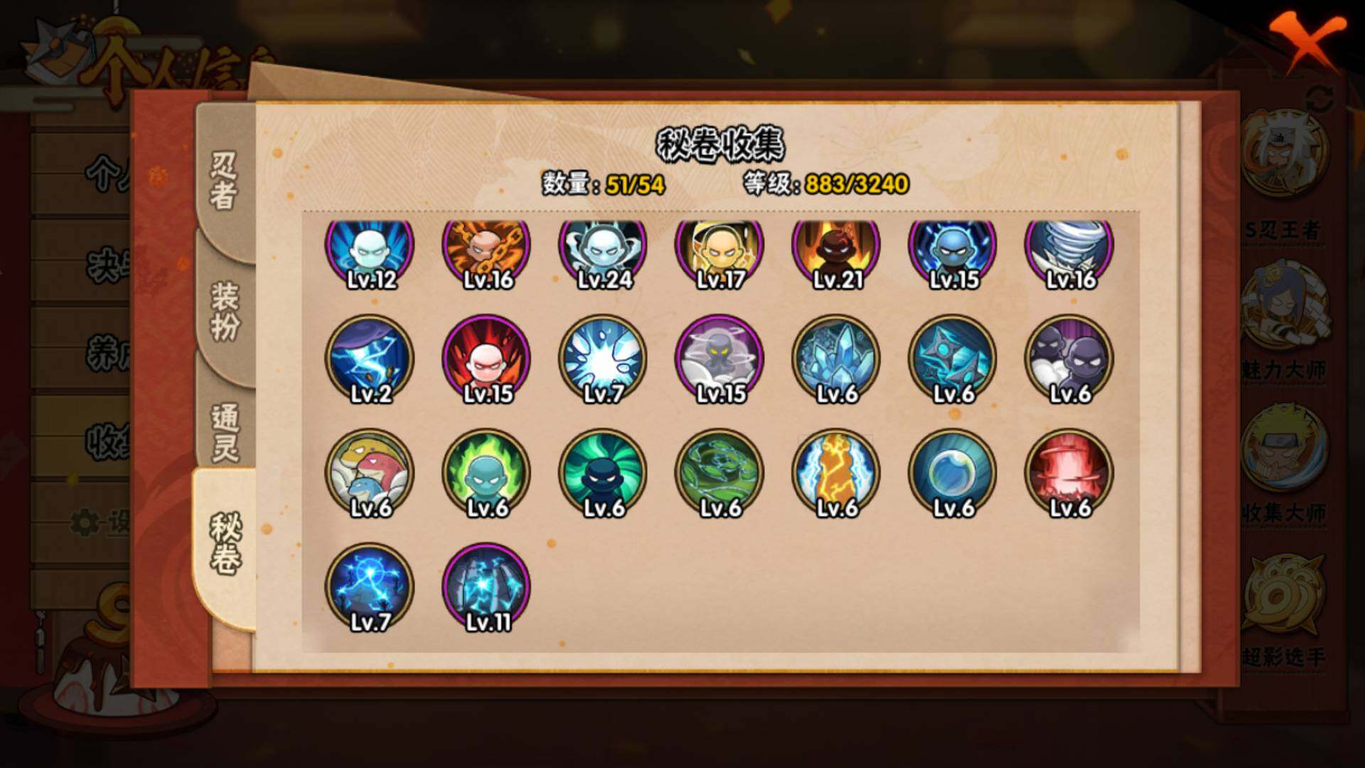 V15/2011万战力/总忍者393/49S/94A/差5个满S(烈斗44片/无影斑/仙人自来也/三代风影/大野木)/差8个满A(侠隐佐助/机械鸣人/忍战天天/三忍日斩/达鲁伊/青年三船/新春大蛇丸/忍战黄土)/4个传承奥义图/30通灵/51密卷/67级魅力值/1.3万金币/111点卷/24高招卷