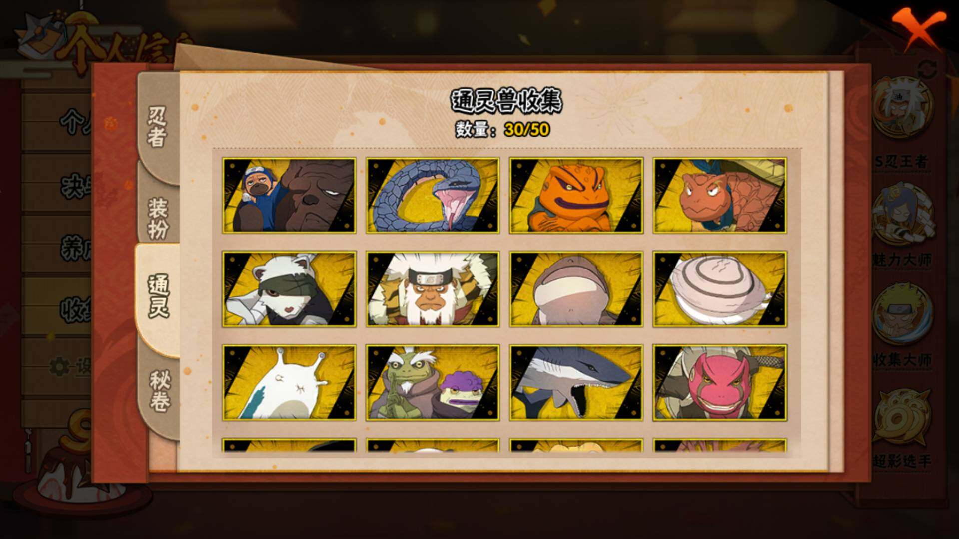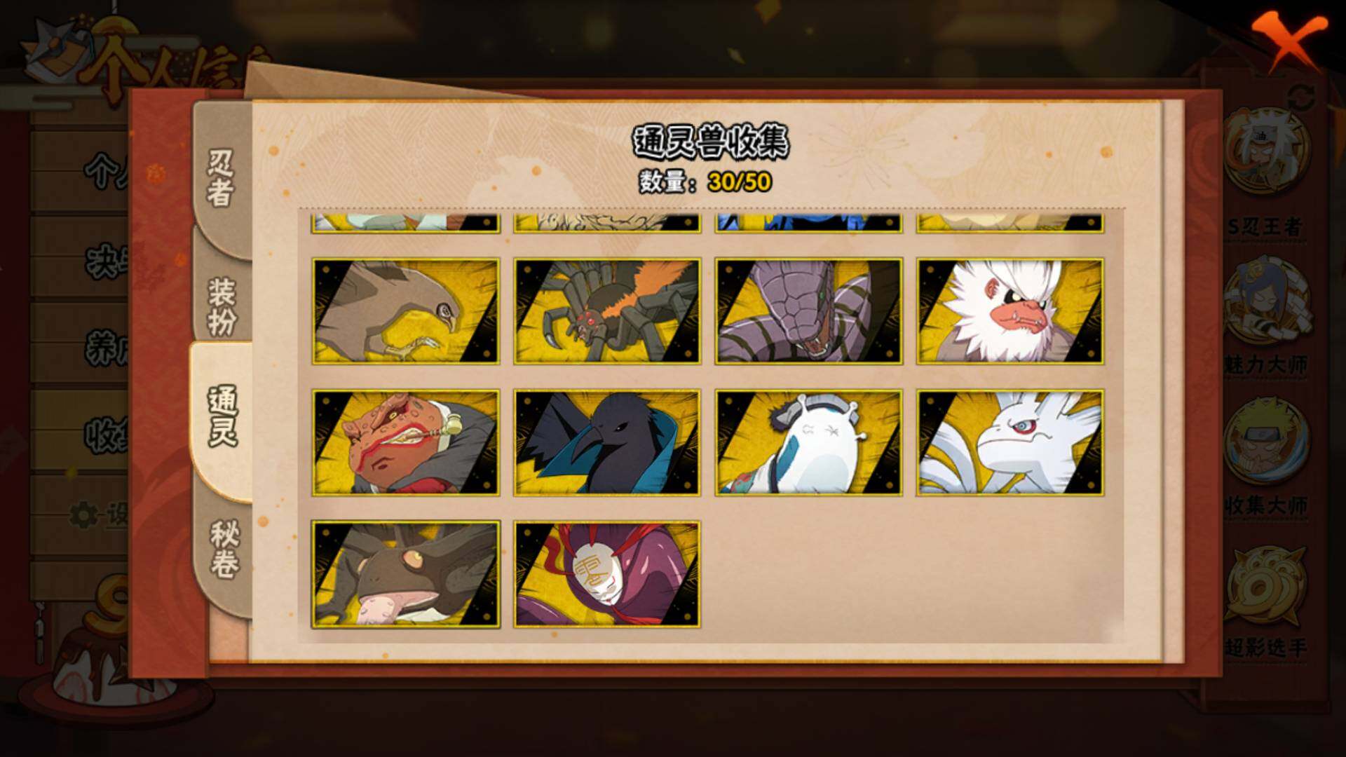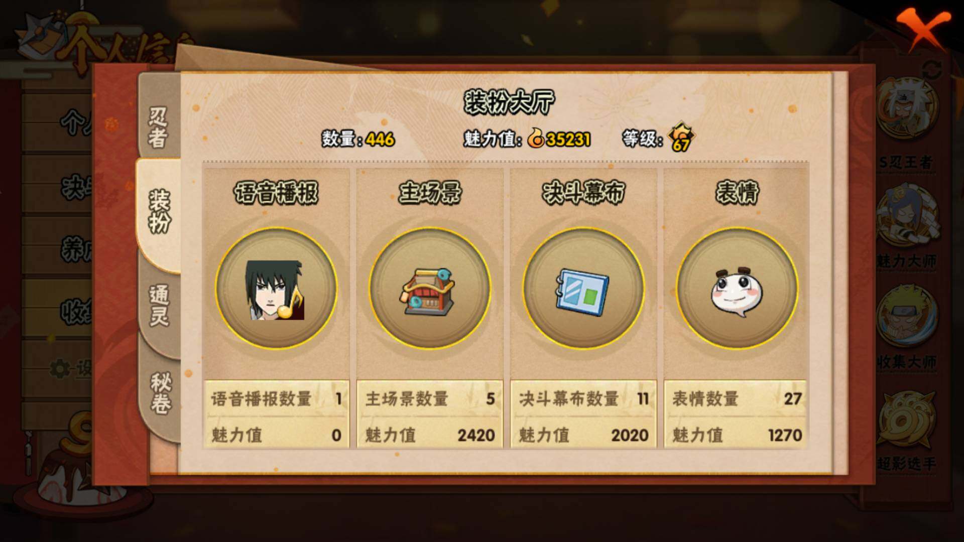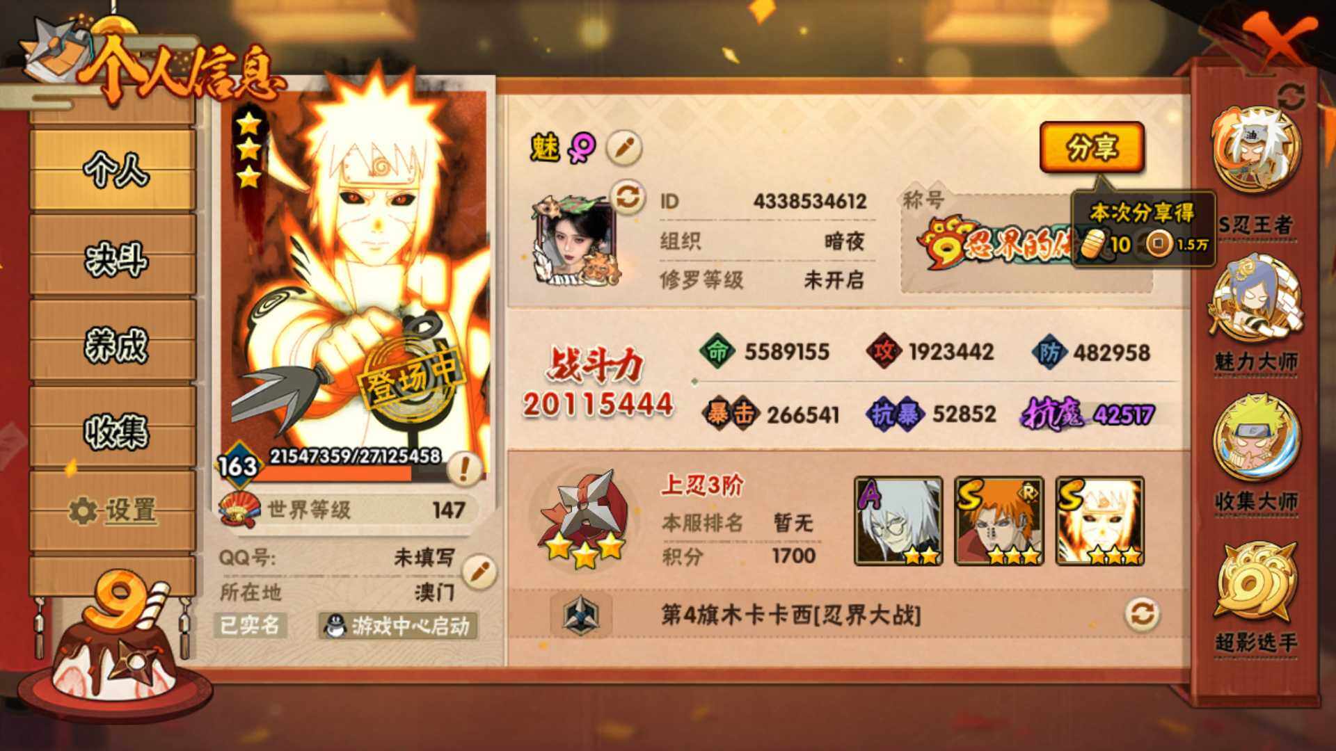 V15/2011万战力/总忍者393/49S/94A/差5个满S(烈斗44片/无影斑/仙人自来也/三代风影/大野木)/差8个满A(侠隐佐助/机械鸣人/忍战天天/三忍日斩/达鲁伊/青年三船/新春大蛇丸/忍战黄土)/4个传承奥义图/30通灵/51密卷/67级魅力值/1.3万金币/111点卷/24高招卷