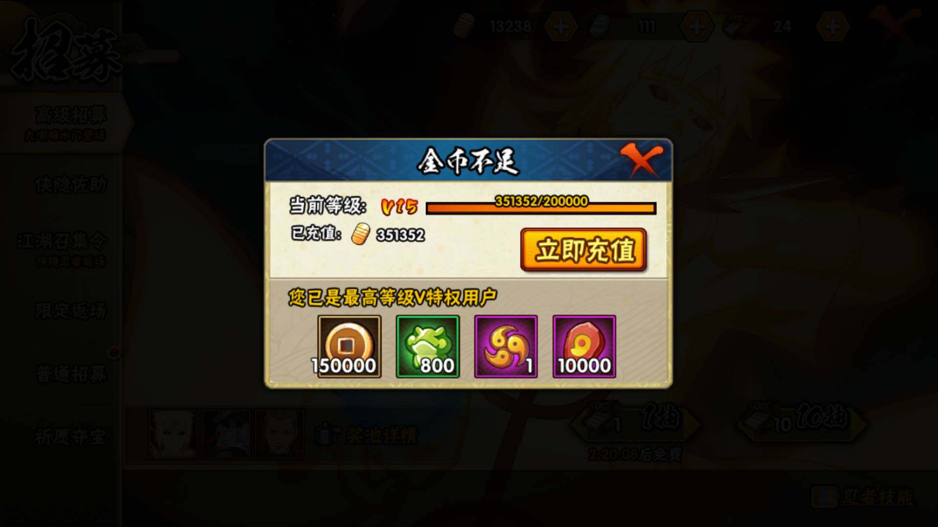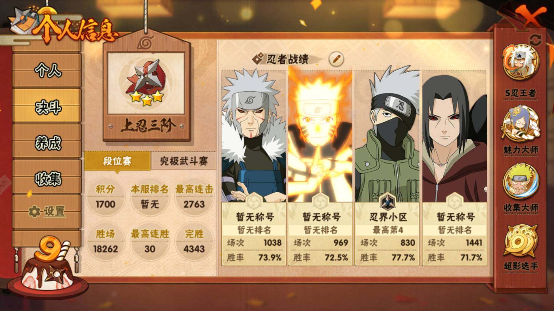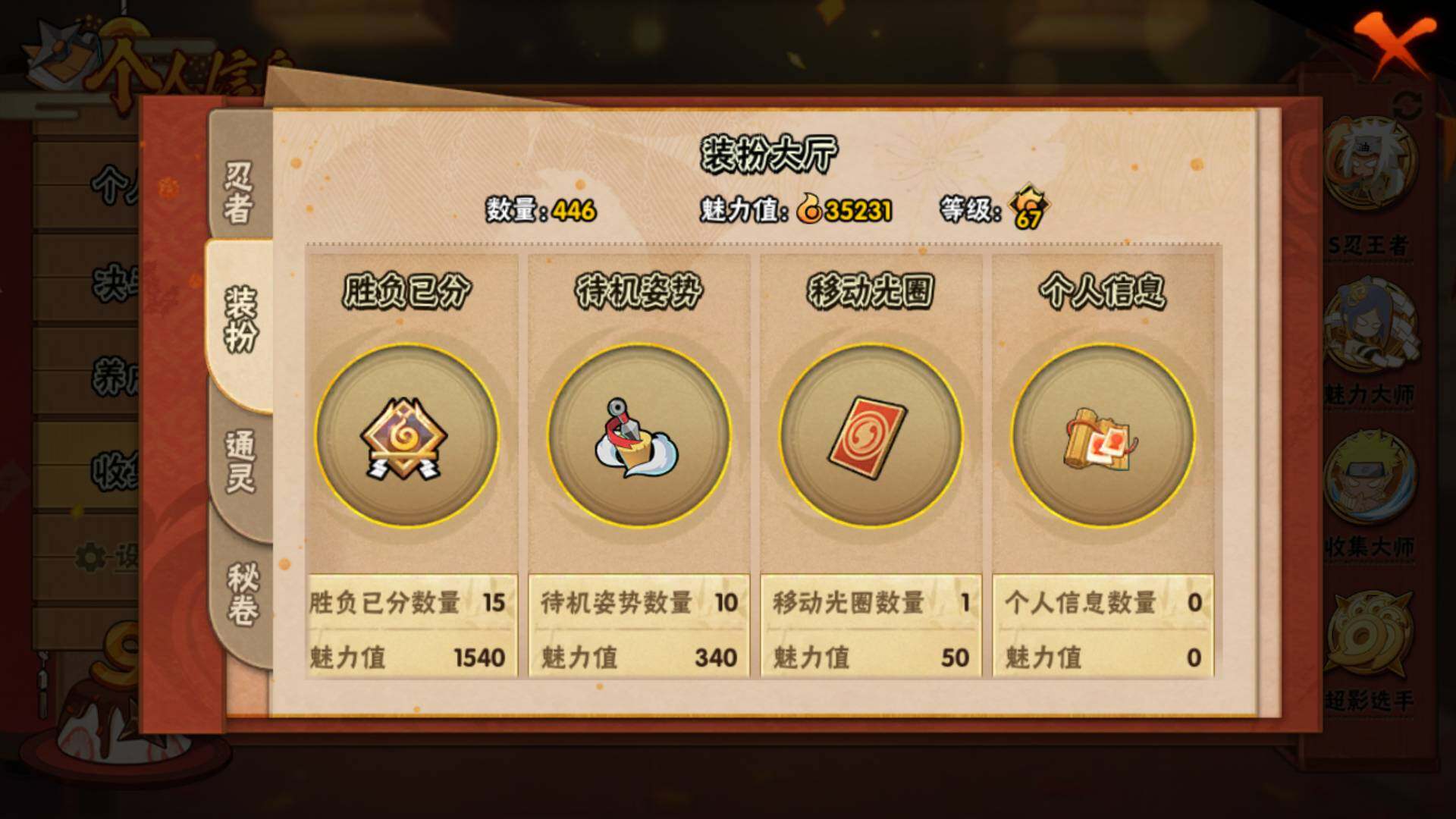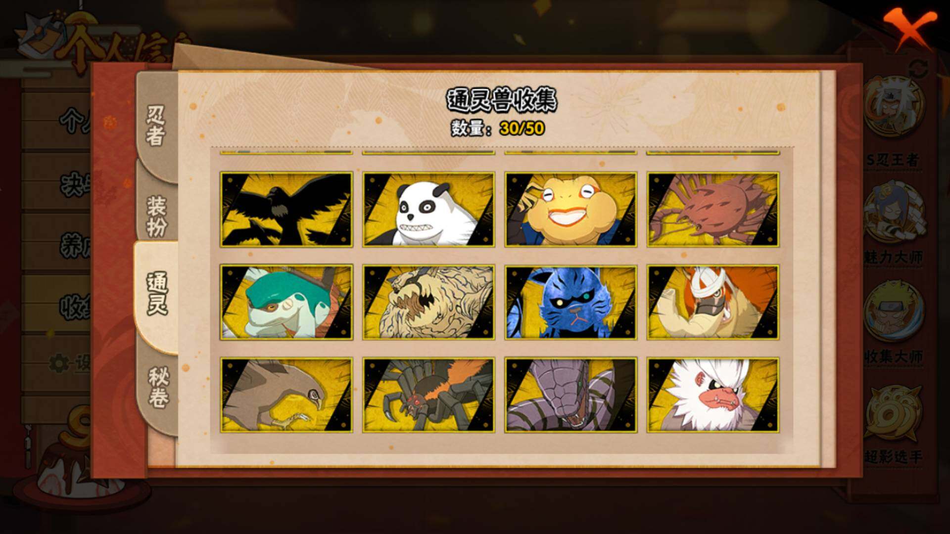 V15/2011万战力/总忍者393/49S/94A/差5个满S(烈斗44片/无影斑/仙人自来也/三代风影/大野木)/差8个满A(侠隐佐助/机械鸣人/忍战天天/三忍日斩/达鲁伊/青年三船/新春大蛇丸/忍战黄土)/4个传承奥义图/30通灵/51密卷/67级魅力值/1.3万金币/111点卷/24高招卷