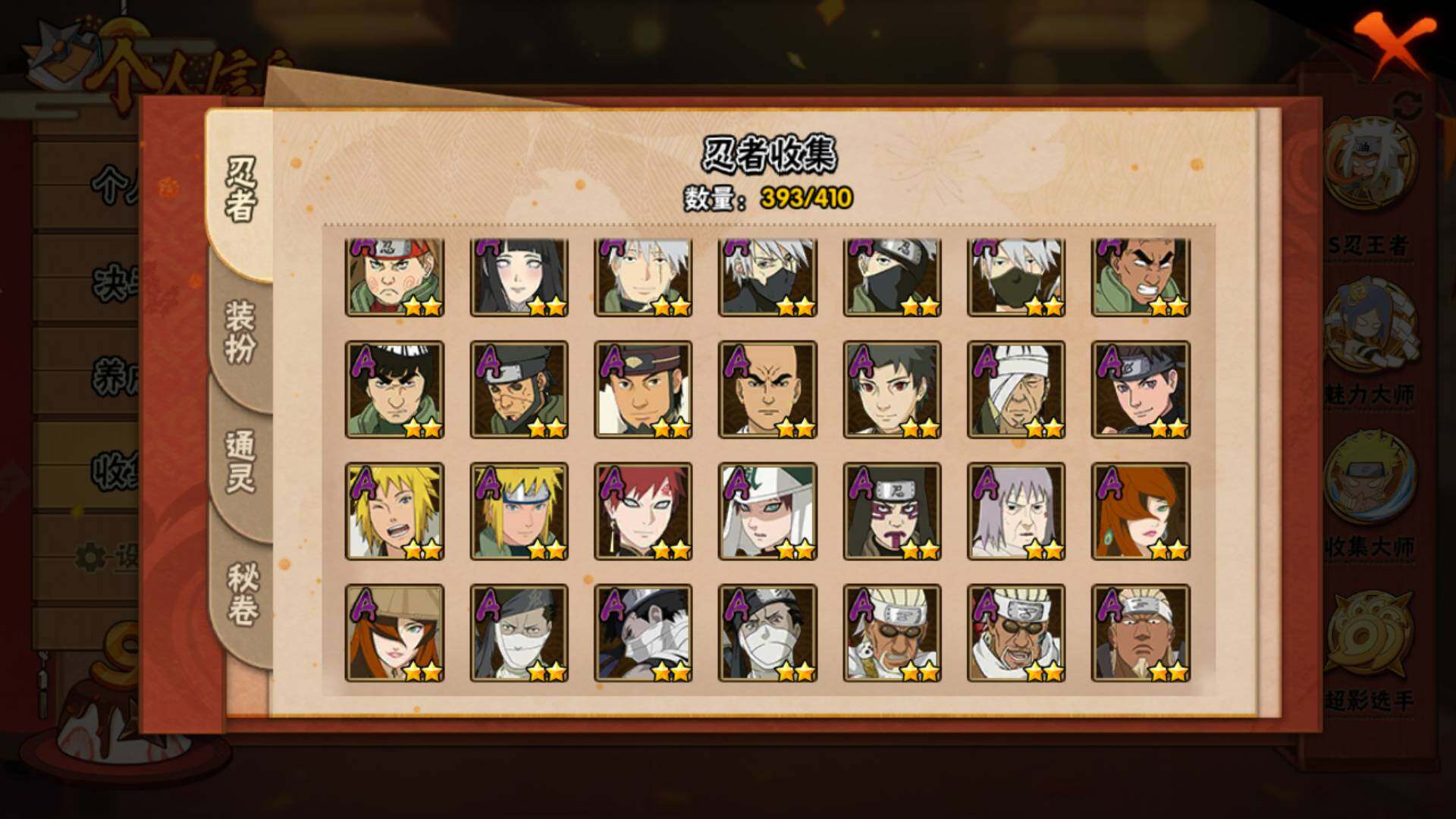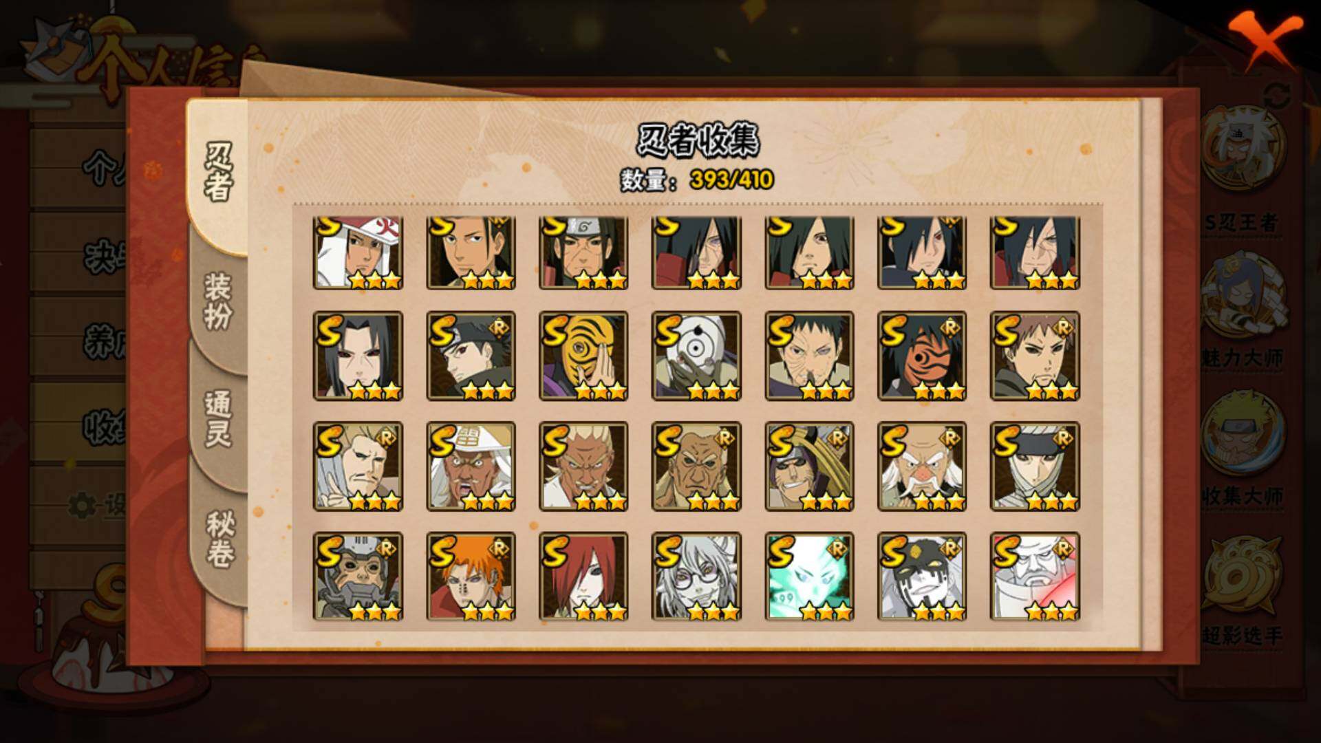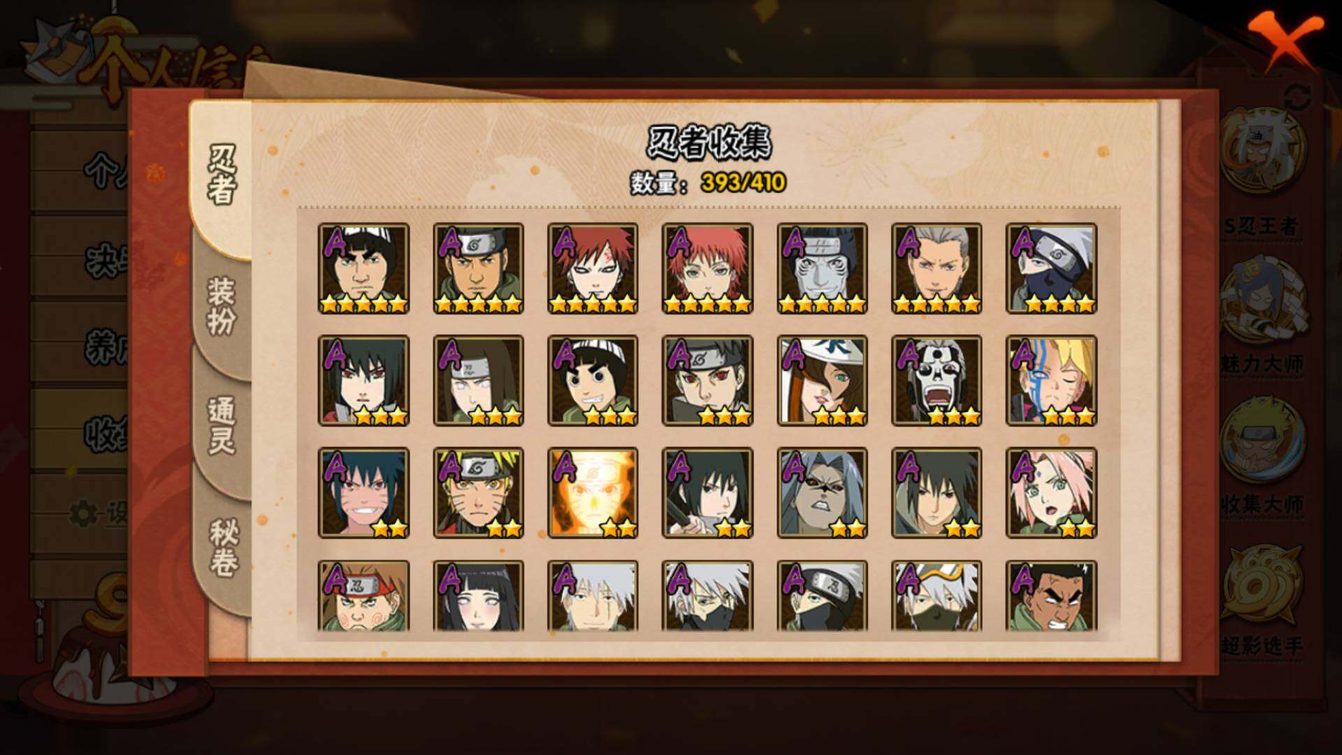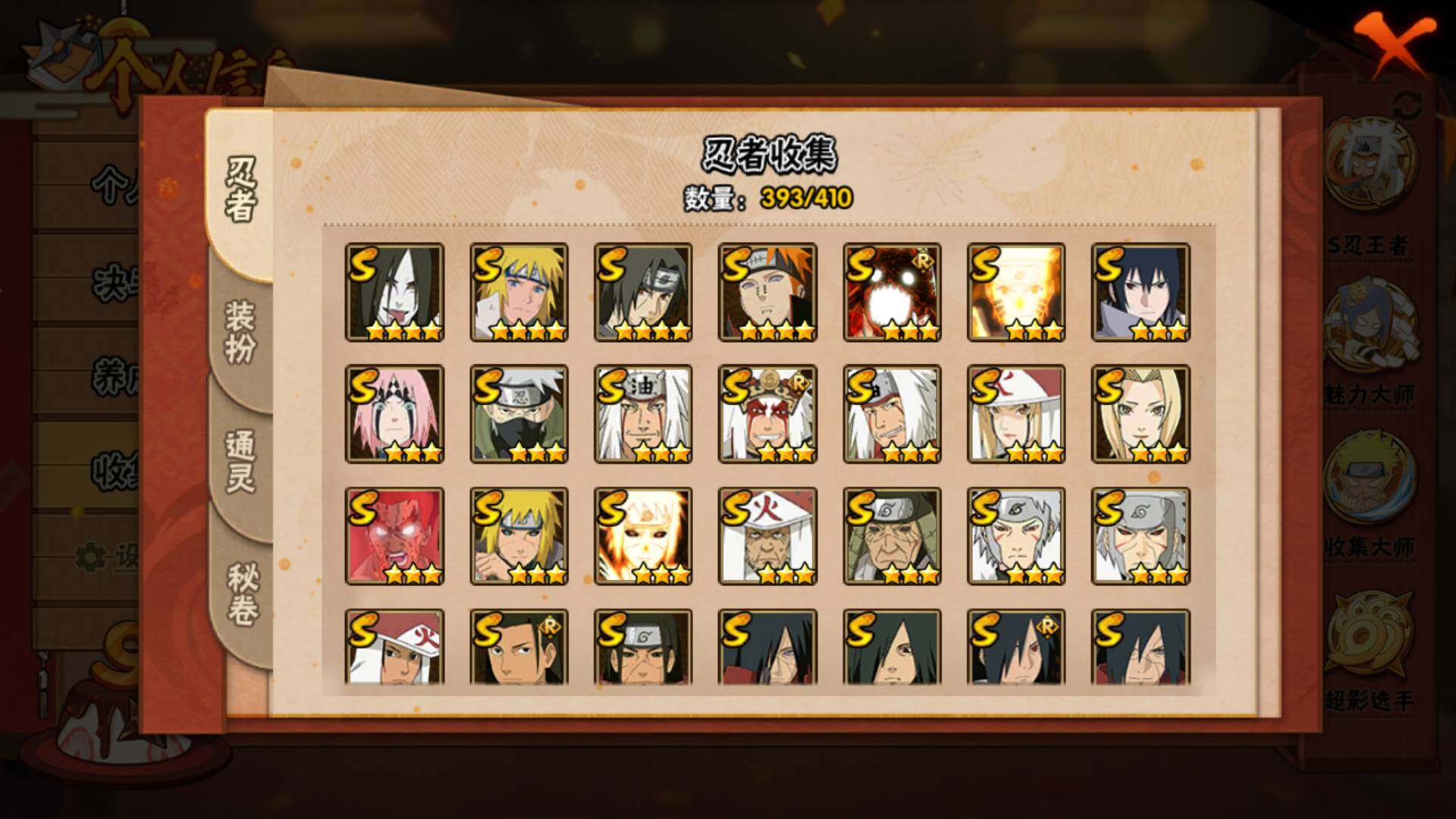 火影忍者【安卓QQ】V15/2011万战力/总忍者393/49S/94A/差5个满S(烈斗44片/