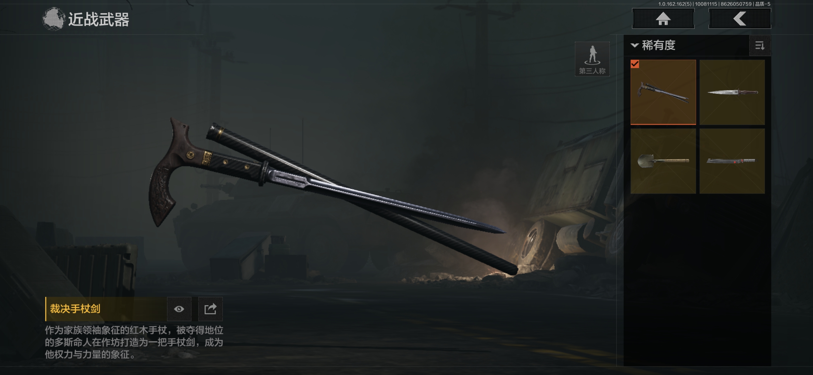 FY5595,总资产80m,近战武器:裁决手杖剑,突击匕首,来战·开山刀,角色装扮(紫):王国卫队礼
