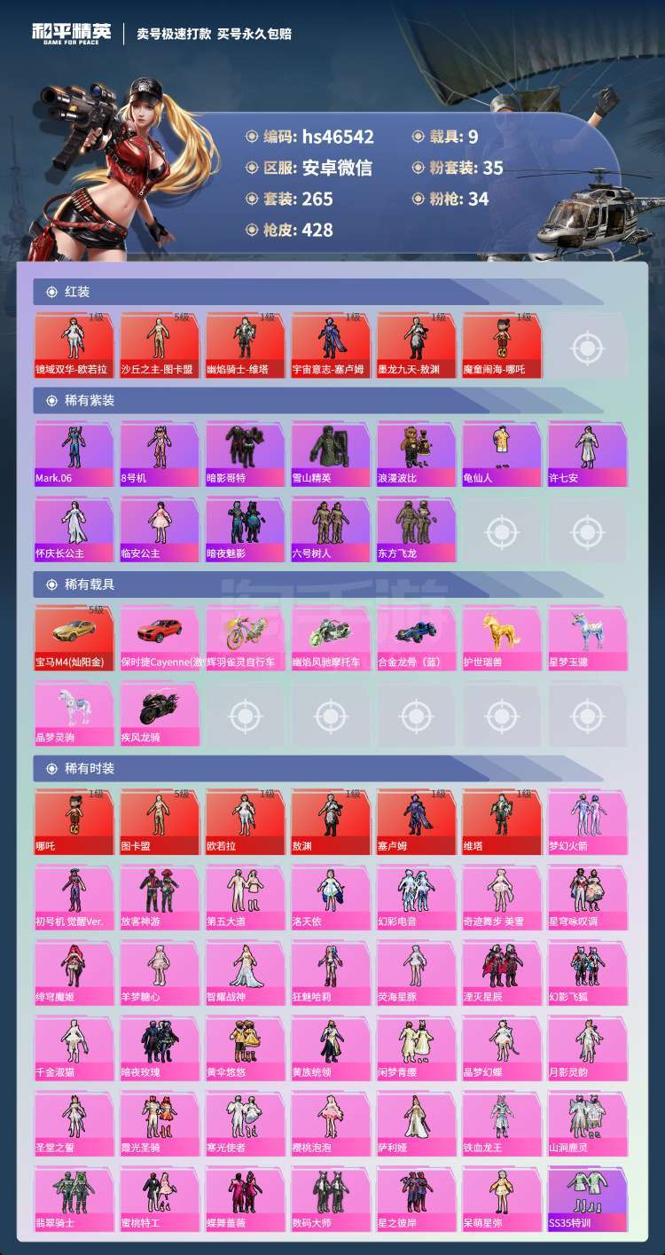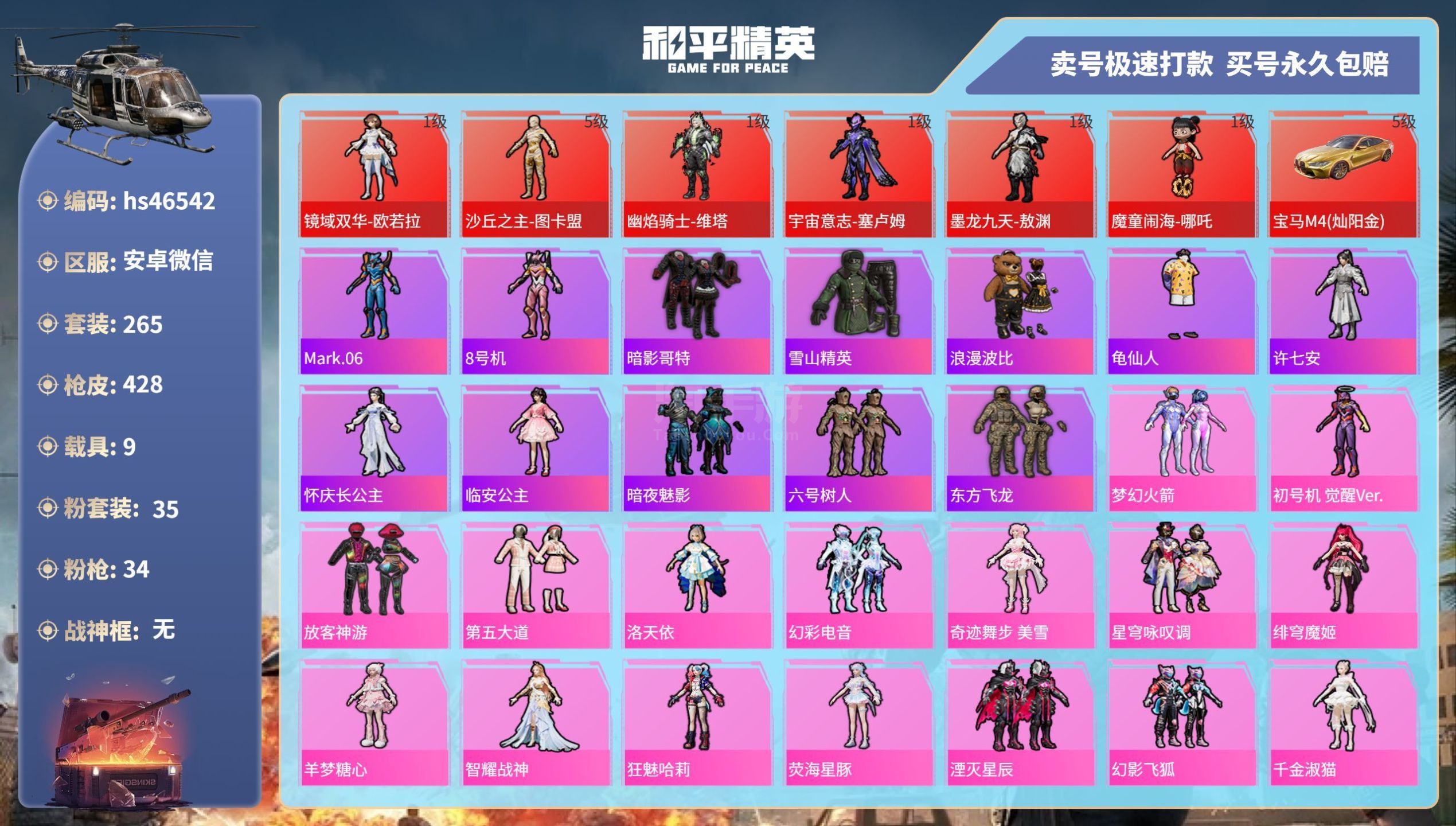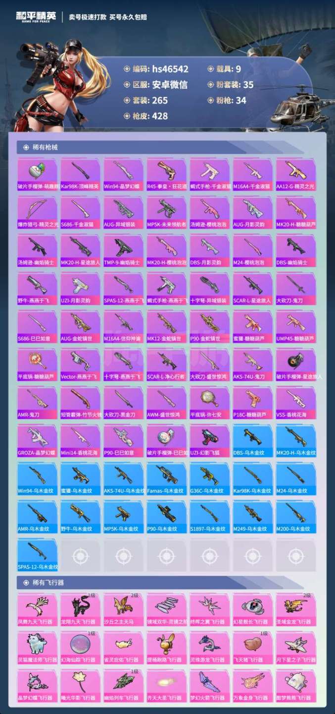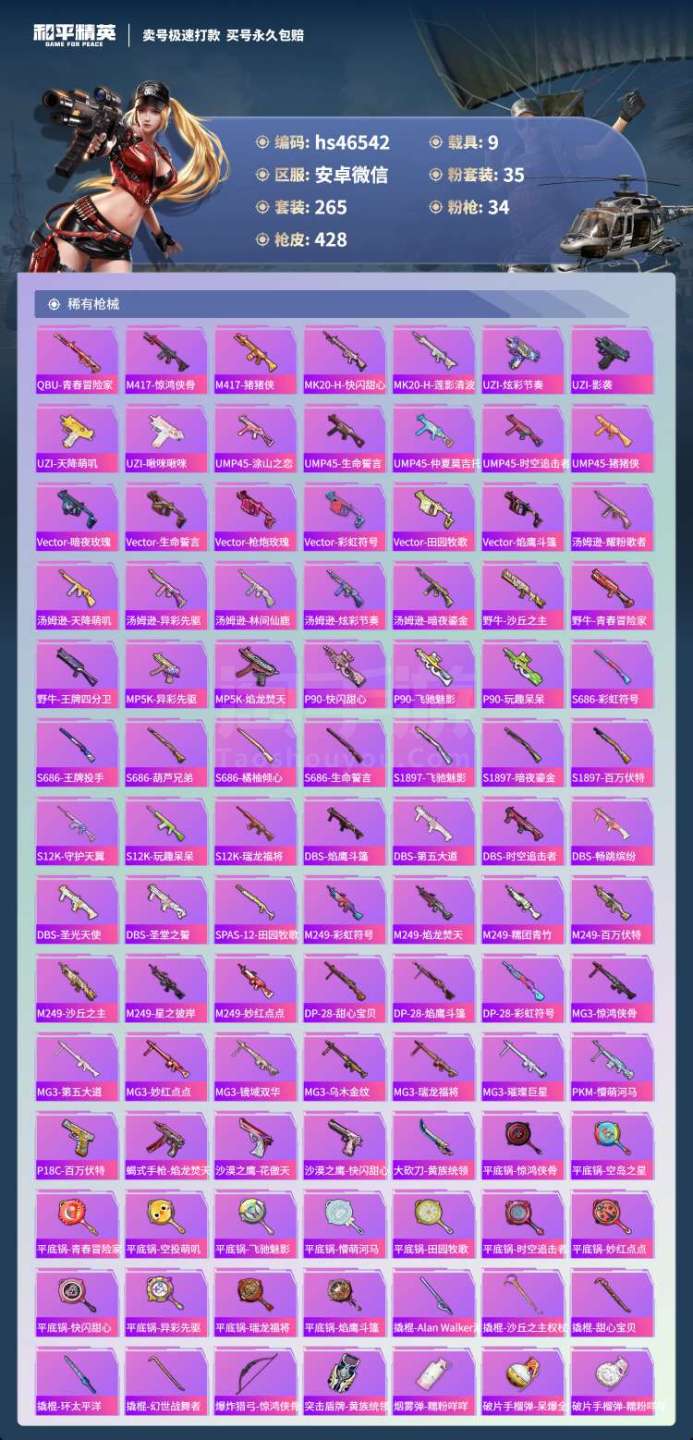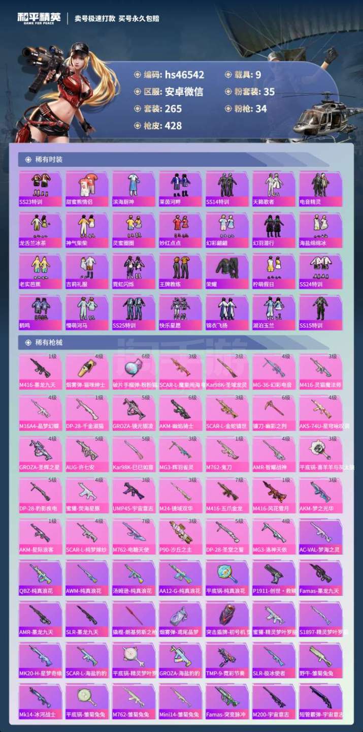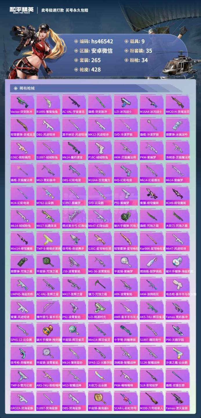 和平精英【安卓微信】hs46542 安卓v-16王牌印记-35粉装-34特效枪-9载具-190899热力值-265套装