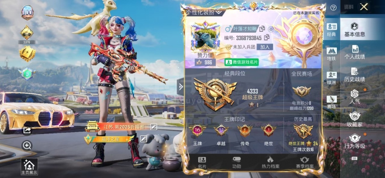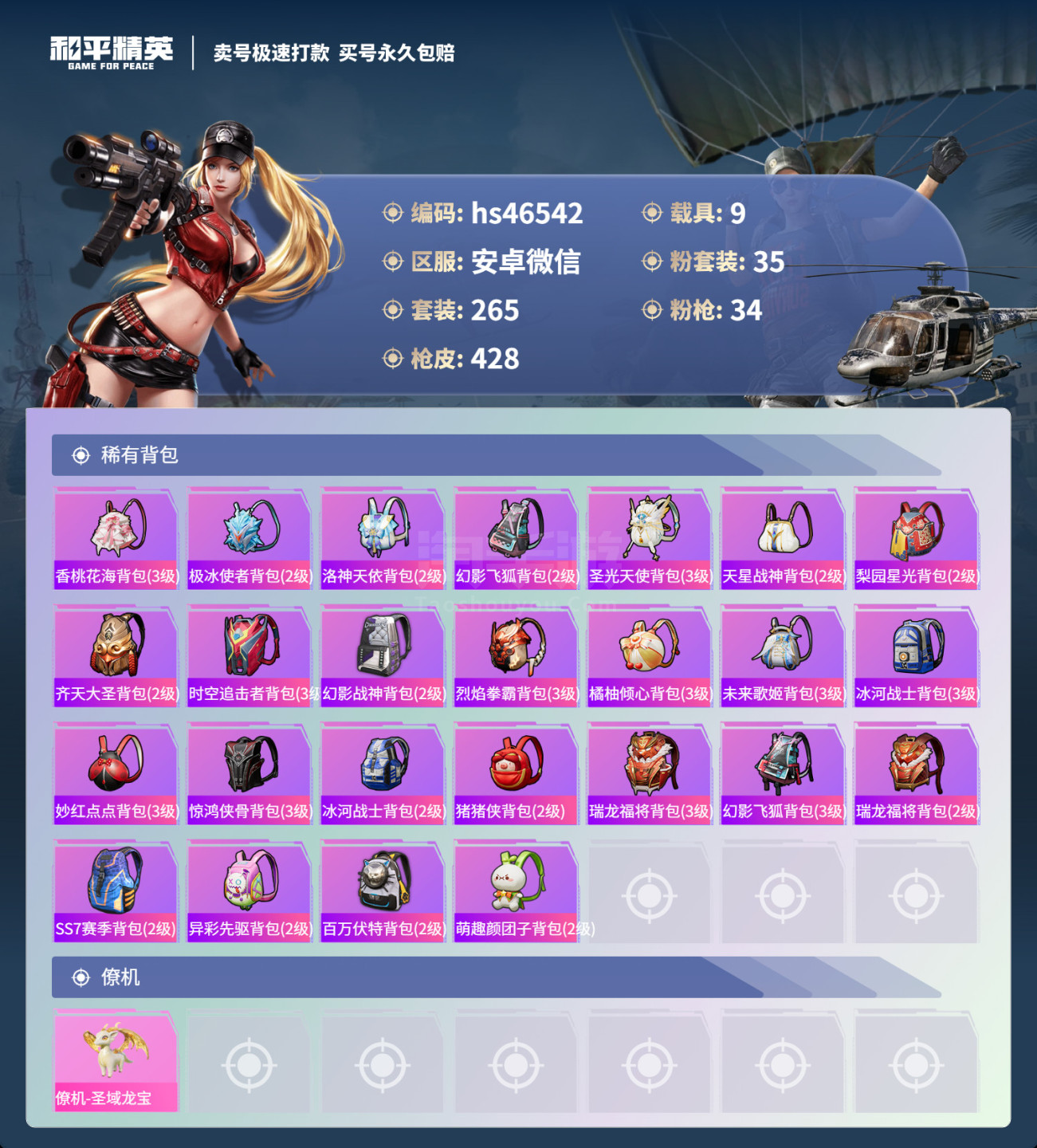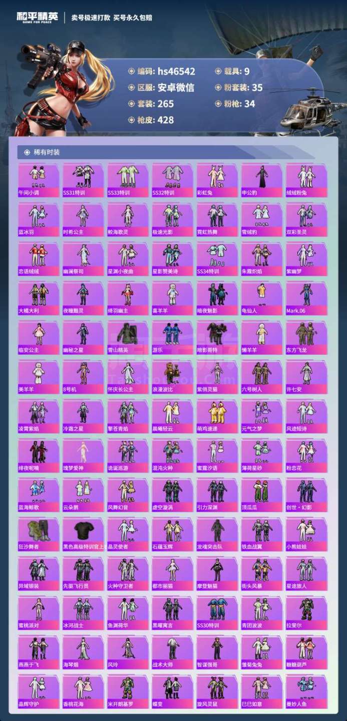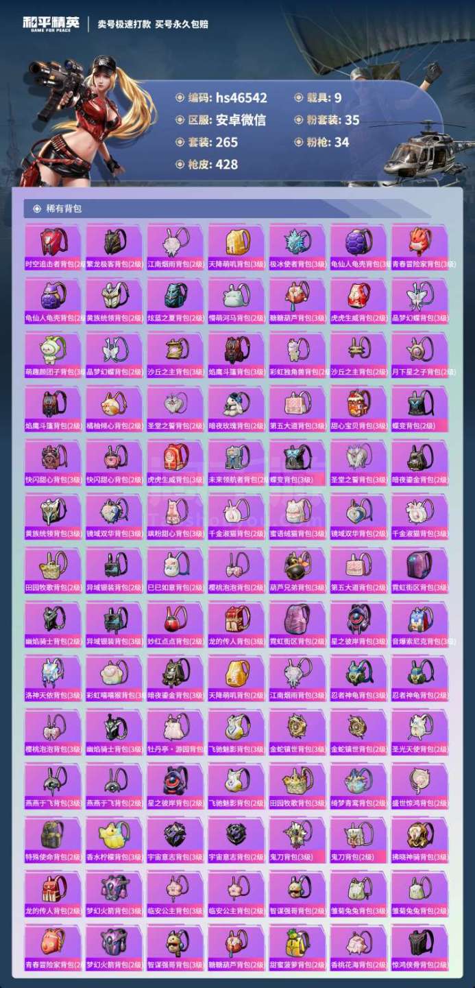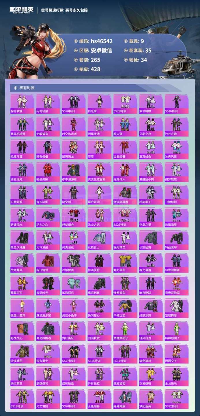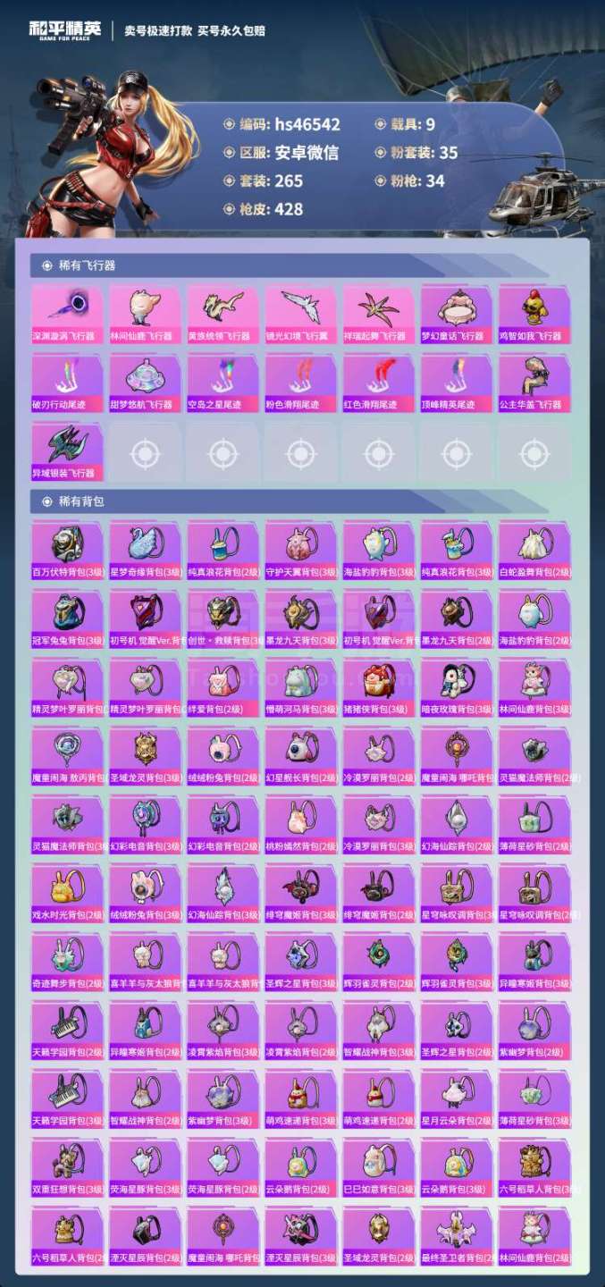 和平精英【安卓微信】hs46542 安卓v-16王牌印记-35粉装-34特效枪-9载具-190899热力值-265套装