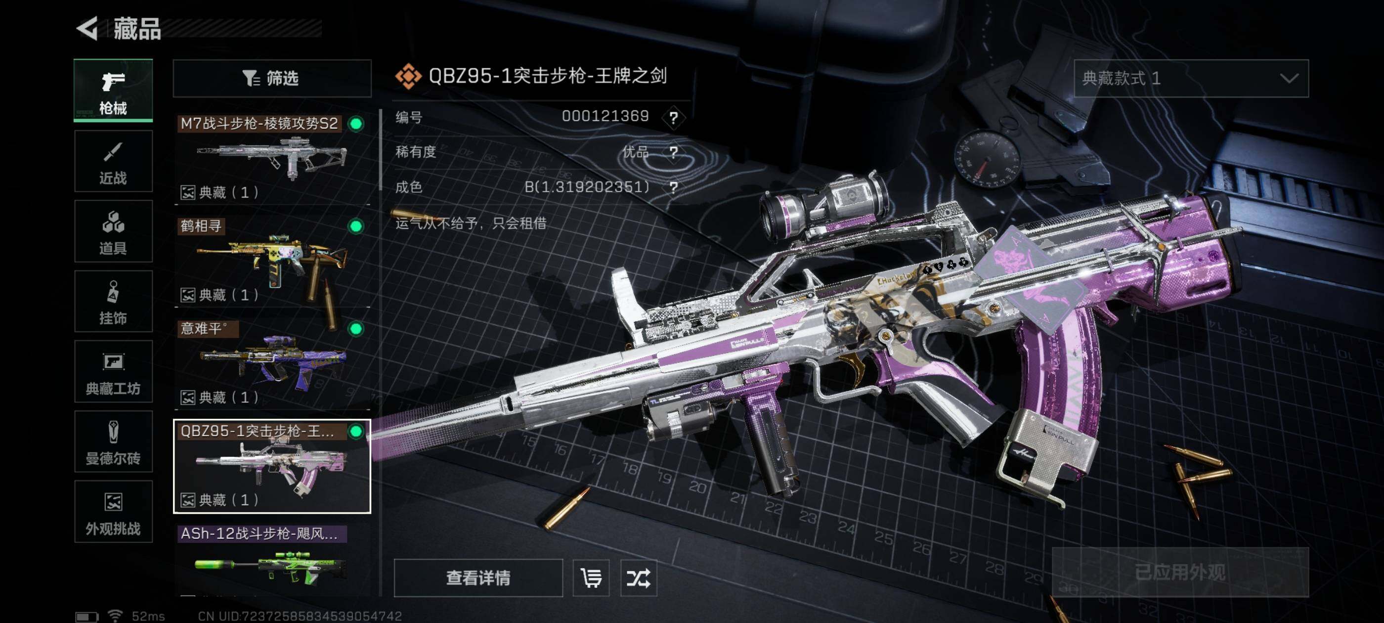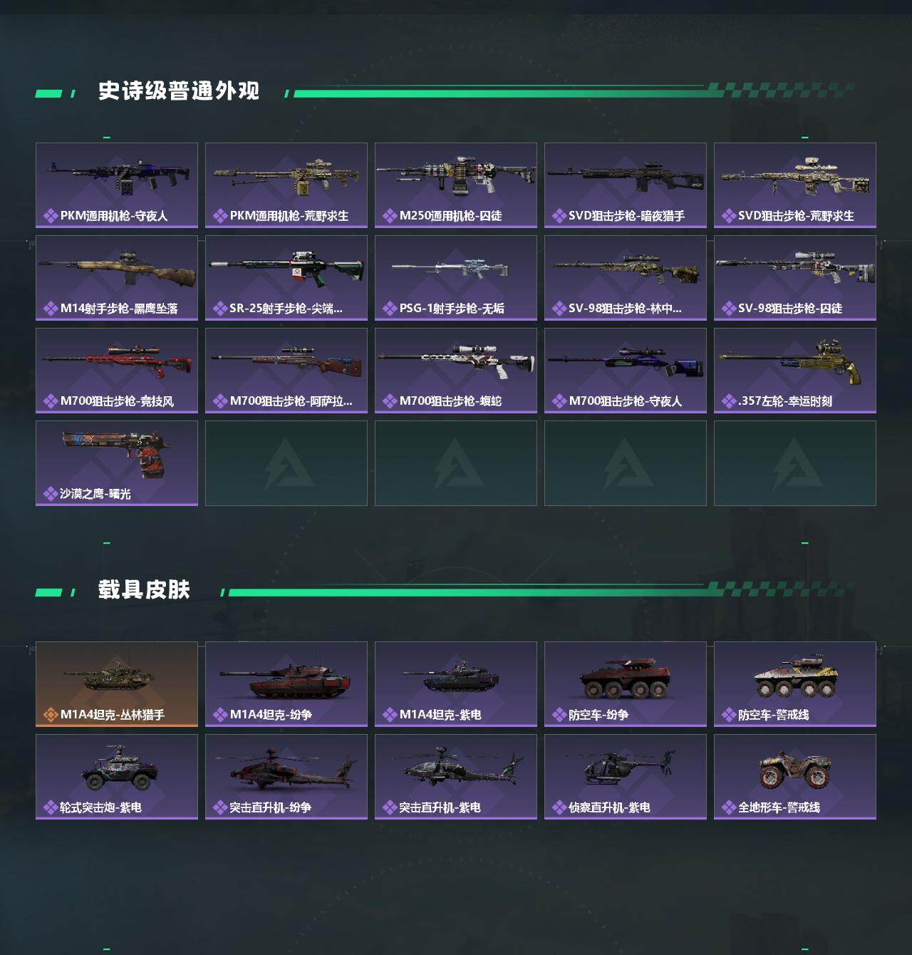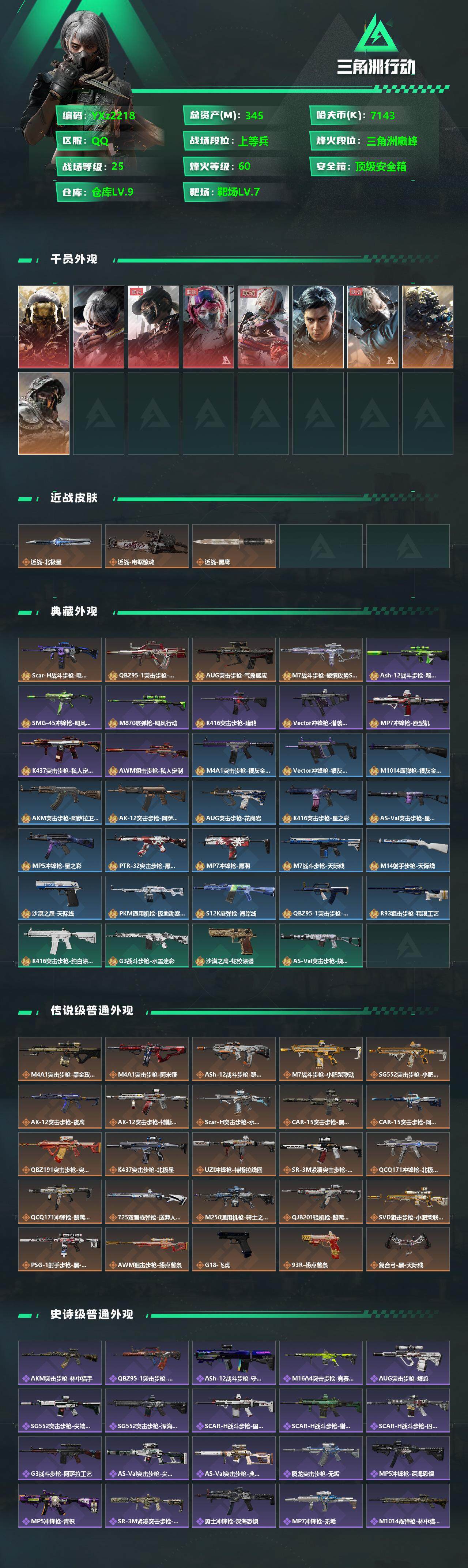 【氪金大佬首选-满红皮+两刀皮+四典藏枪皮-蚀金玫瑰+水墨云图+黑·天际线+午夜邮差+维什戴尔+北极星+电锯惊魂;SCAR-H战斗步枪-电玩高手优品S,QBZ95-1突击步枪-王牌之剑优品B,AUG突击步枪-气象感应优品B,M7战斗步枪-棱镜攻势S2优品B】【Q区三端互通】【无二次】YXz2218-特勤处:仓库9级/靶场7级/训练中心7级-总资产345.3m-哈夫币7143K-烽火等级:60级【