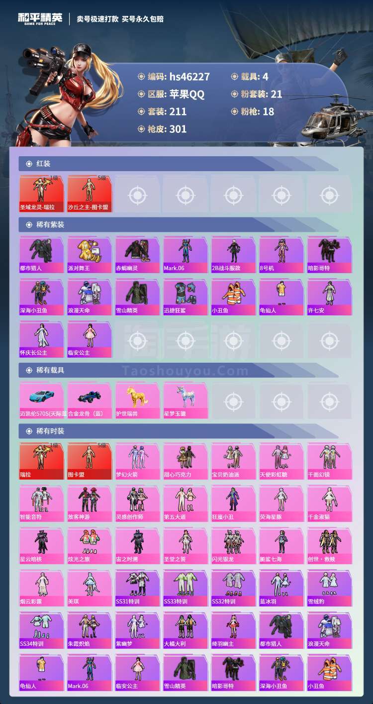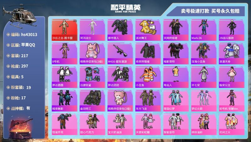 hs46227 苹果手Q-18王牌印记-有战神框-21粉装-18特效枪-4载具-117741热力值-