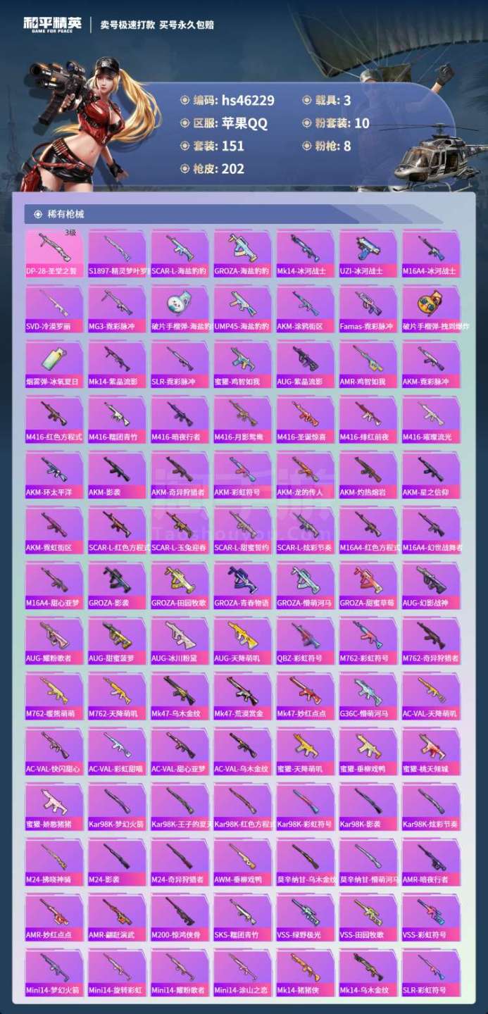 hs46229 苹果手Q-13王牌印记-10粉装-8特效枪-3载具-72465热力值-151套装-