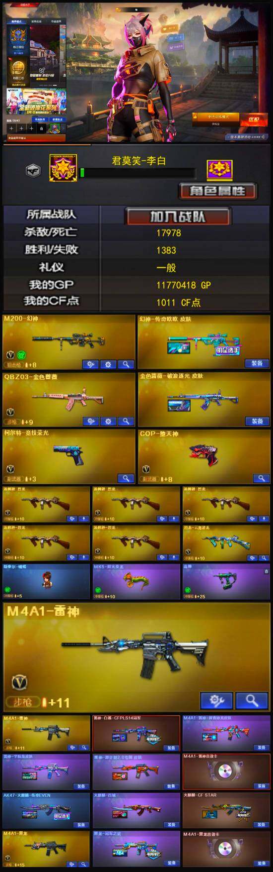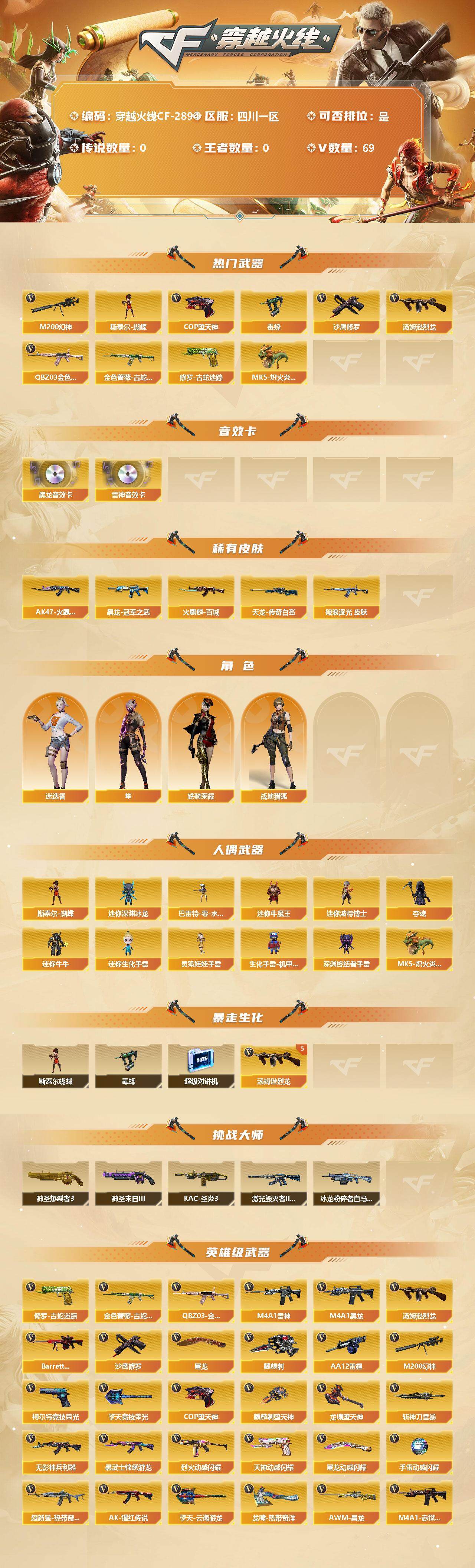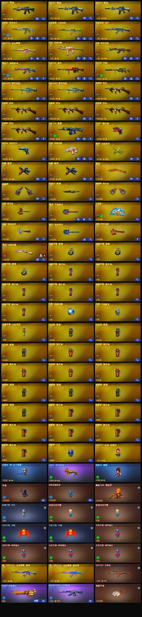 【热门武器】:QBZ03-金色蔷薇,M200-幻神,金色蔷薇-古蛇迷踪,修罗-古蛇迷踪,毒蜂,汤姆逊-烈龙*5,斯泰尔-蝴蝶,MK5-炽火炎龙,COP-堕天神,沙鹰-修罗*2