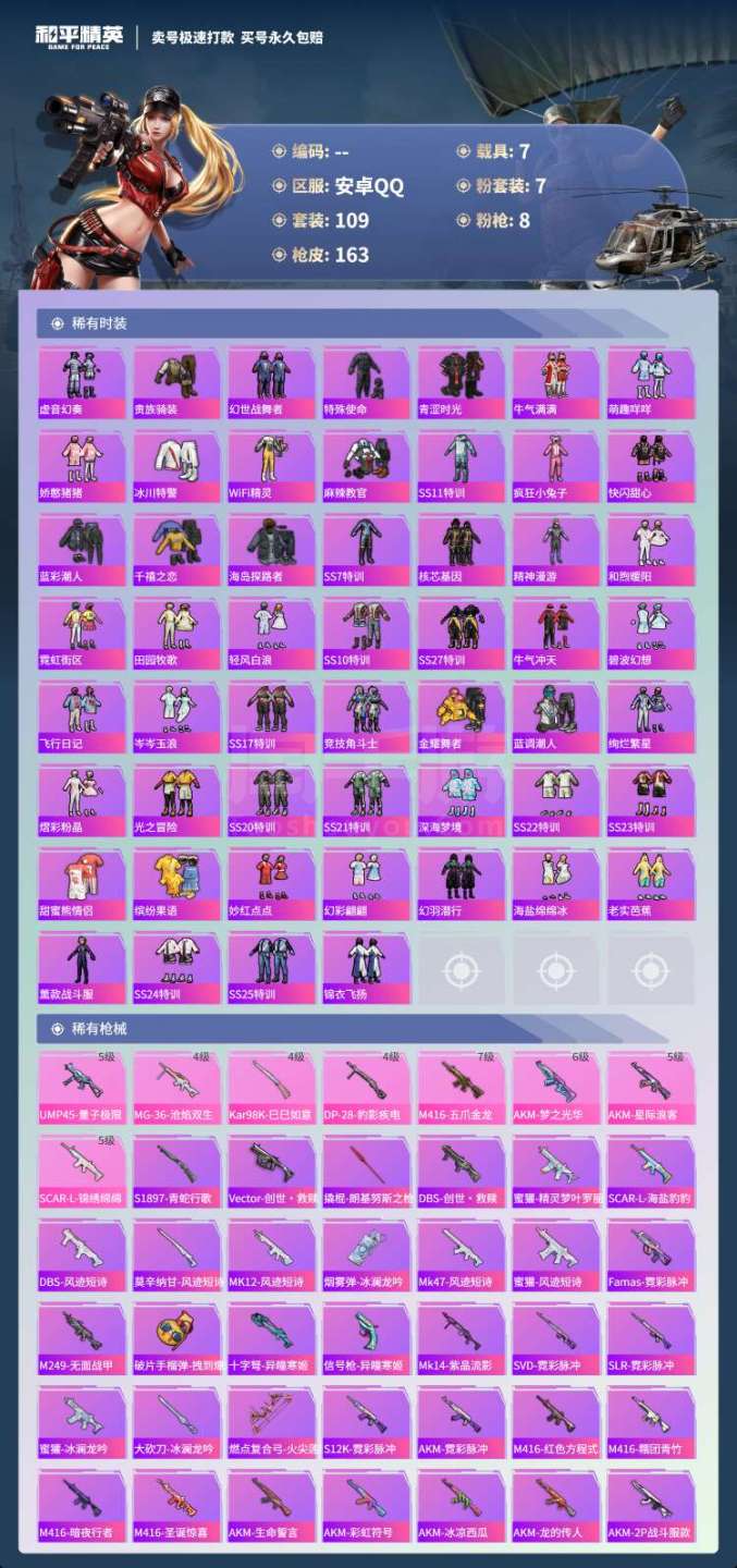 hs46193 安卓手Q-9王牌印记-7粉装-8特效枪-7载具-56863热力值-109套装-163