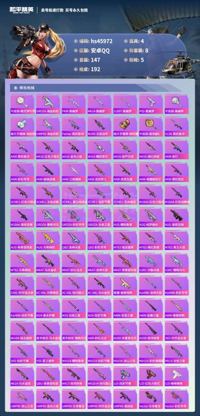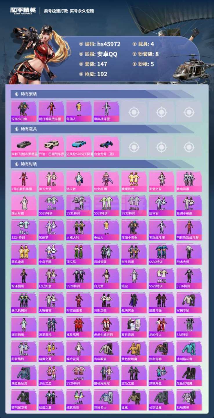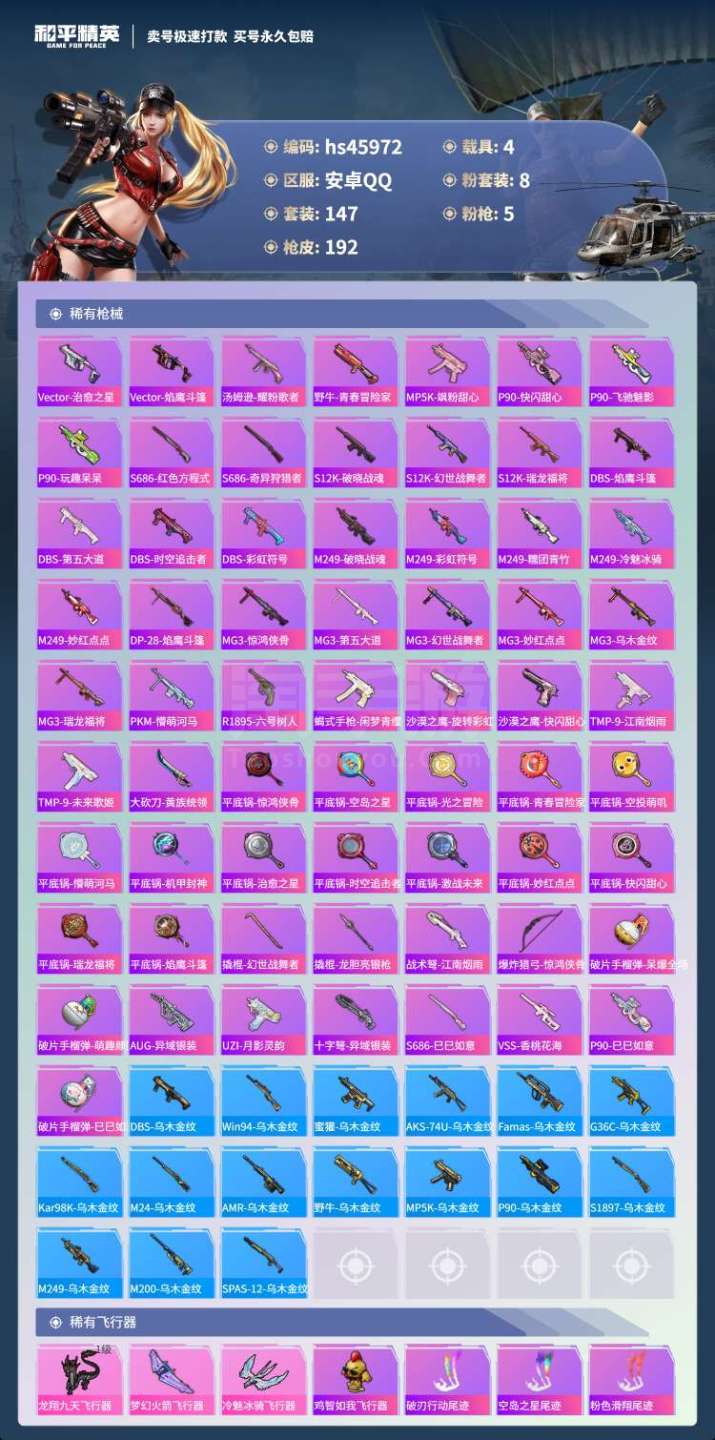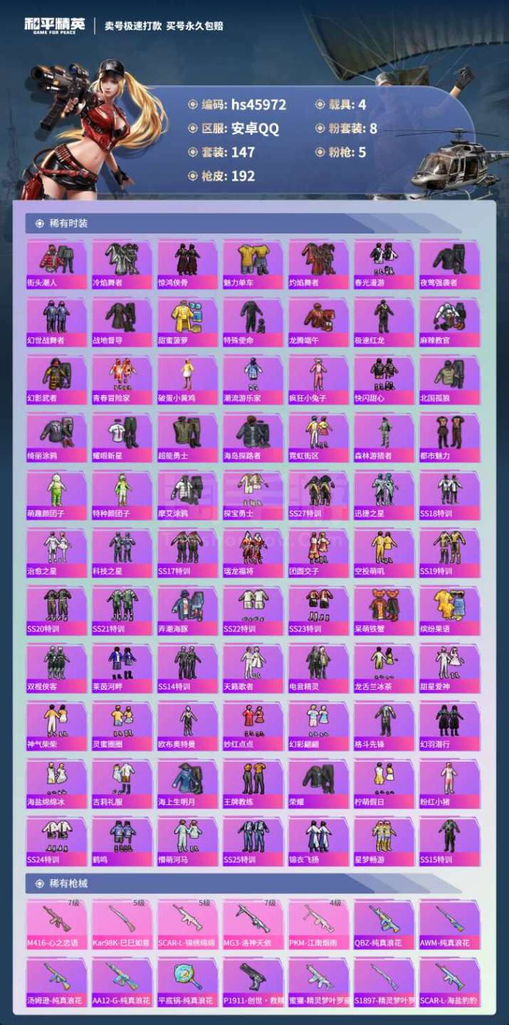 和平精英【安卓QQ】hs45972 安卓手Q-17王牌印记-8粉装-5特效枪-4载具-64428热力值-147套装-19