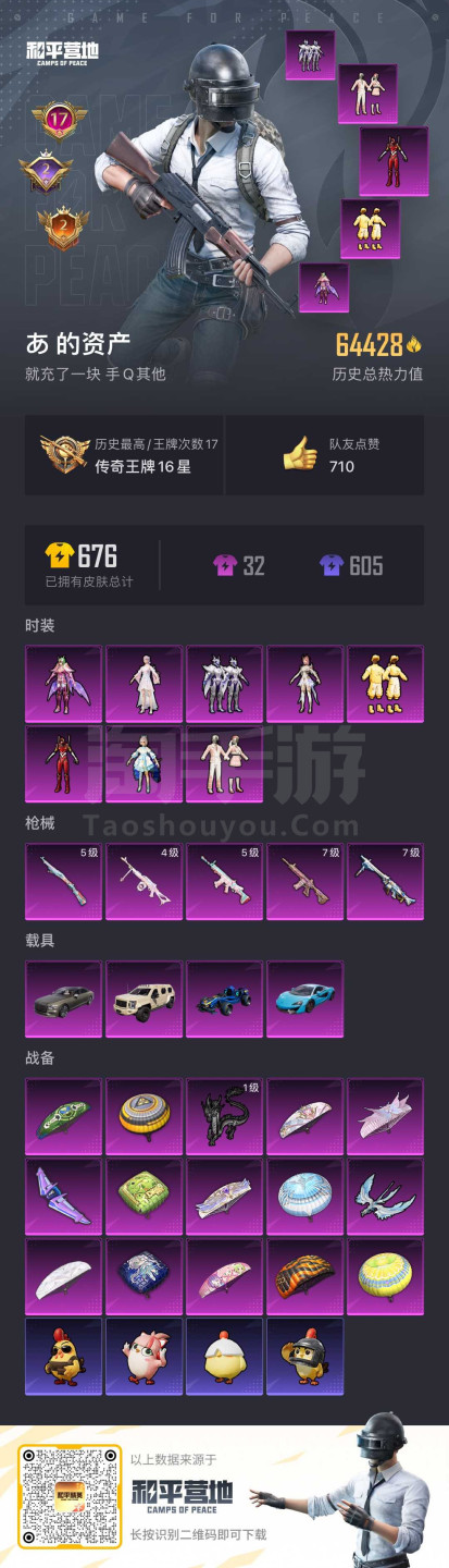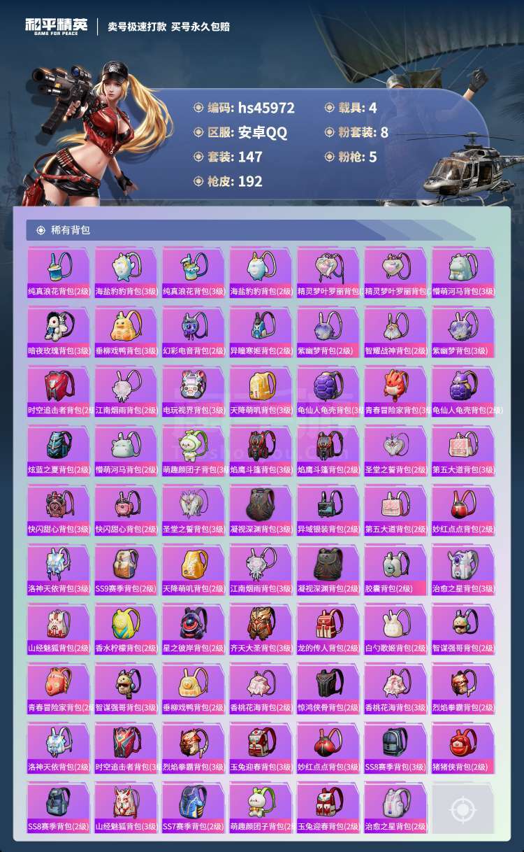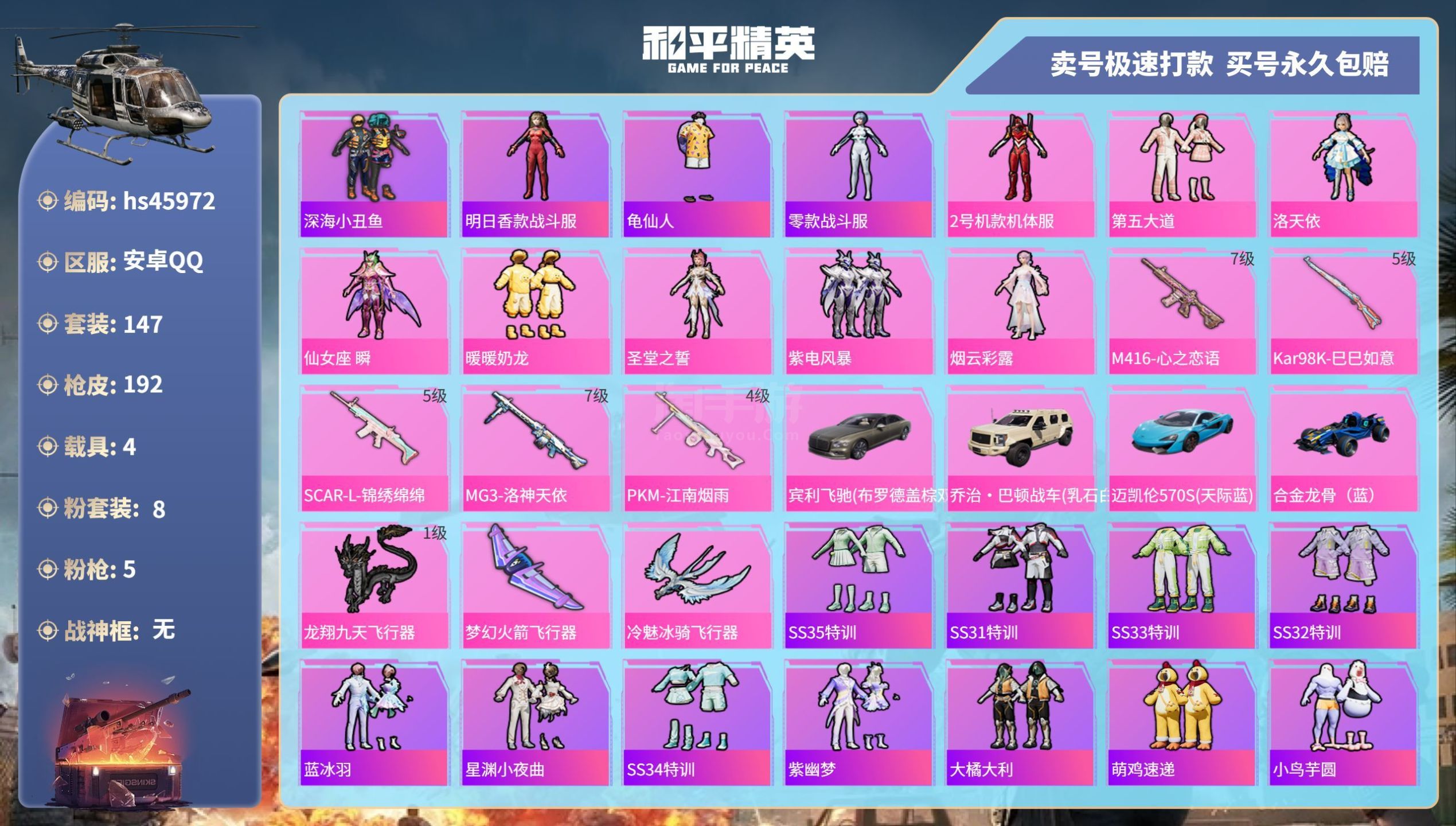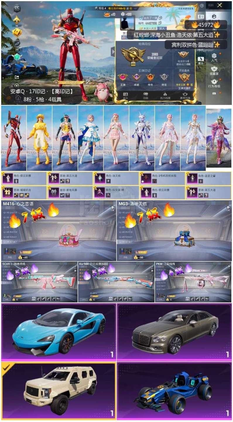 和平精英【安卓QQ】hs45972 安卓手Q-17王牌印记-8粉装-5特效枪-4载具-64428热力值-147套装-19