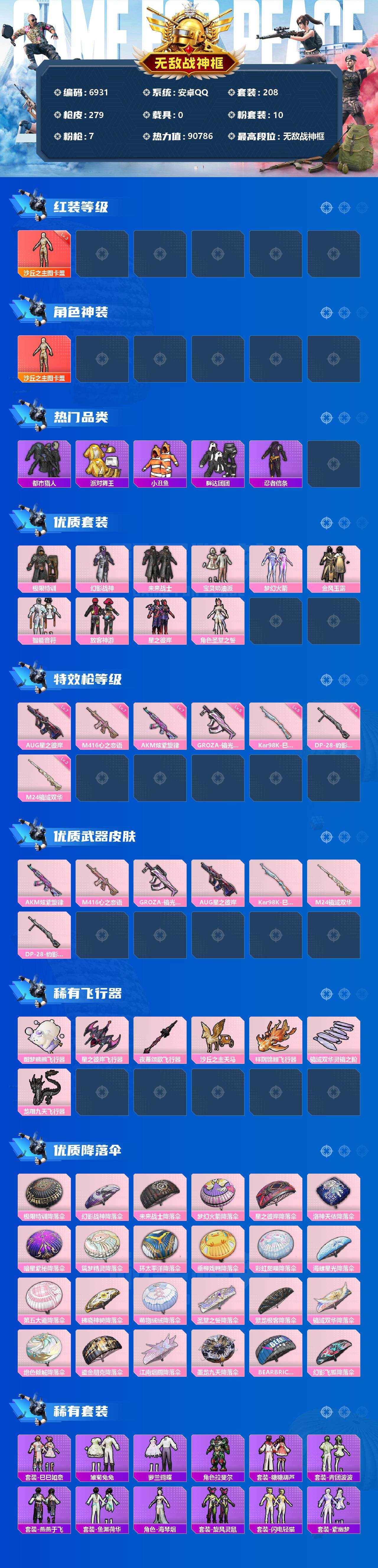 【6931】安卓 手Q-无敌战神框-1神装-10粉装-7特效枪-0载具-9粉色飞行器-90786热力值-18王牌印记-208套装-279枪皮