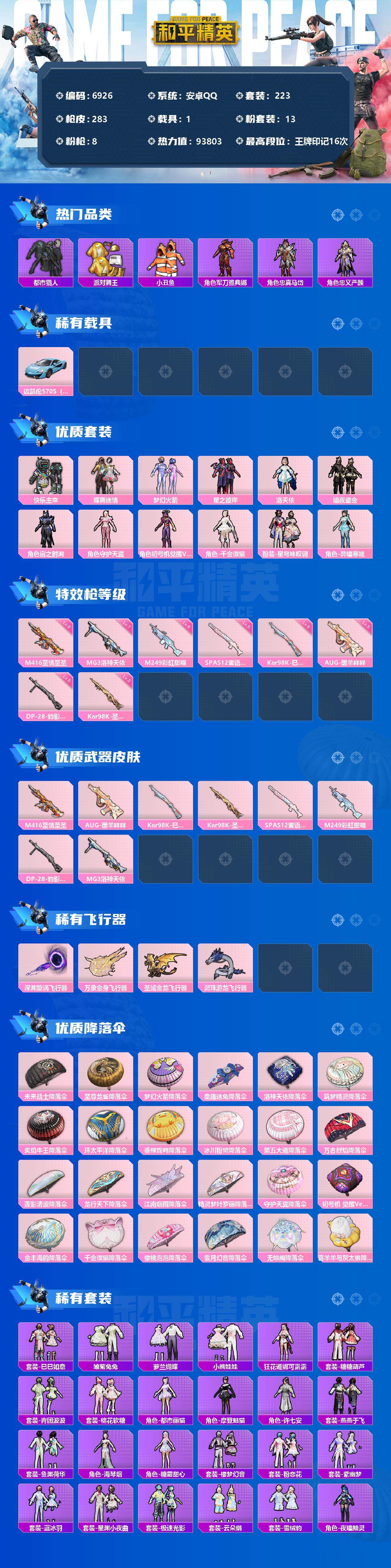 【6926】安卓 手Q-13粉装-8特效枪-1载具-4粉色飞行器-93803热力值-16王牌印记-223套装-283枪皮