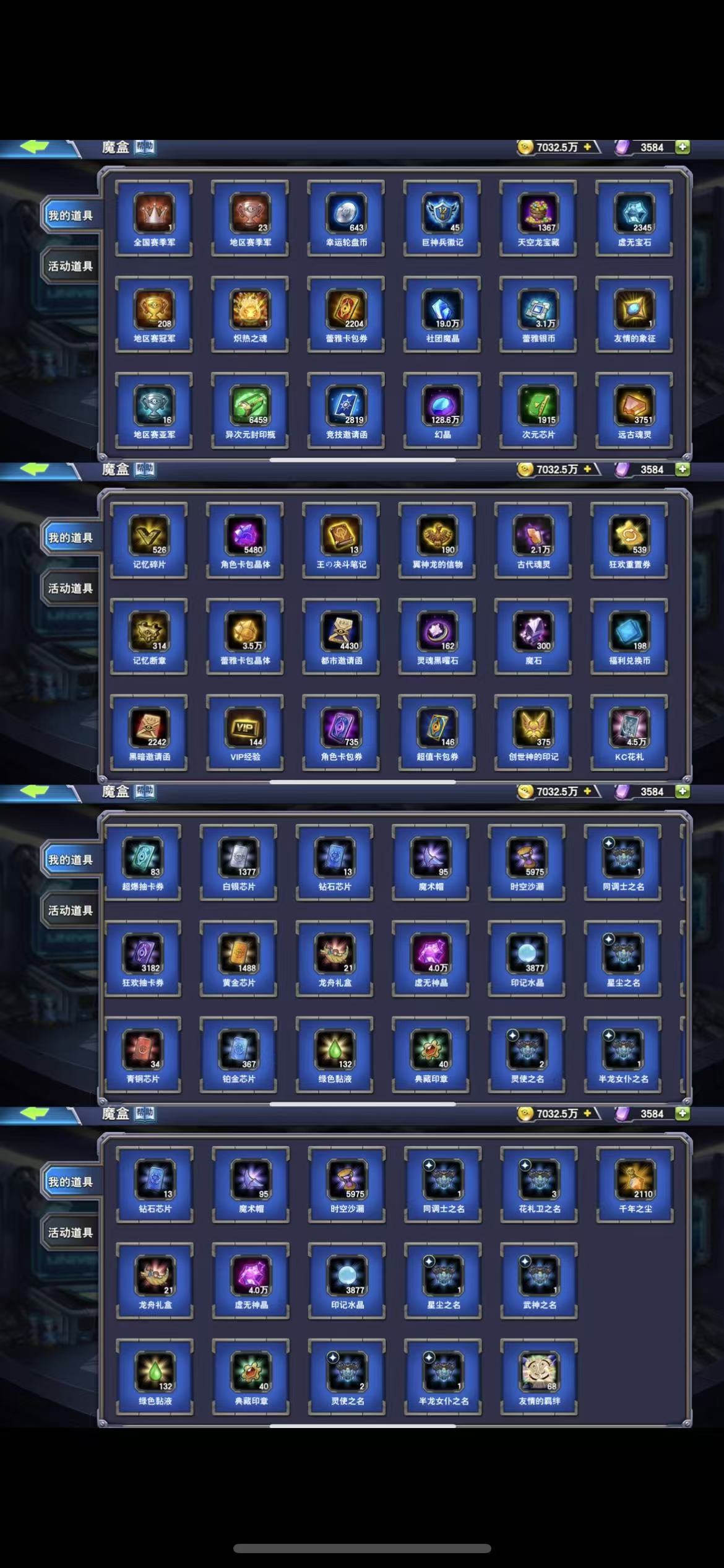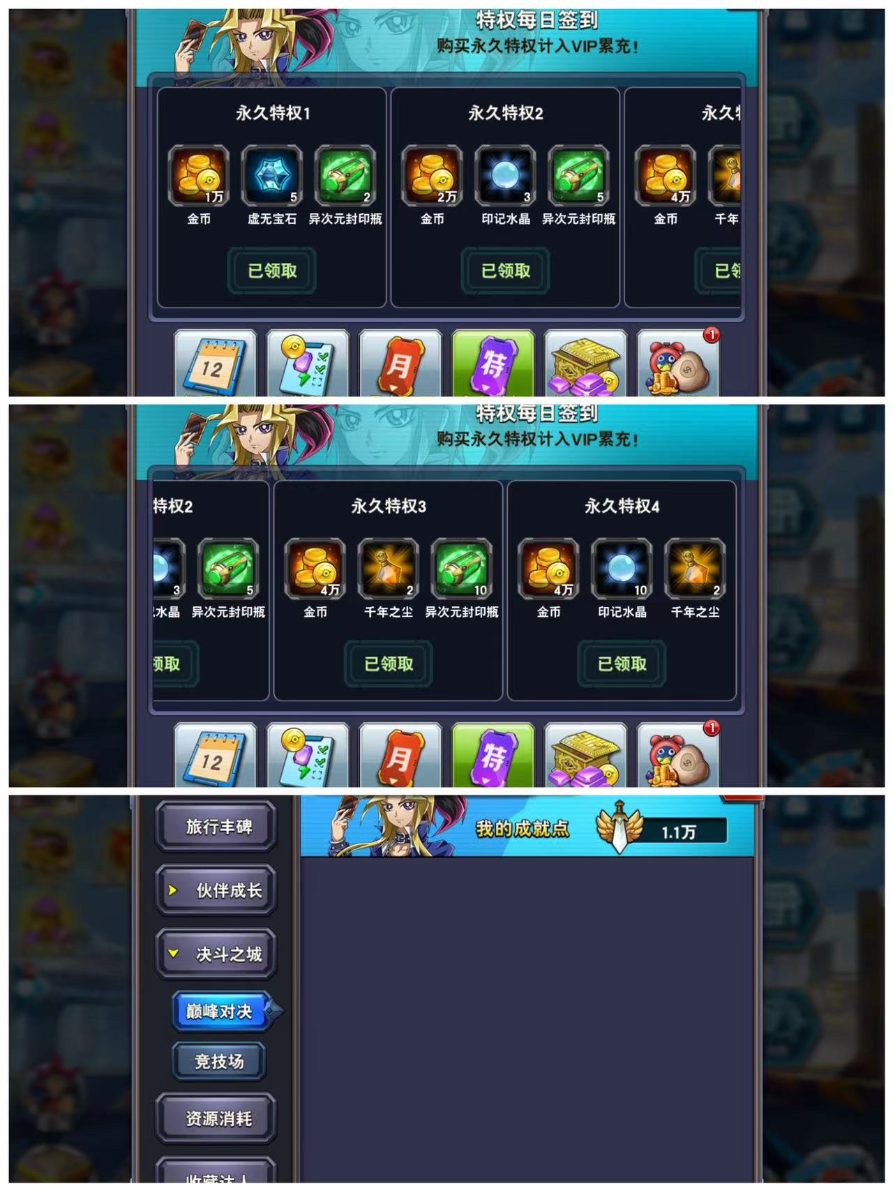 四特权,满档贴贴三国,枪管2前托。转生,黑魔导,白龙,英雄,白神DD,超重,3DD3灵使2万圣半龙同调星尘,7000万金币,2.1万古代,146超值劵,4万神晶,3877水晶,2110尘,1.1万成就