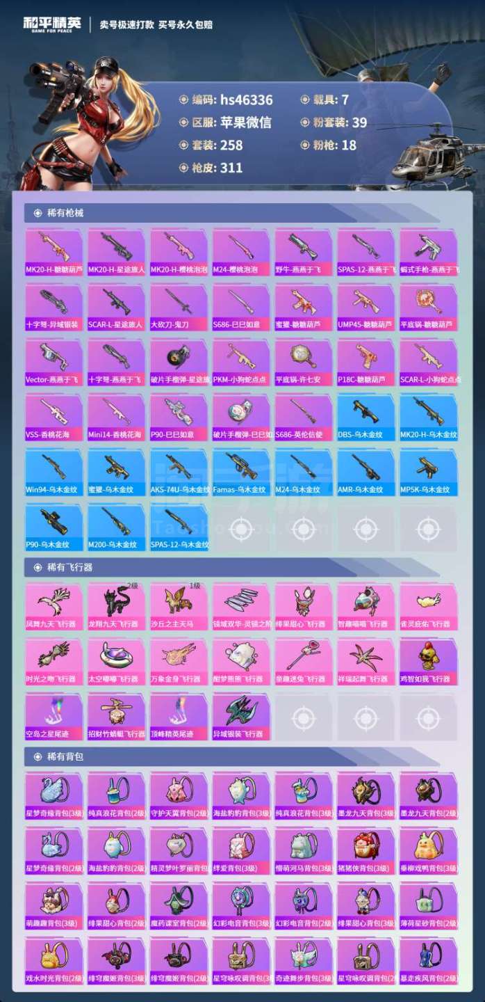 hs46336 苹果微-13王牌印记-有战神框-39粉装-18特效枪-7载具-125744热力值-