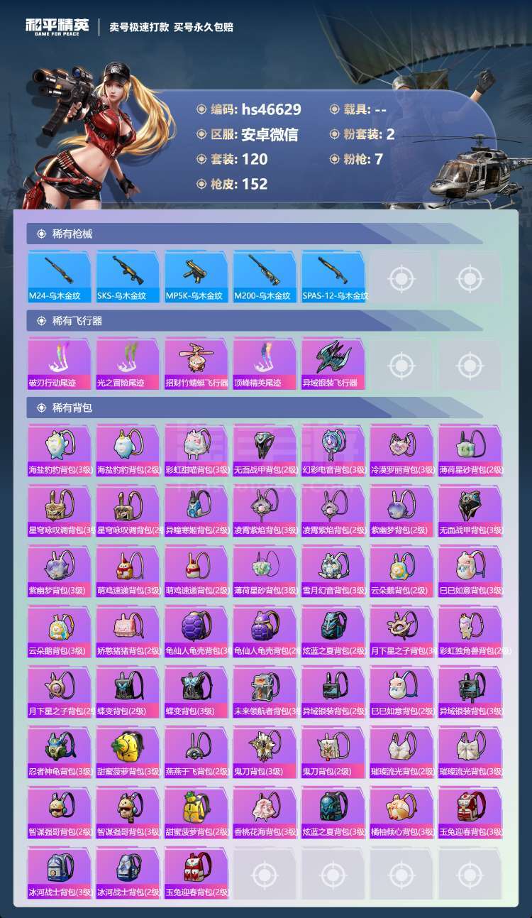 hs46629 安卓v-8王牌印记-2粉装-7特效枪-0载具-46096热力值-120套装-152